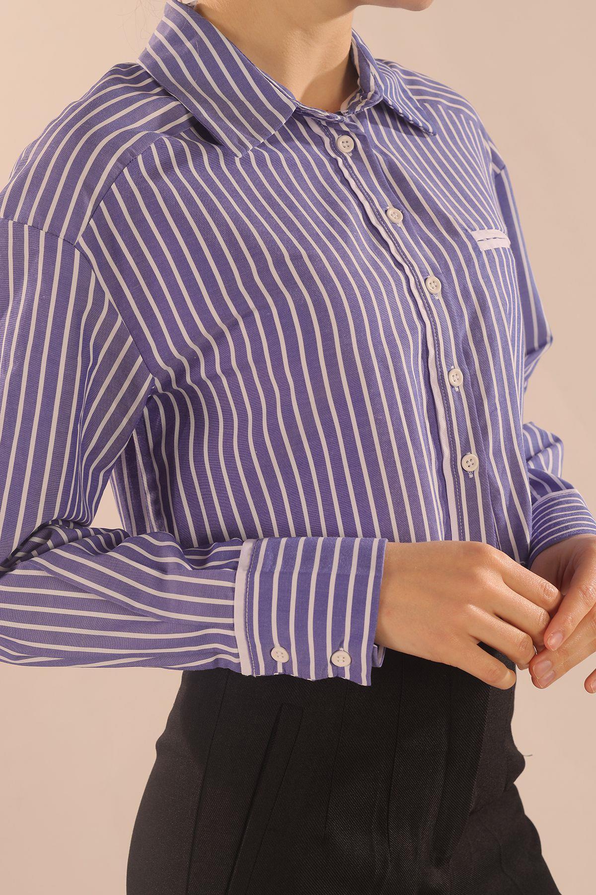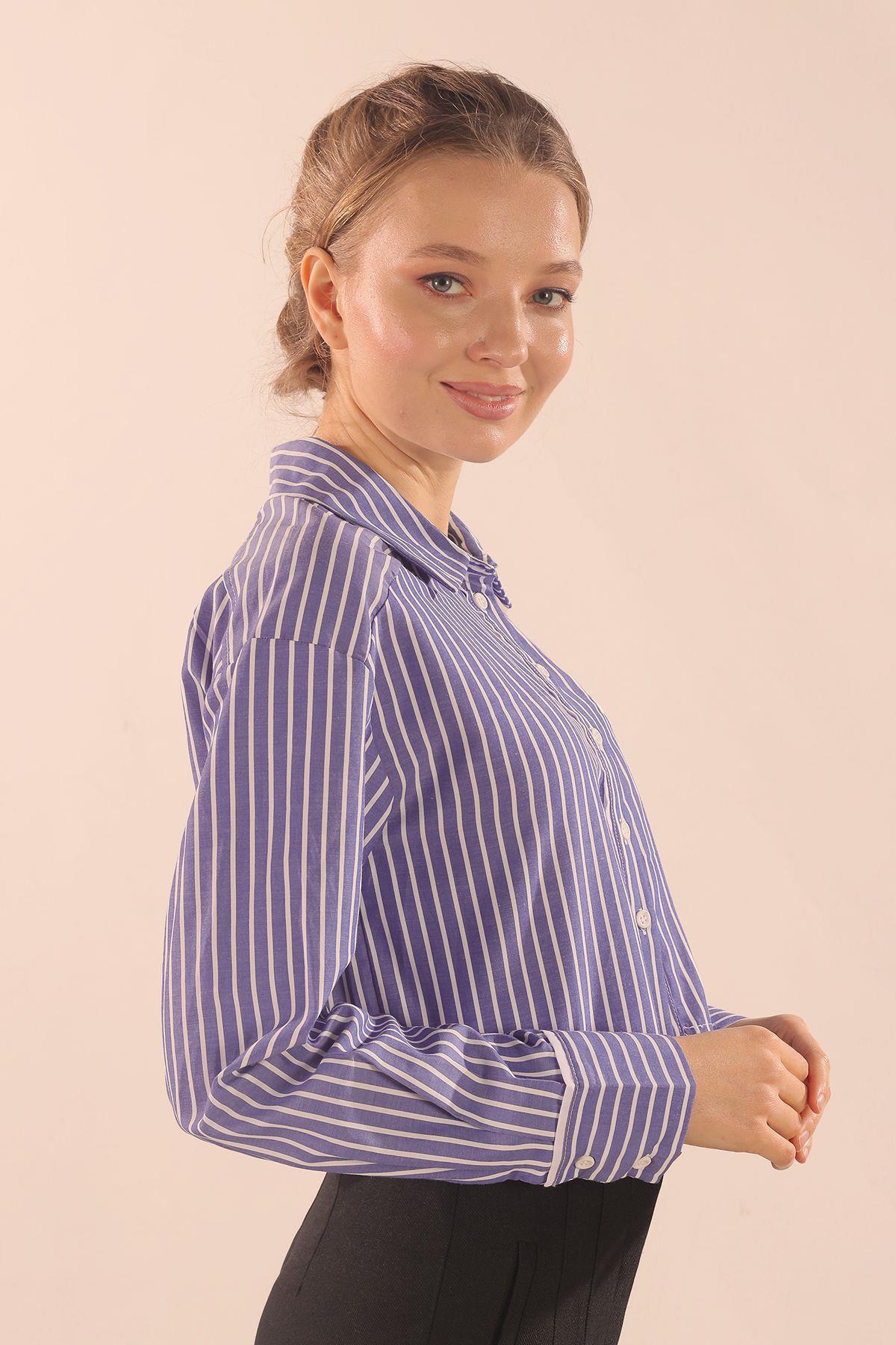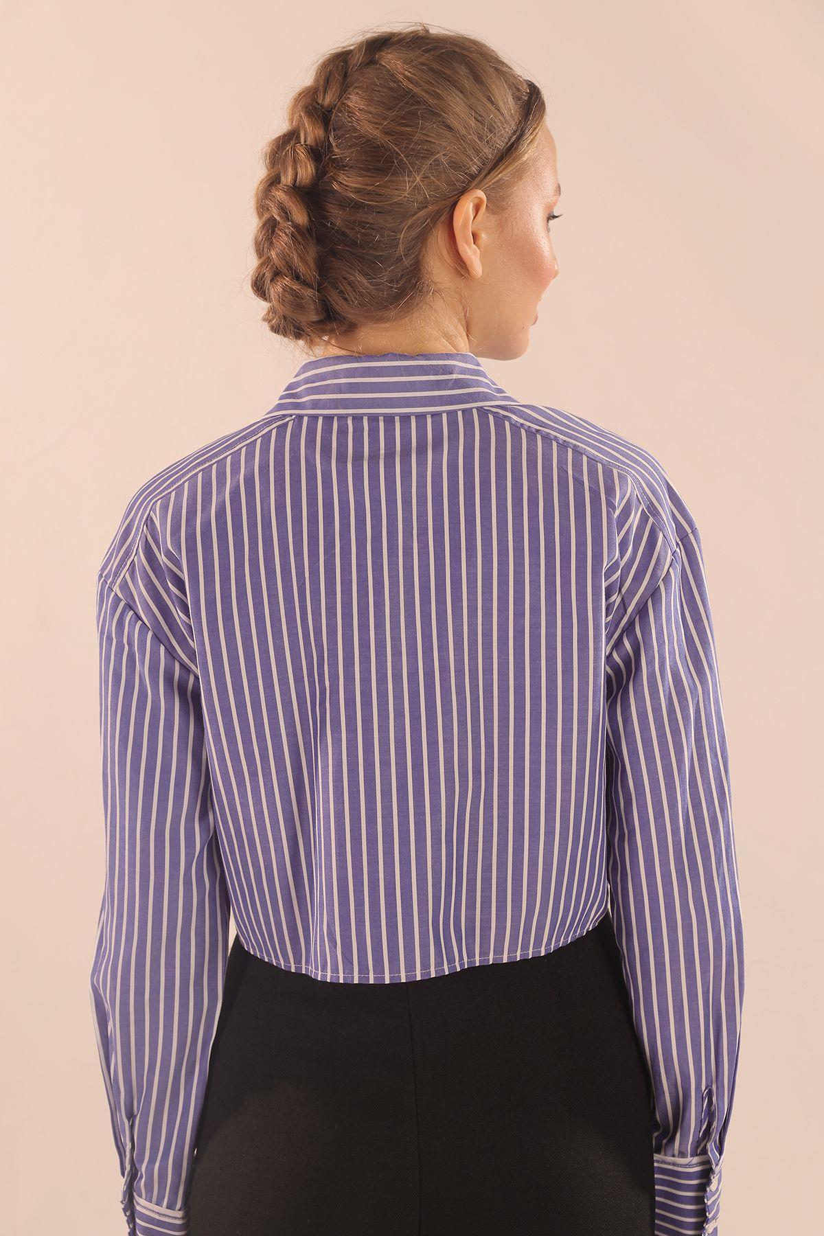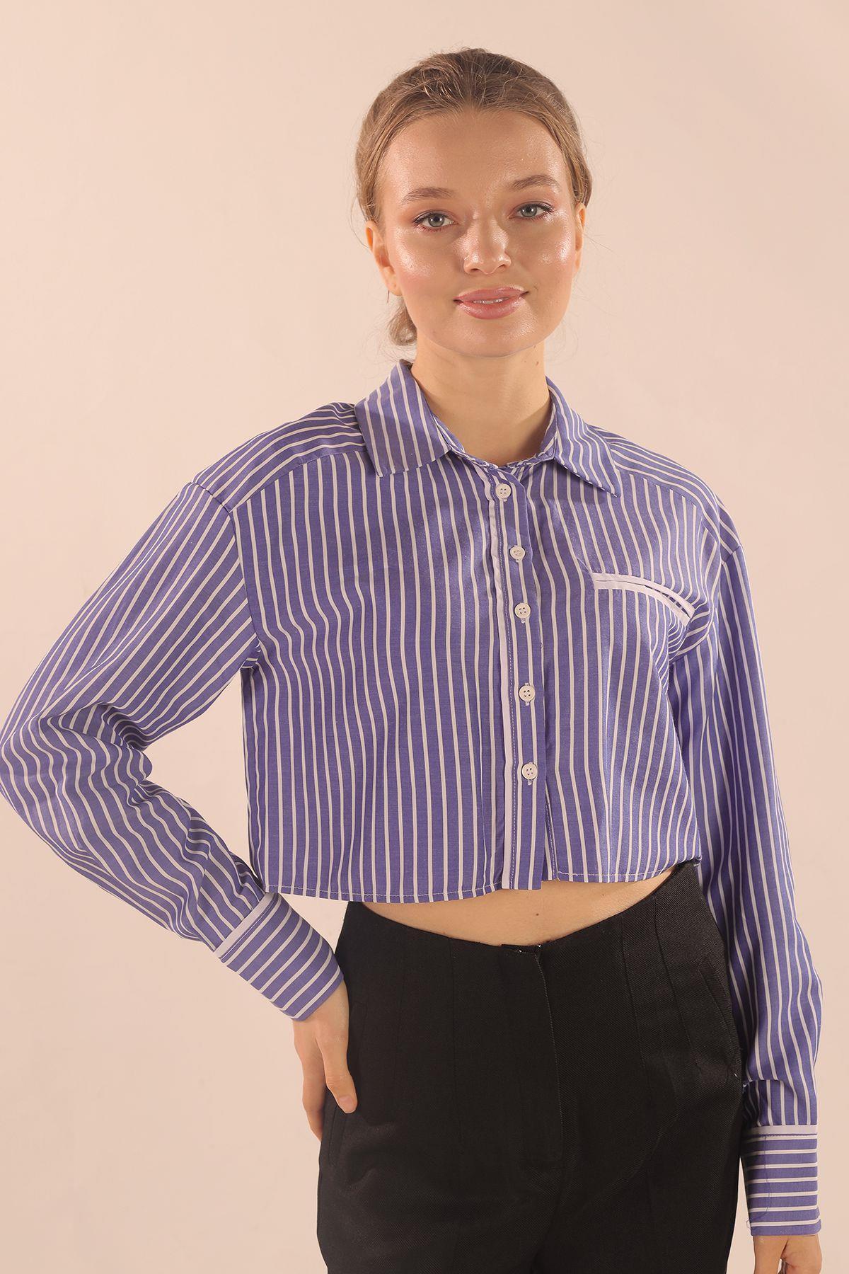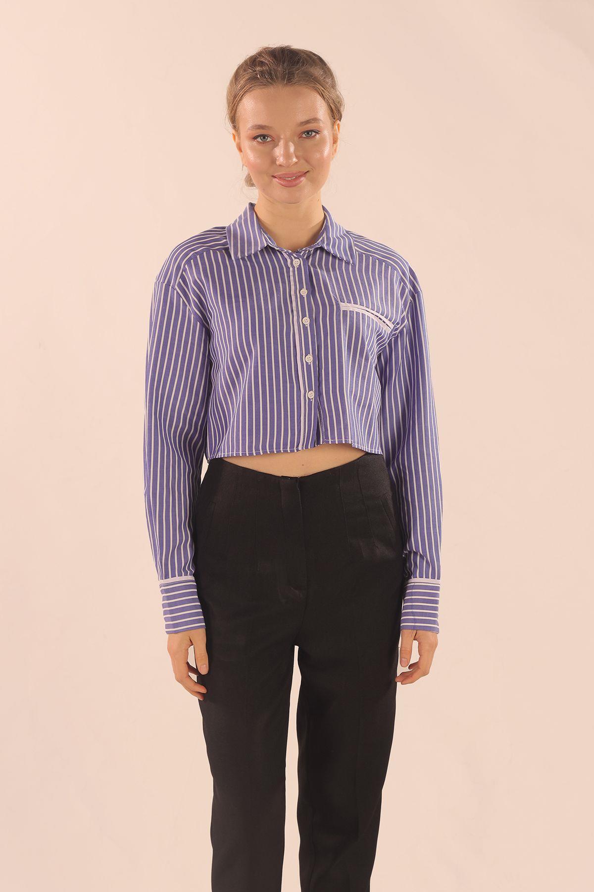 Koyu Mavi Çizgili Cepli Crop Gömlek 00213
