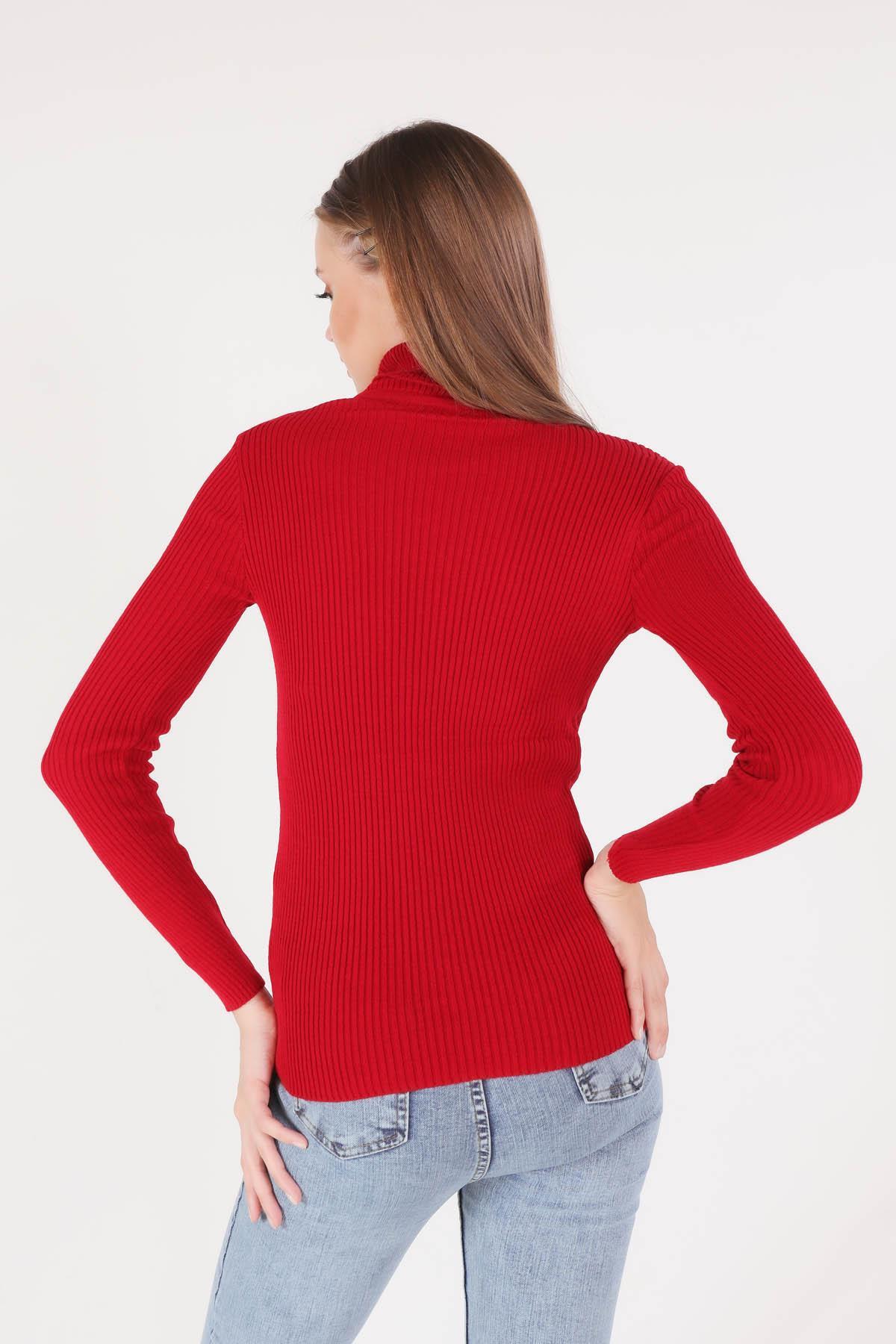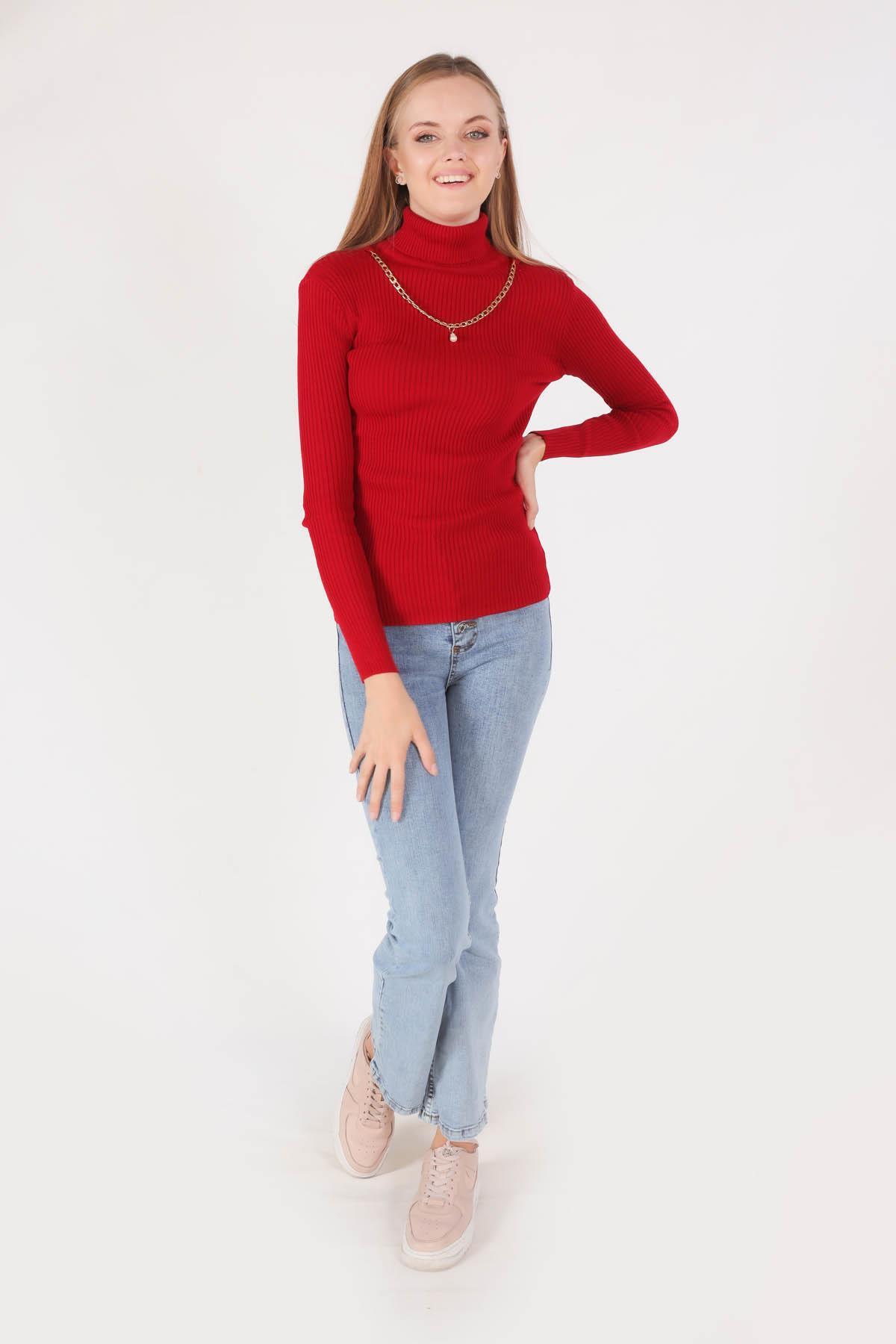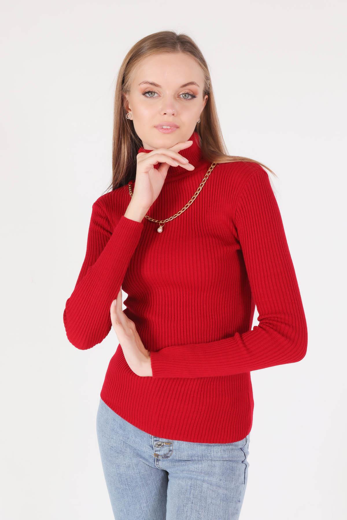 Kırmızı Balıkçı Yaka Kolye Detay Kazak 009