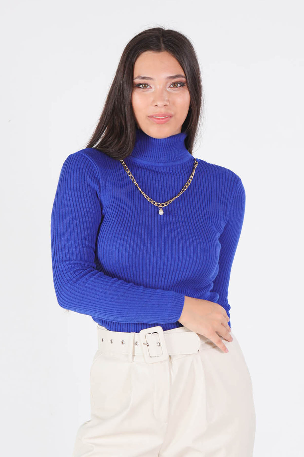 009 Balıkçı Yaka Kolye Detay Kazak Saks