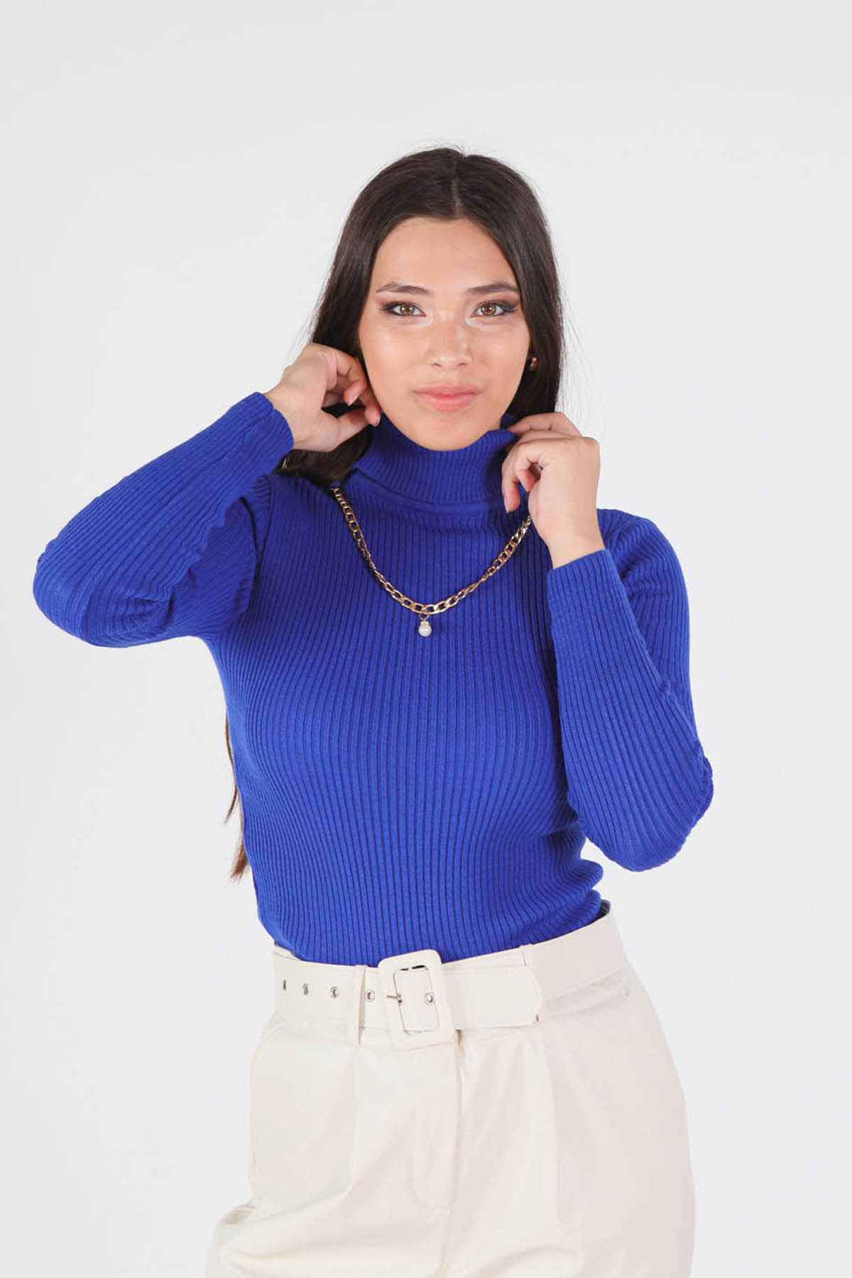Saks Balıkçı Yaka Kolye Detay Kazak 009
