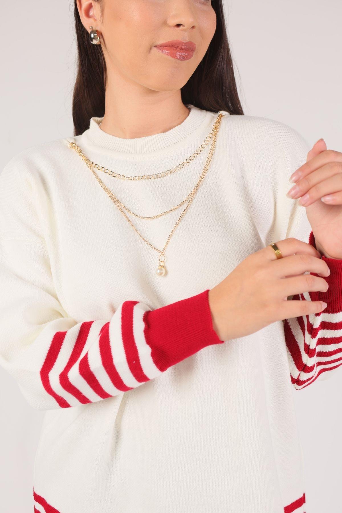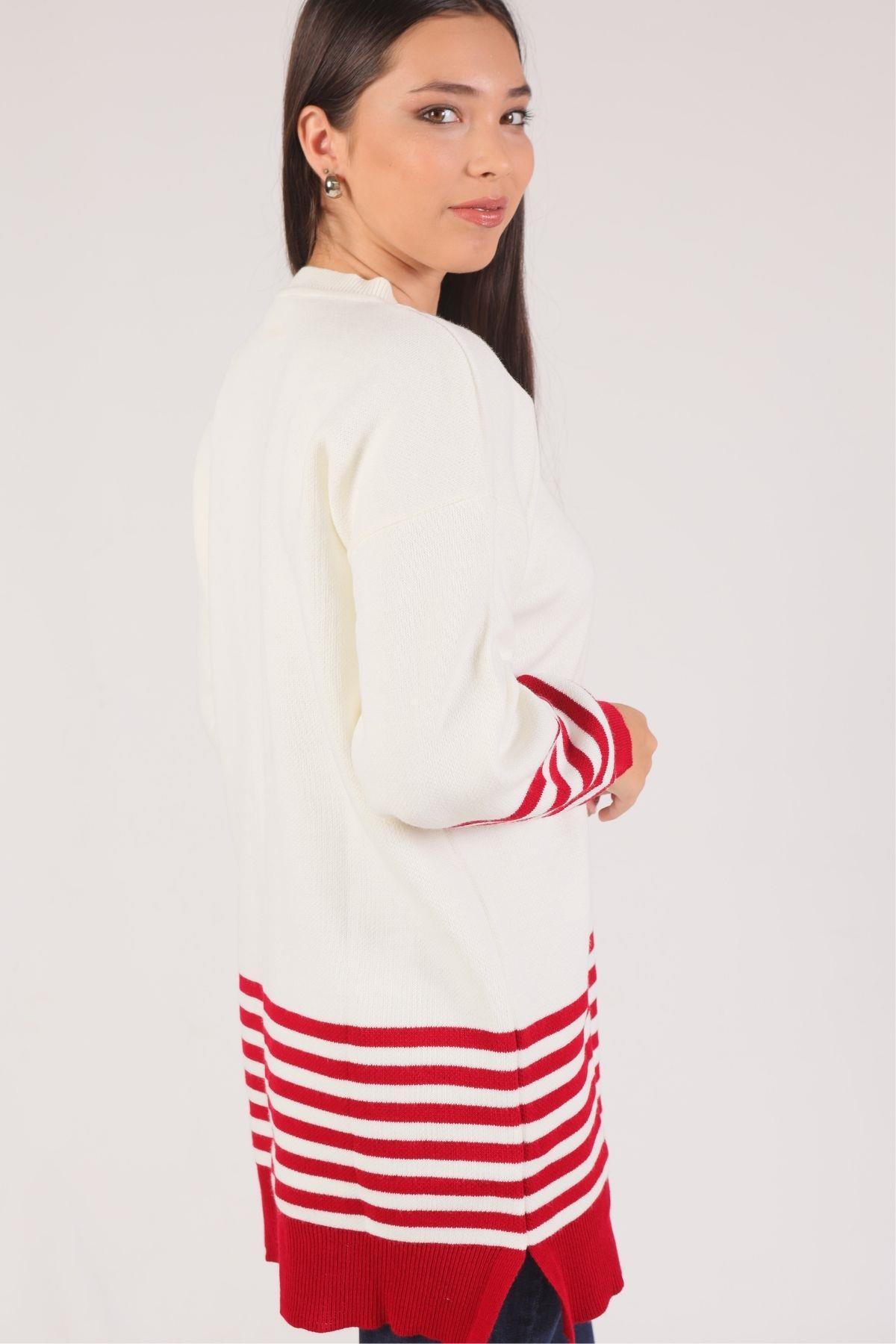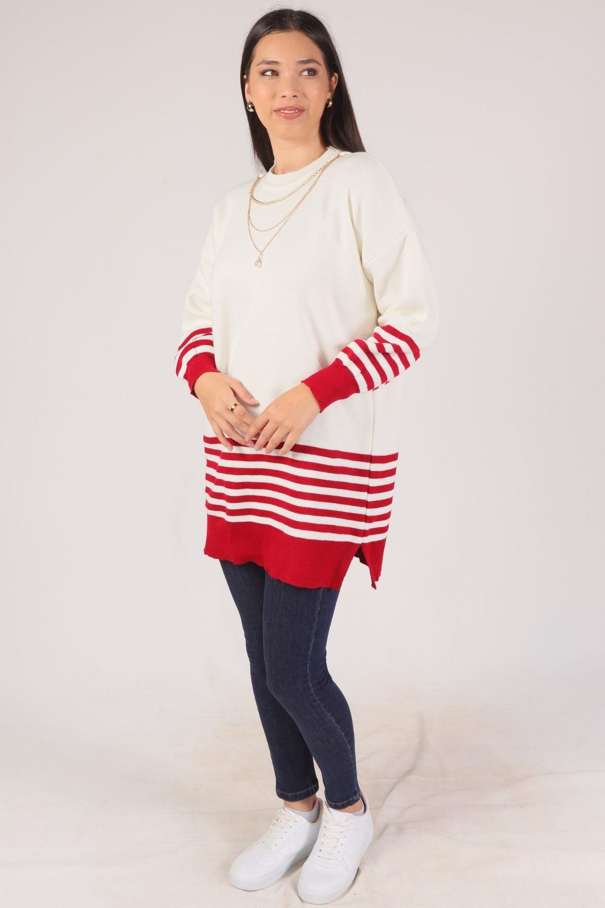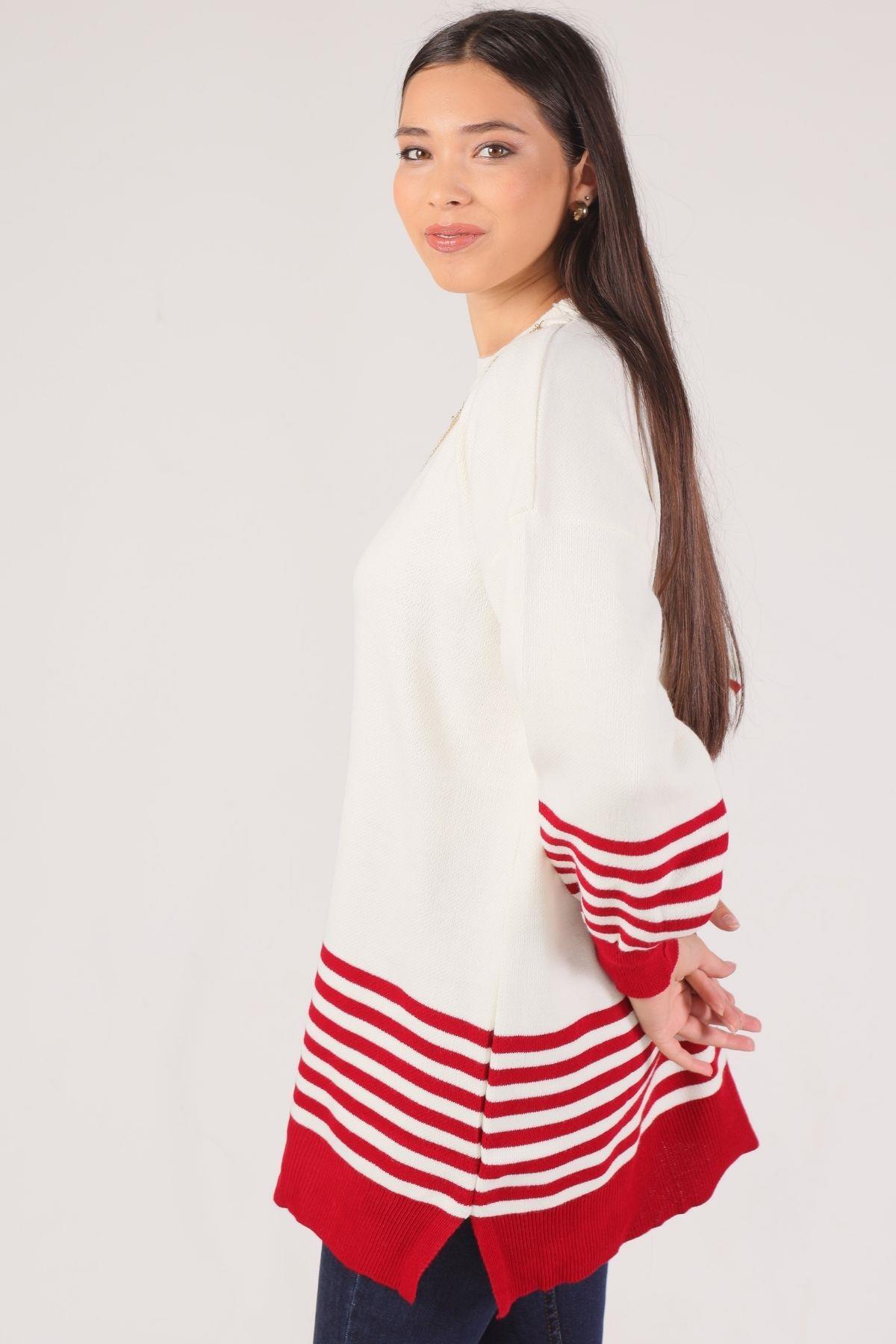 Kırmızı Kol Etek Çizgi Detay Kazak 014