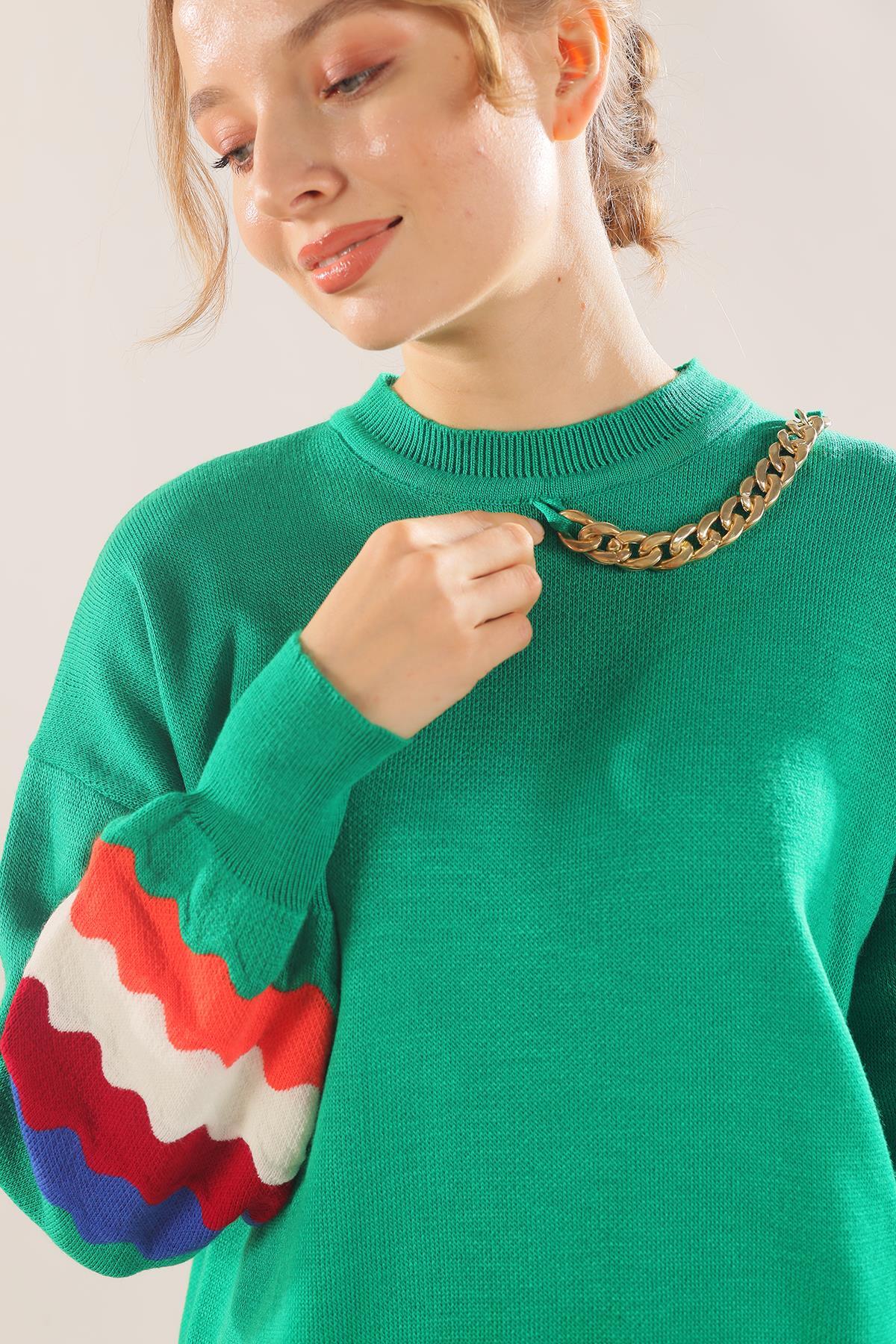 Benetton Yeşili Kolye Detay Kol Renkli Kazak 090