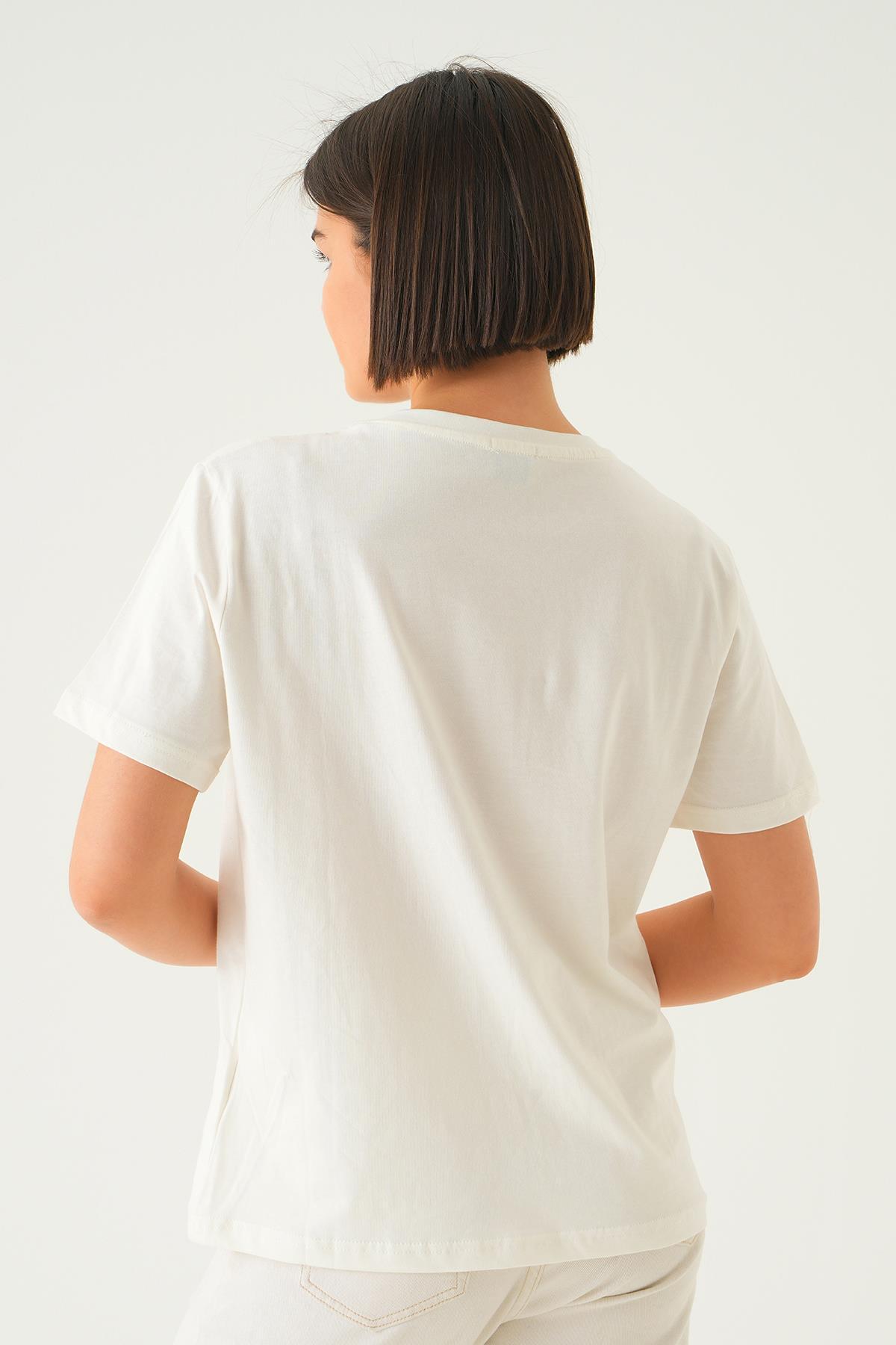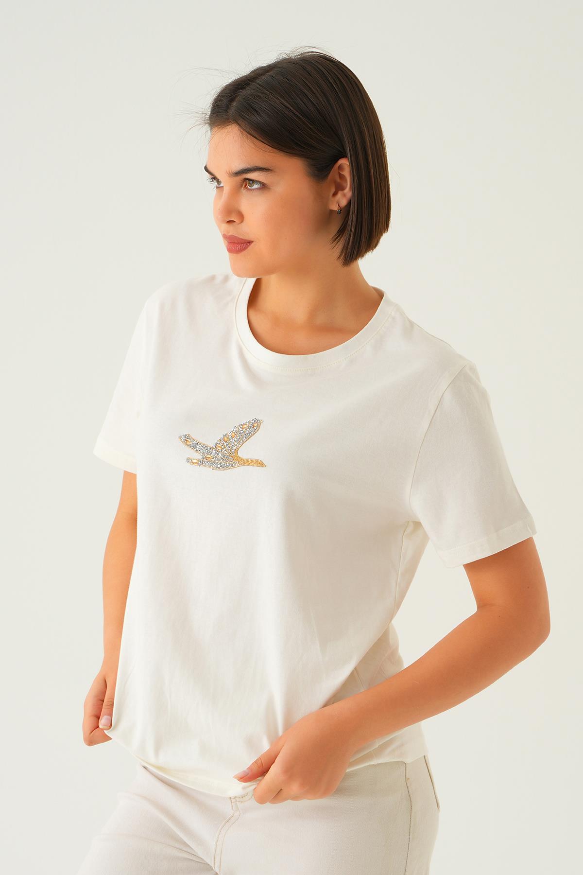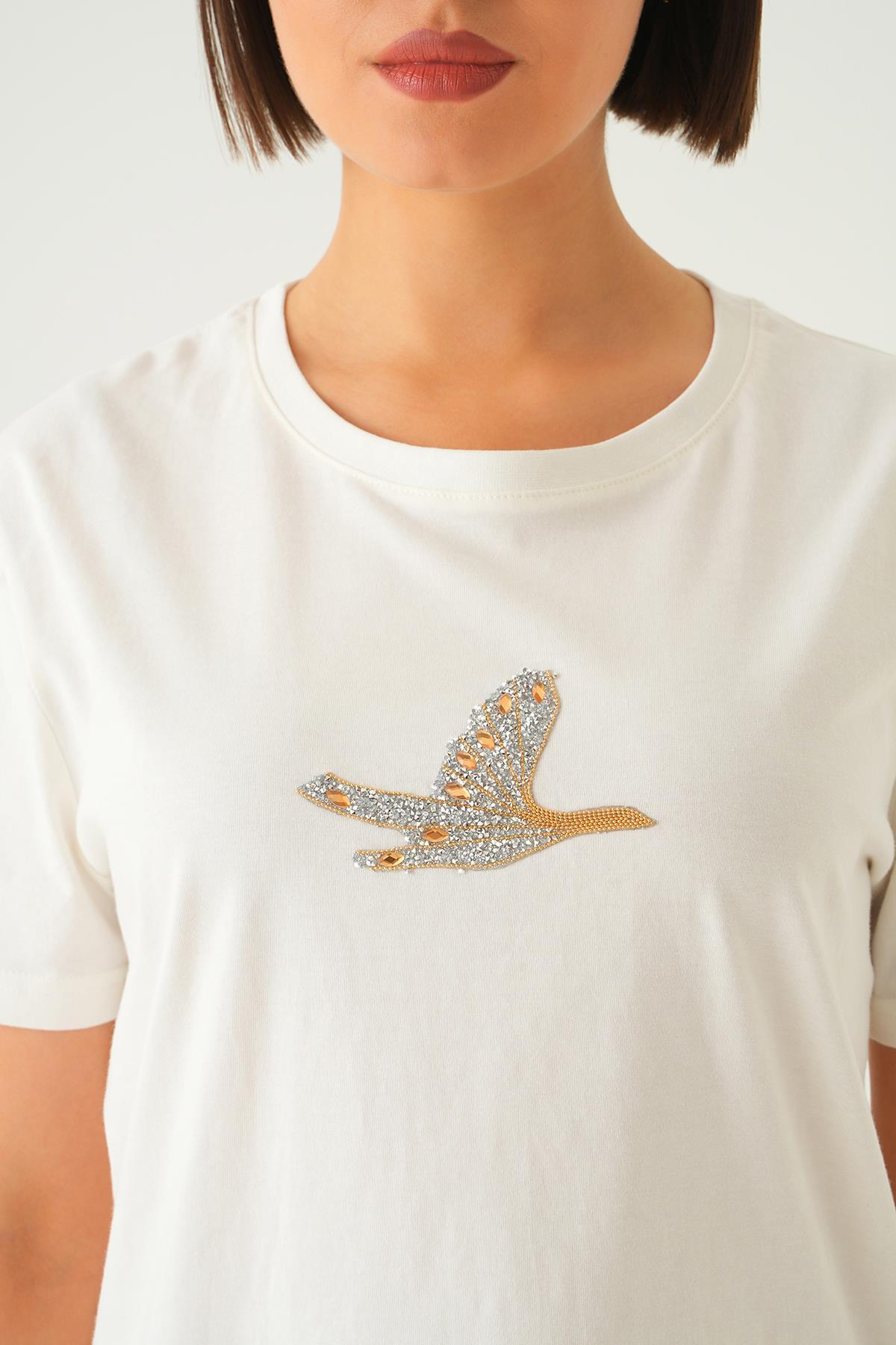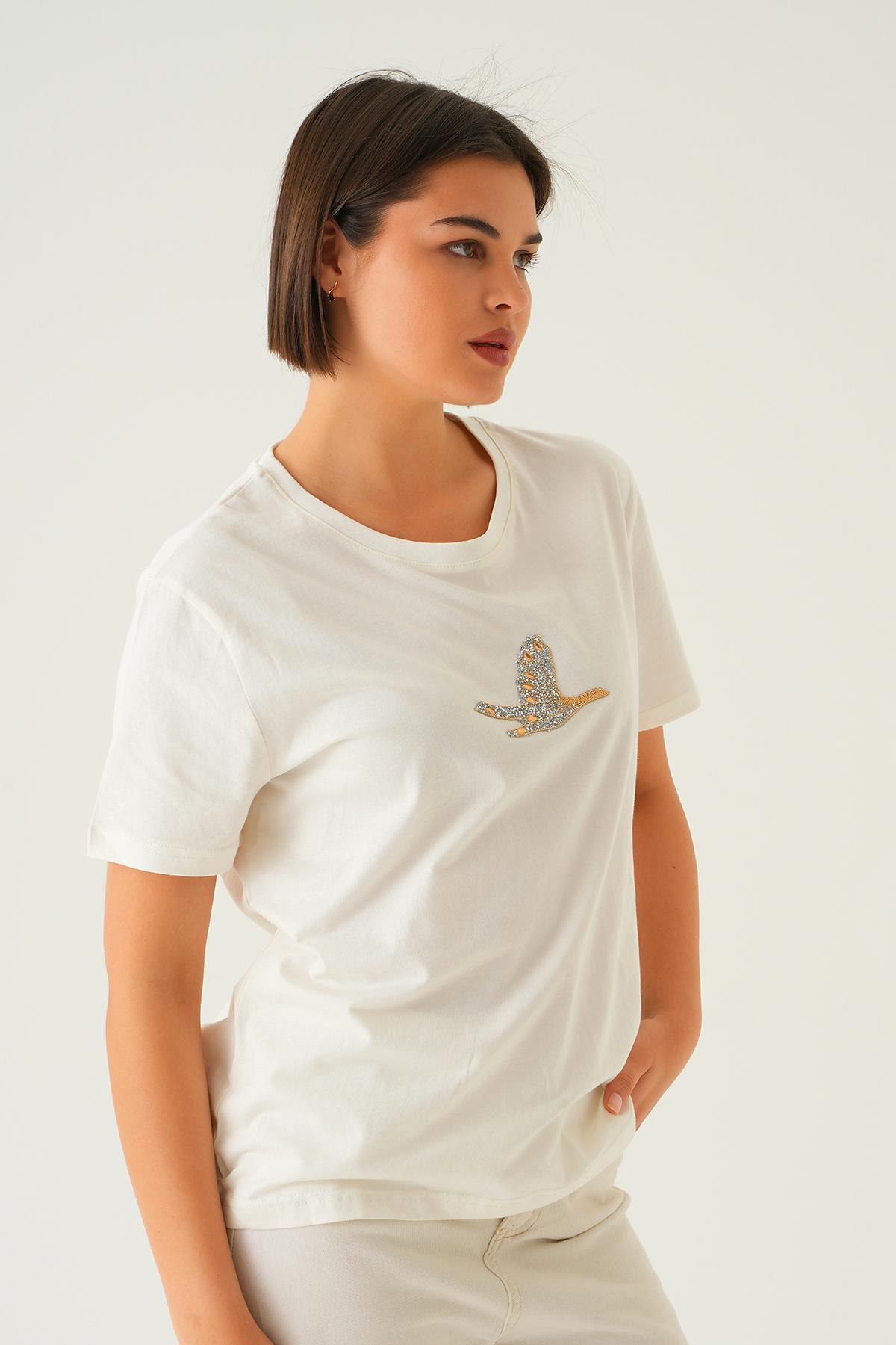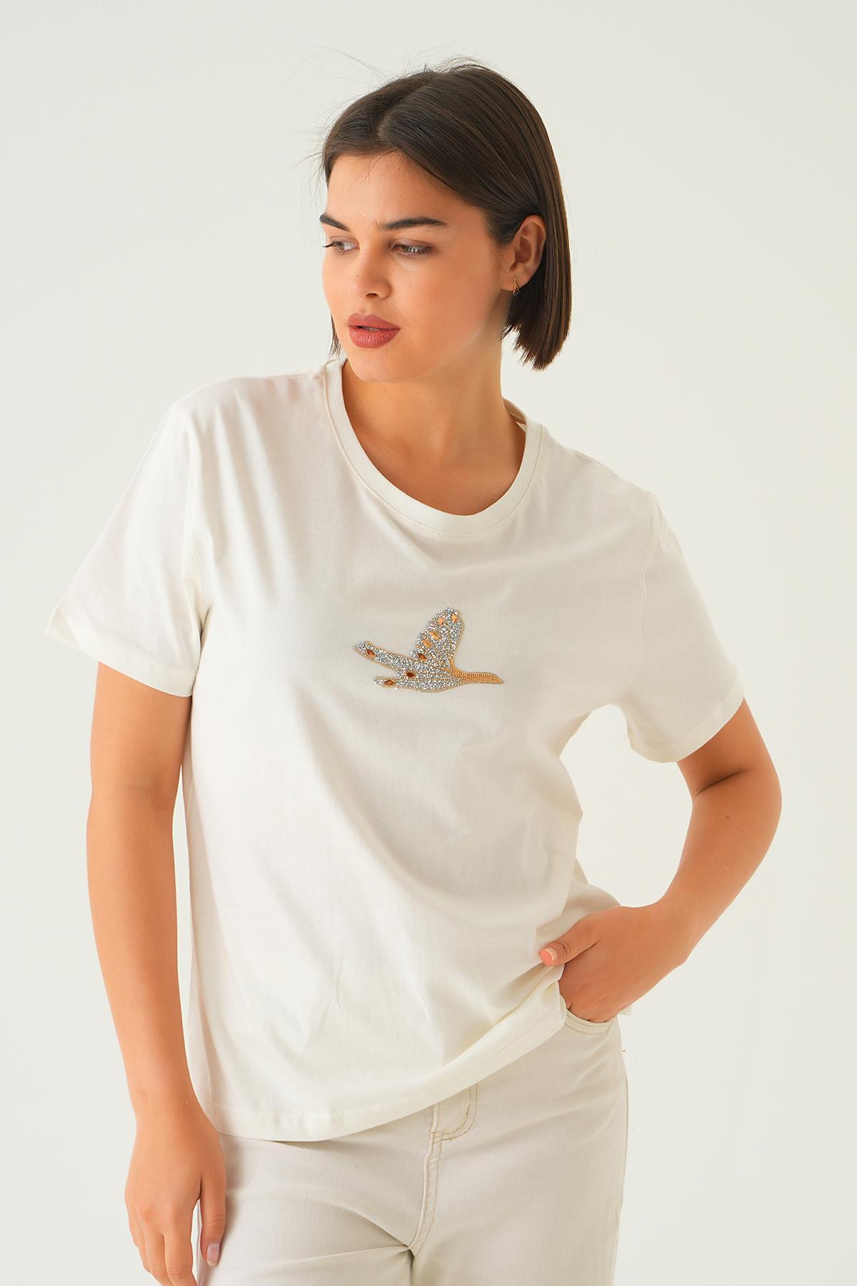 Beyaz Kuş Nakış Detay Tişört 1007