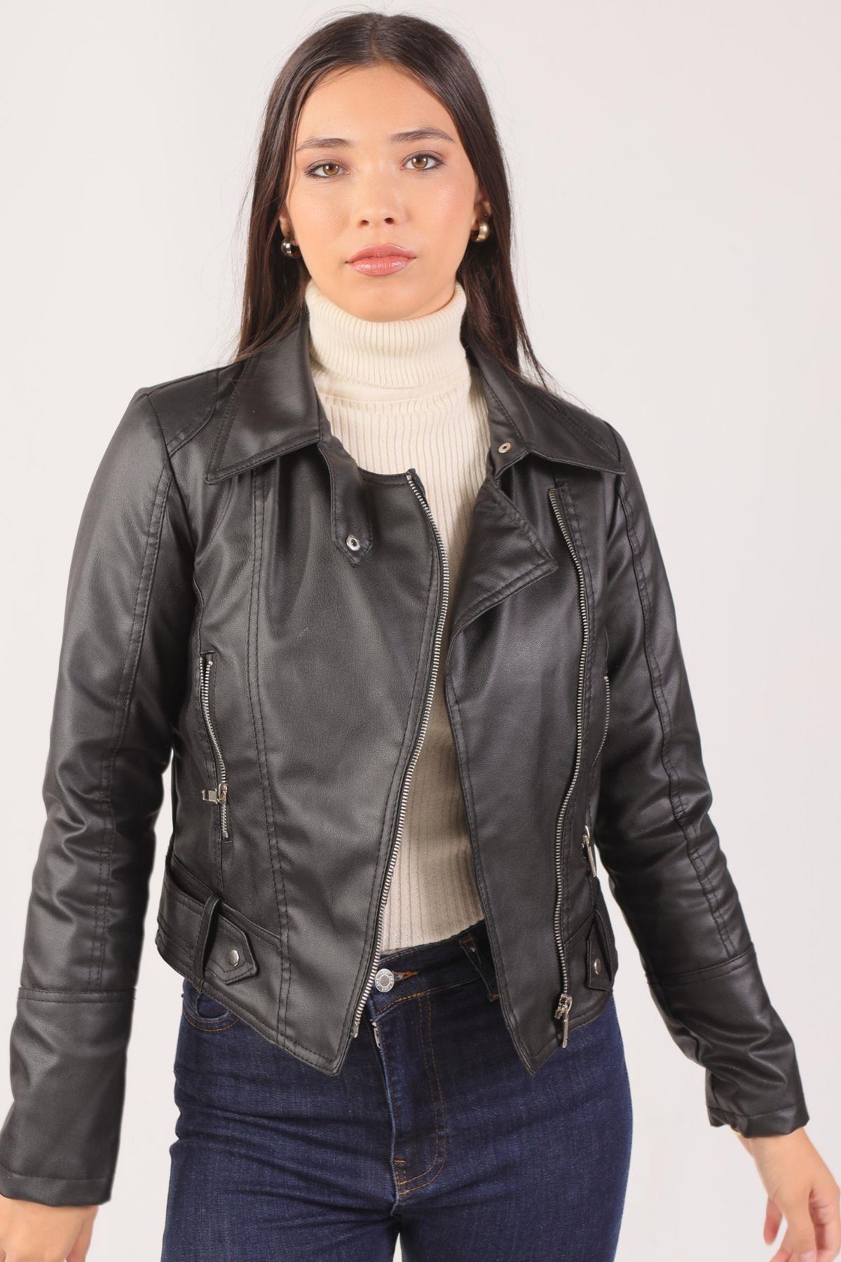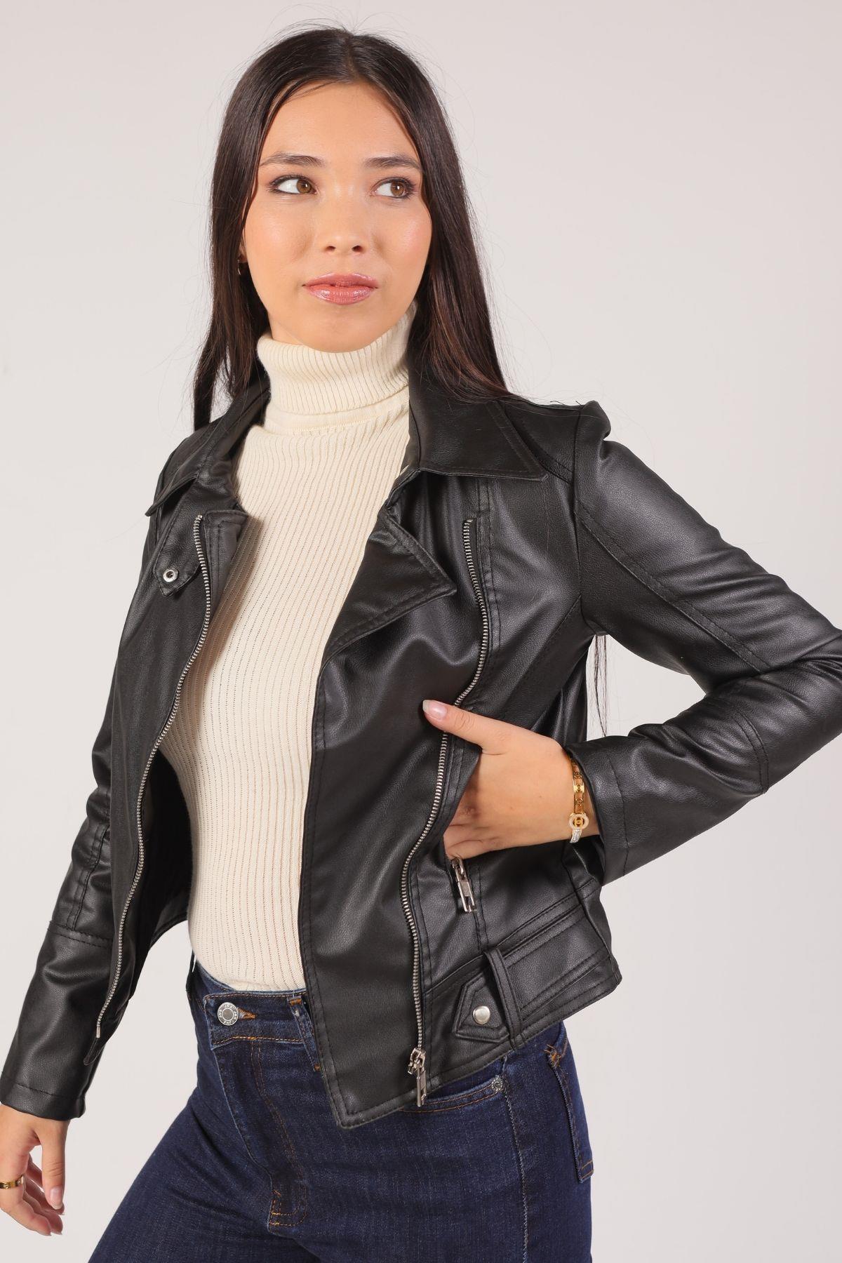 Siyah Çapraz Fermuarlı Deri Ceket 1015