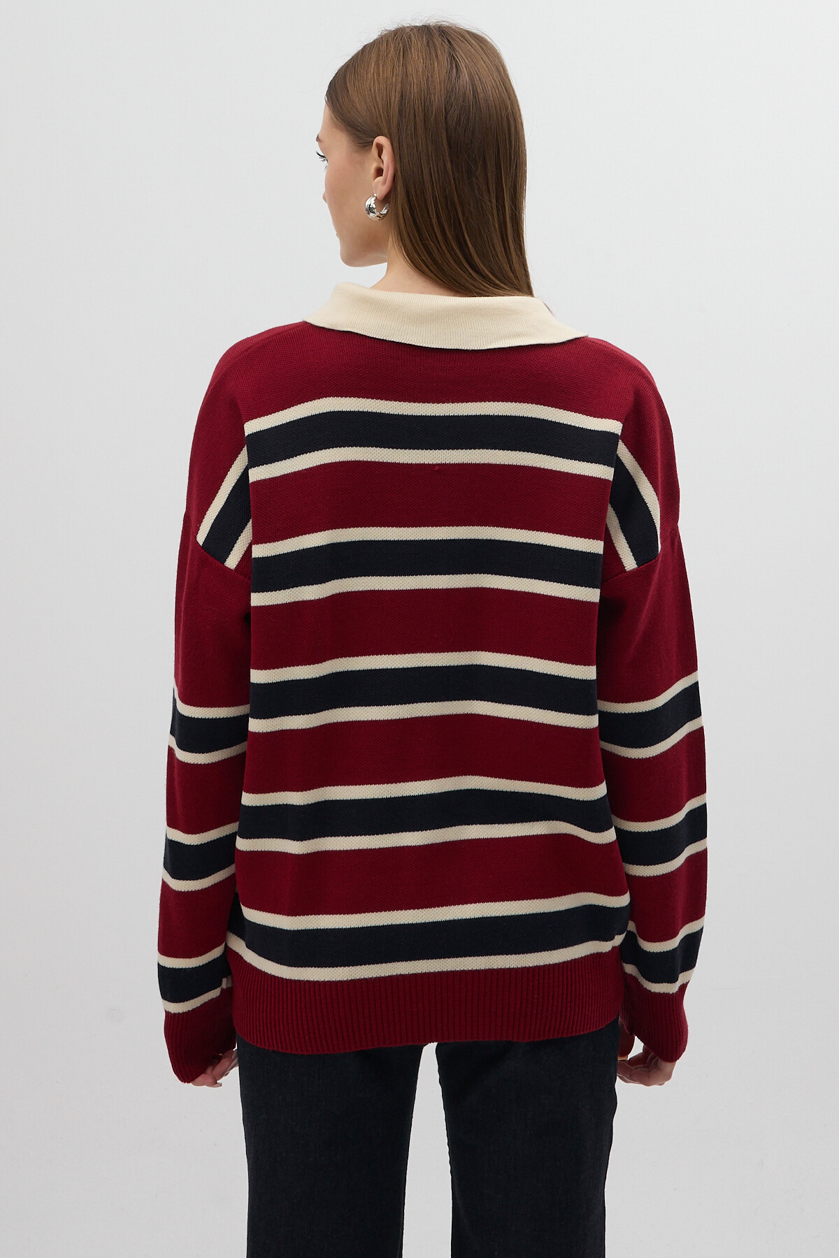 Bordo Çizgili Polo Yaka Kadın Kazak 1018
