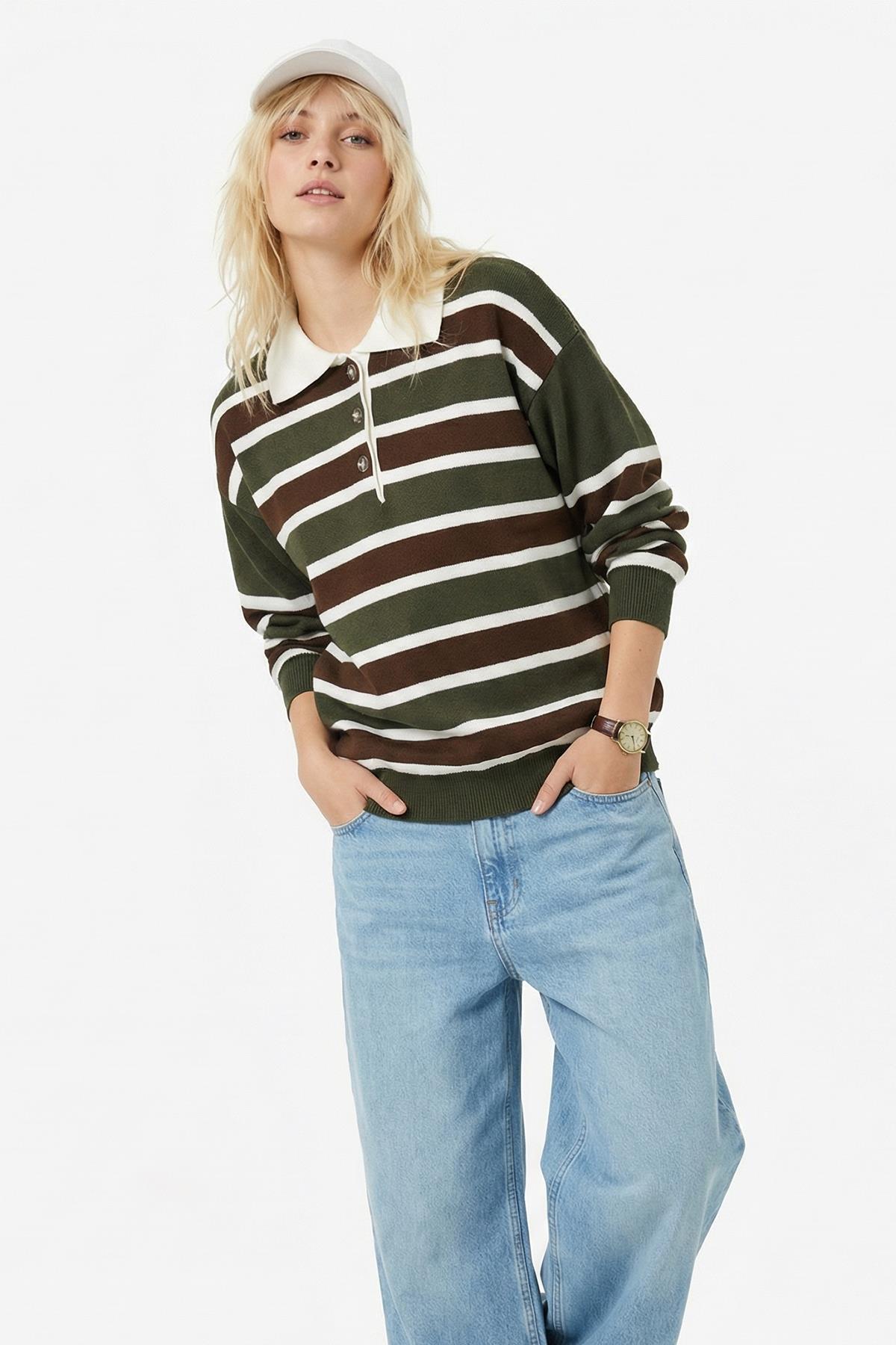 1018 Polo Yaka Çizgili Sweat Haki