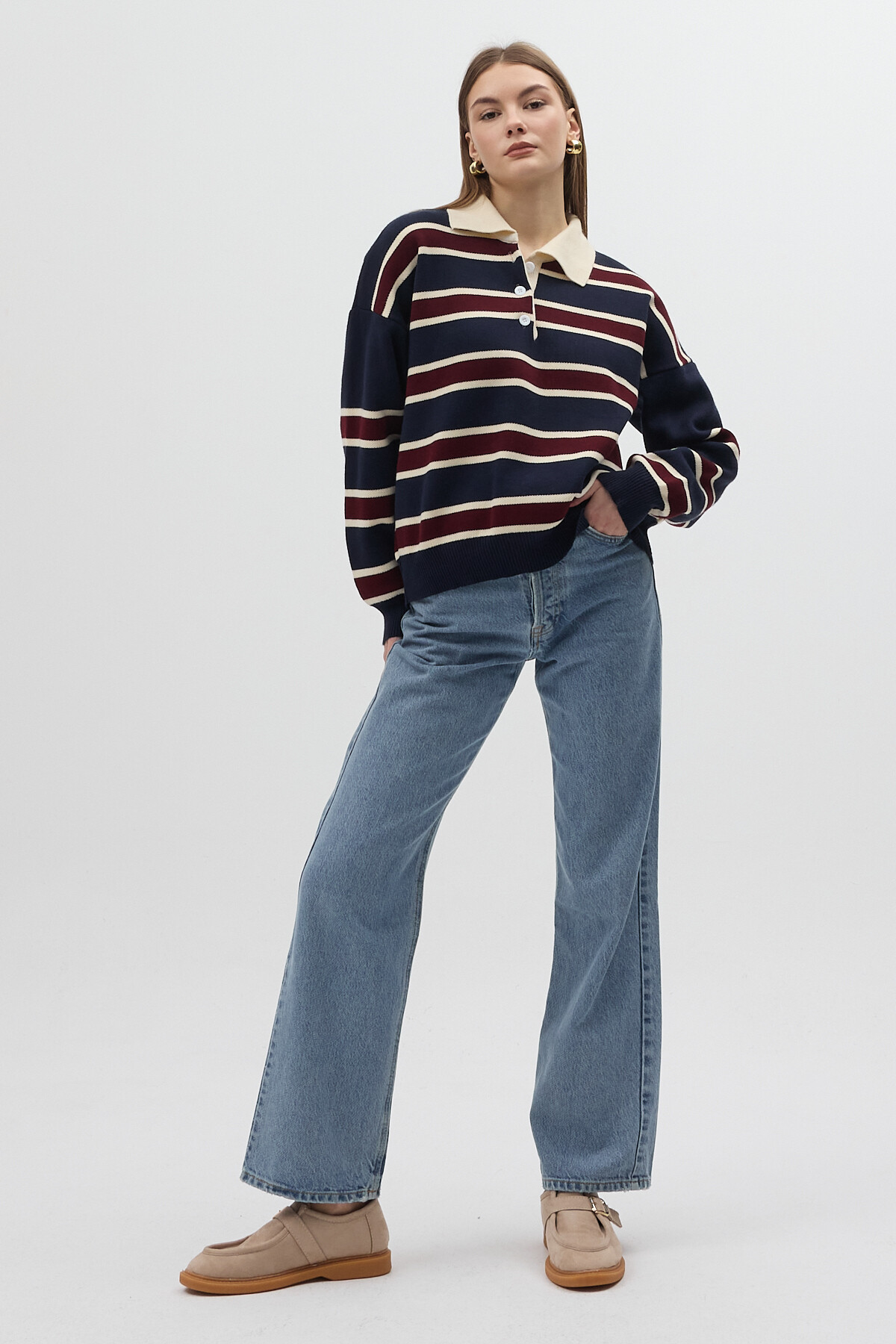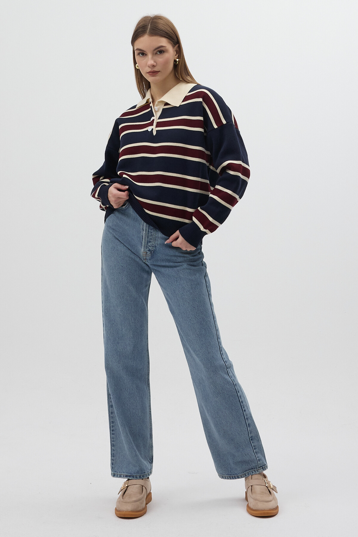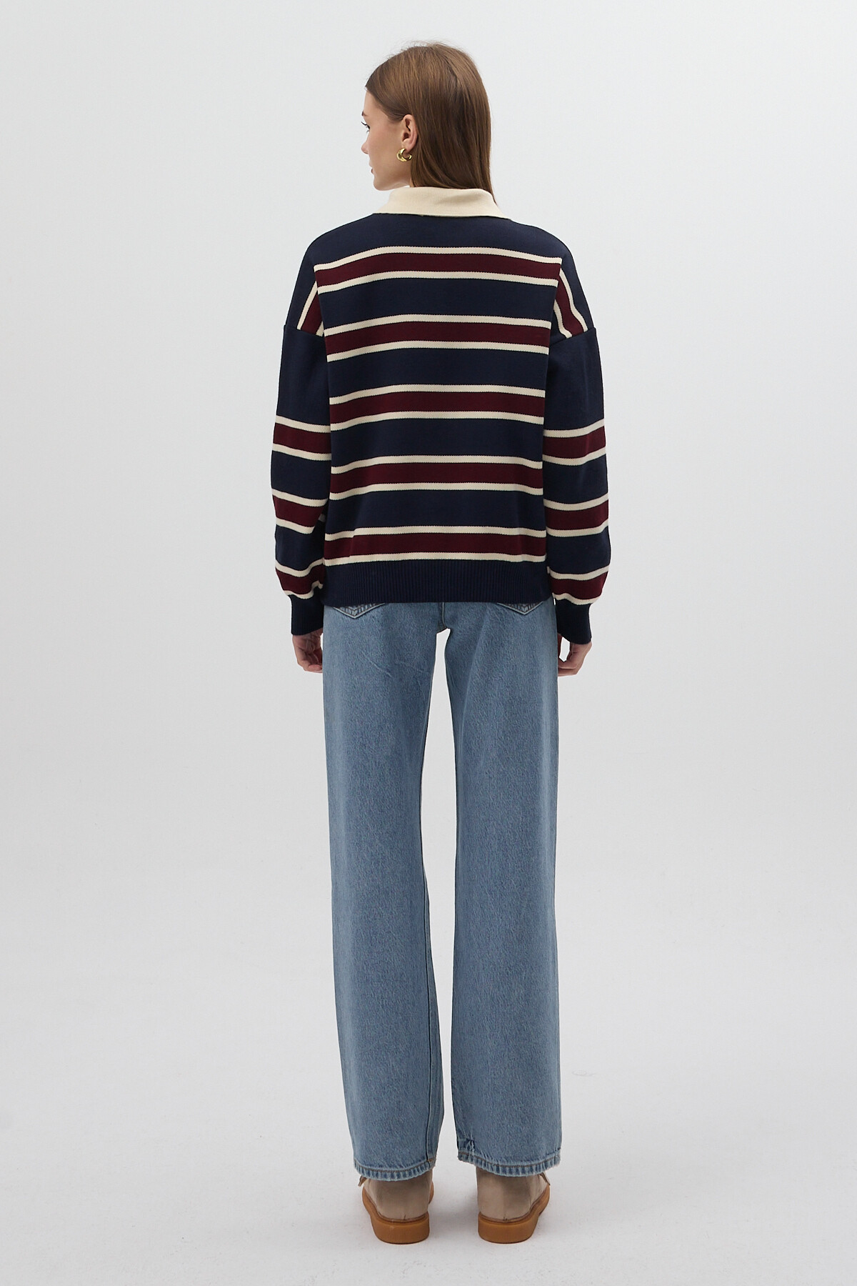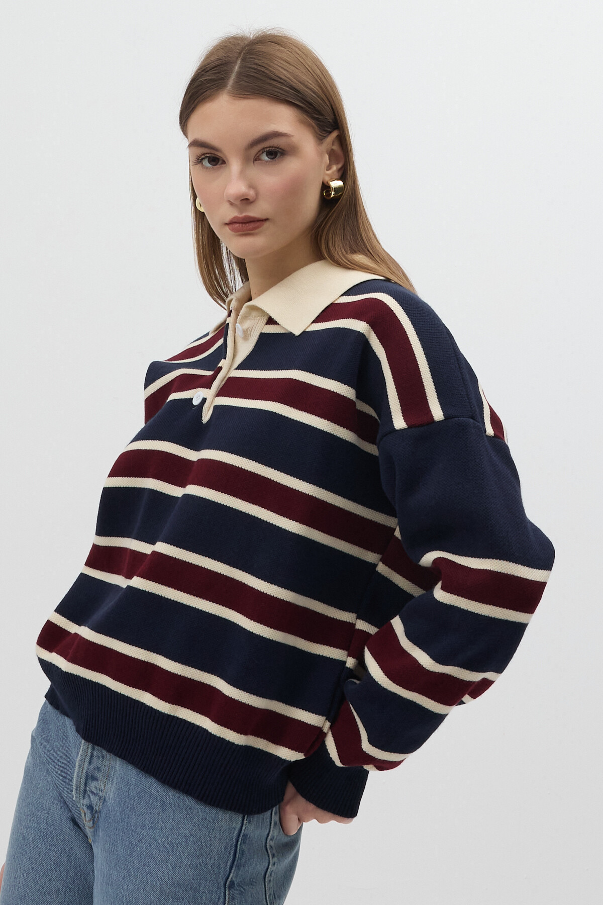 Lacivert Çizgili Polo Yaka Kadın Kazak 1018