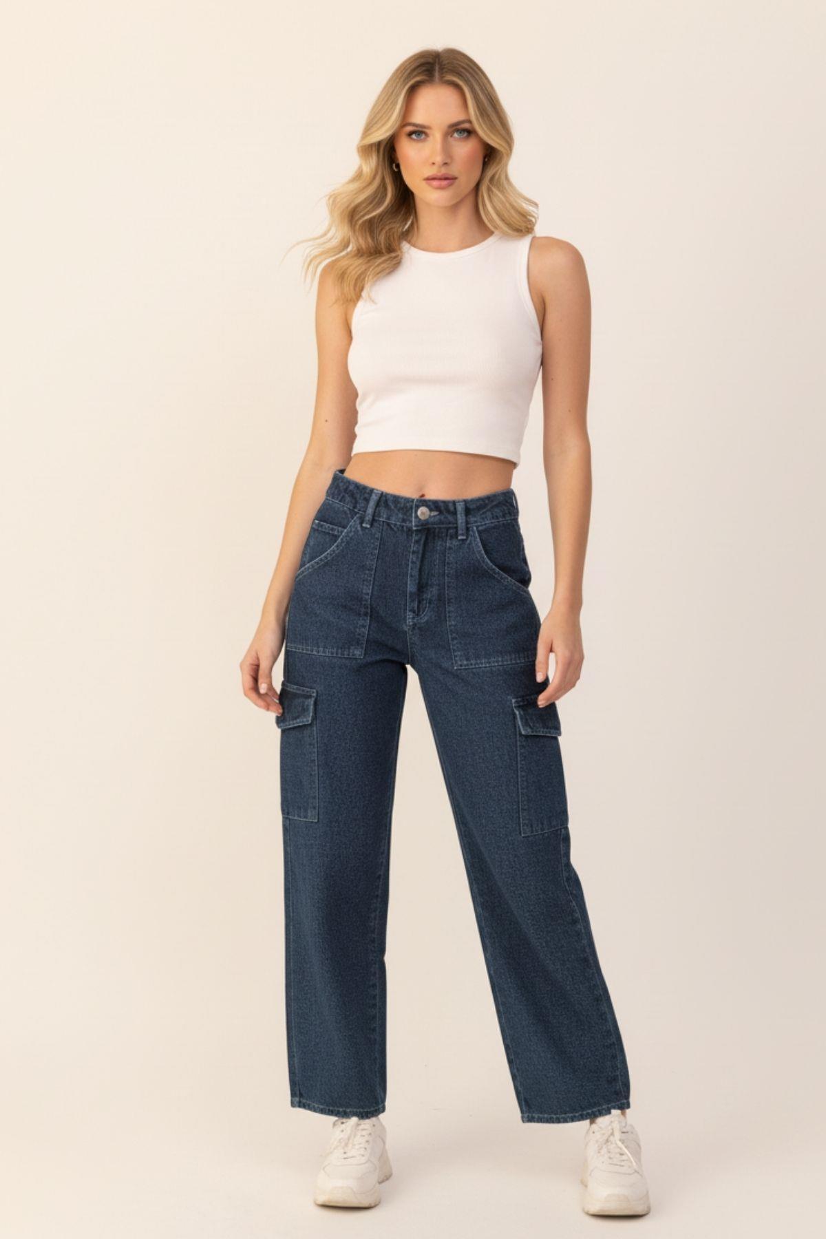 Koyu Mavi Kadın Paça Düğmeli Yüksek Bel Jean Kargo Pantolon 1055