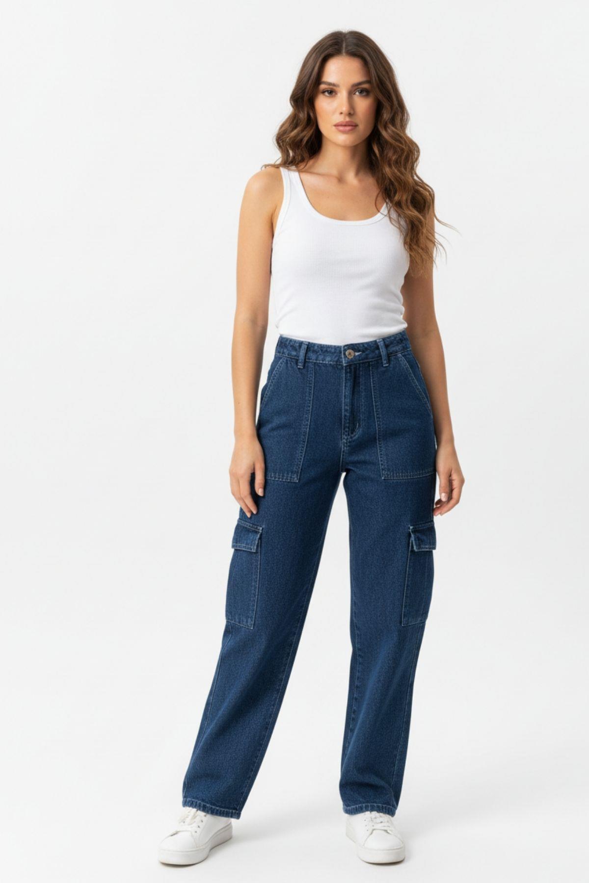 Koyu Mavi Kadın Paça Düğmeli Yüksek Bel Jean Kargo Pantolon 1055
