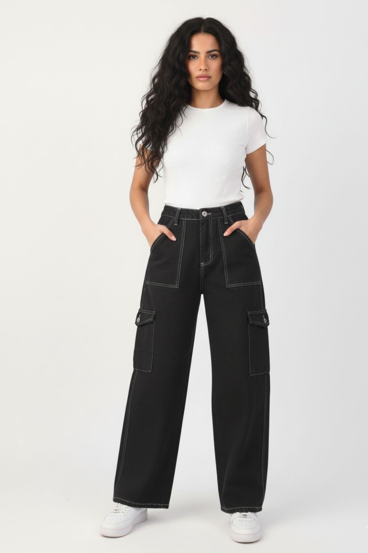 Siyah Kadın Yüksek Bel Jean Kargo Pantolon 1057