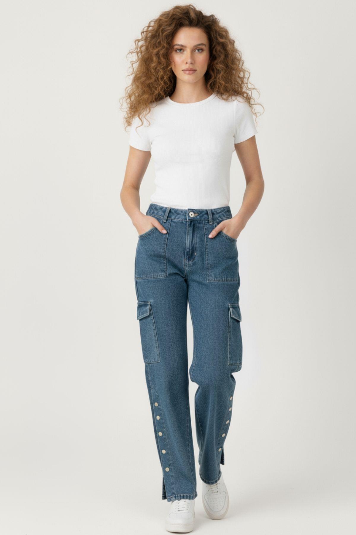 Mavi Kadın Paça Düğmeli Yüksek Bel Jean Kargo Pantolon 1055