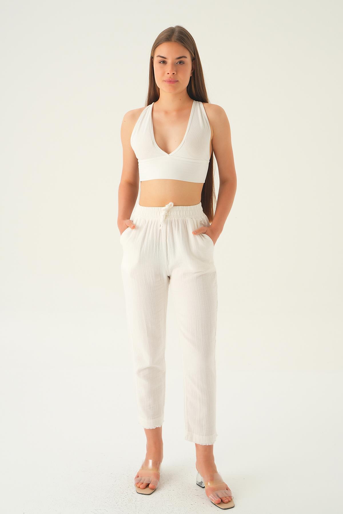 1067 Bağcıklı Cepli Pantolon Beyaz