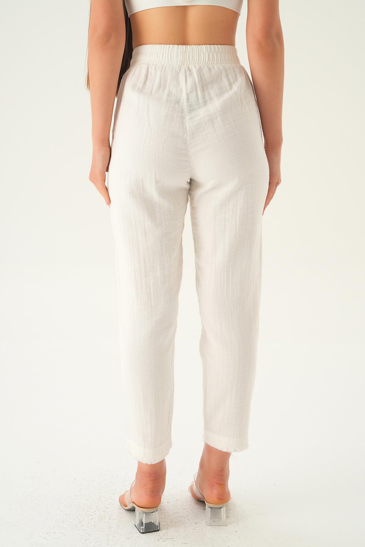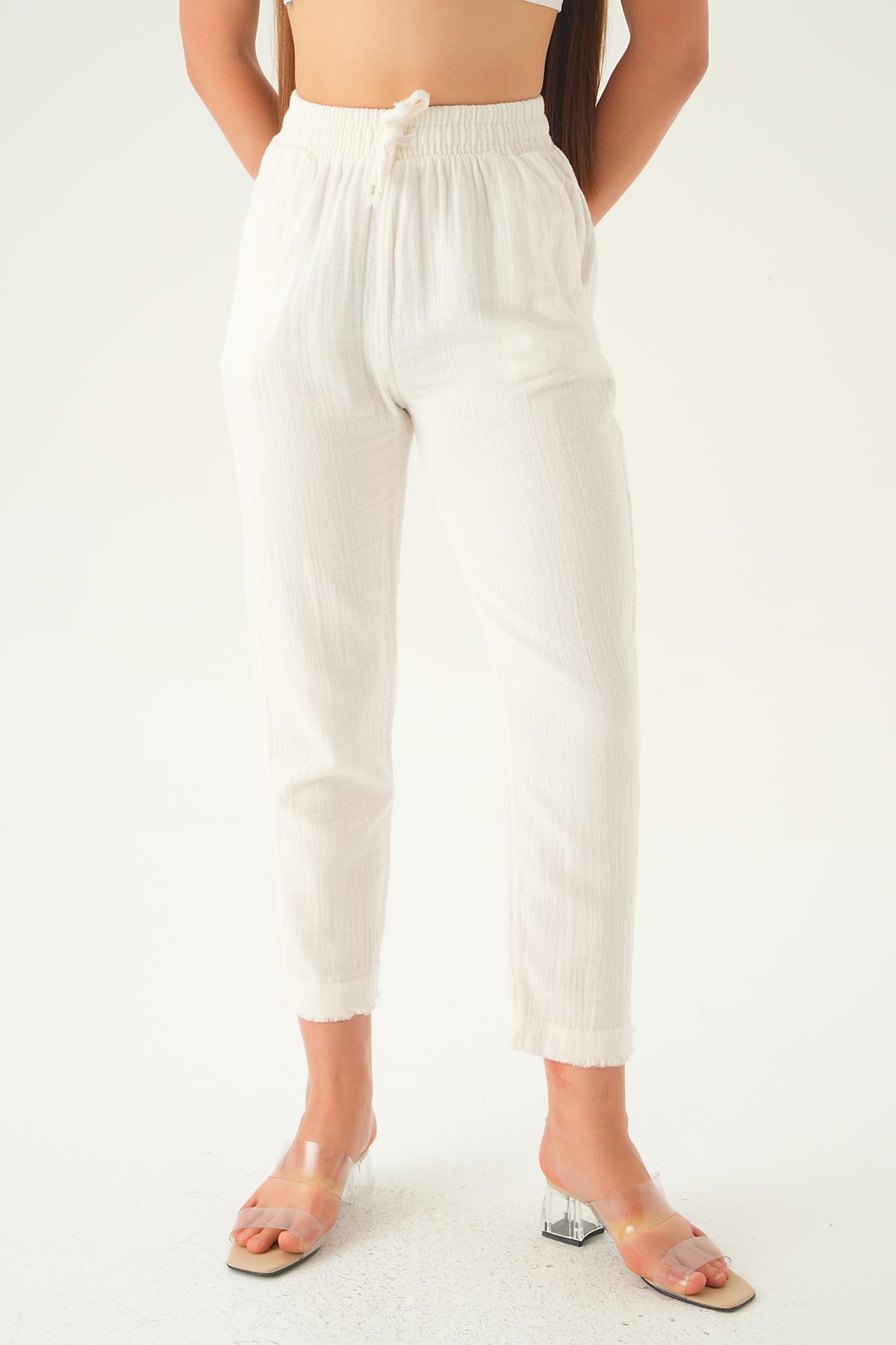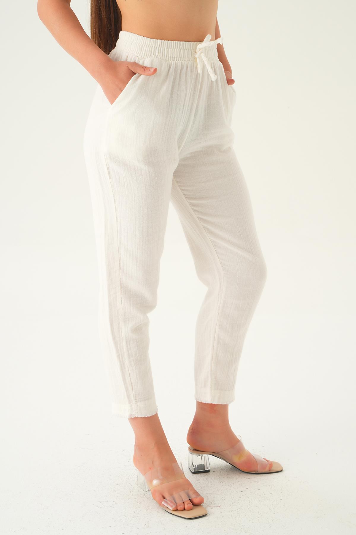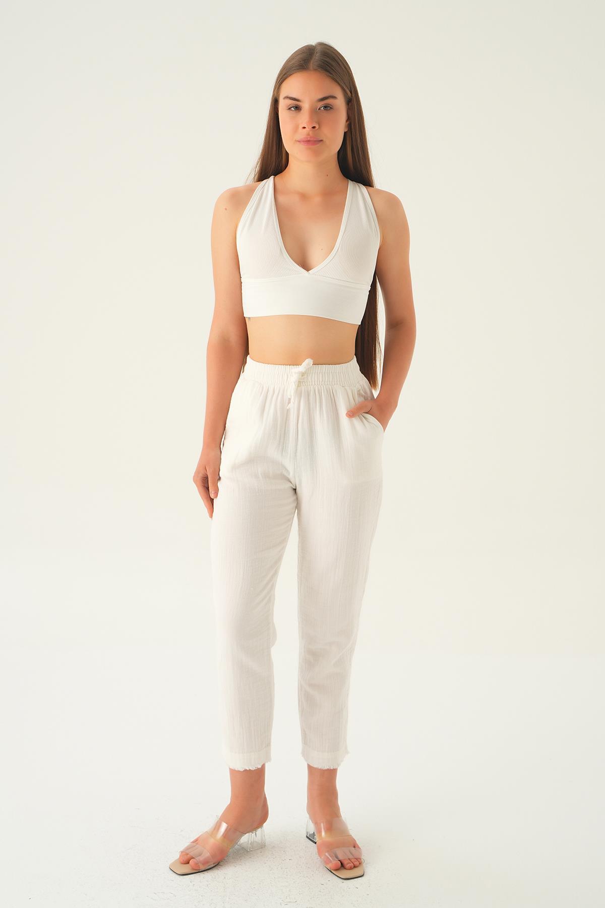 Beyaz Bağcıklı Cepli Pantolon 1067
