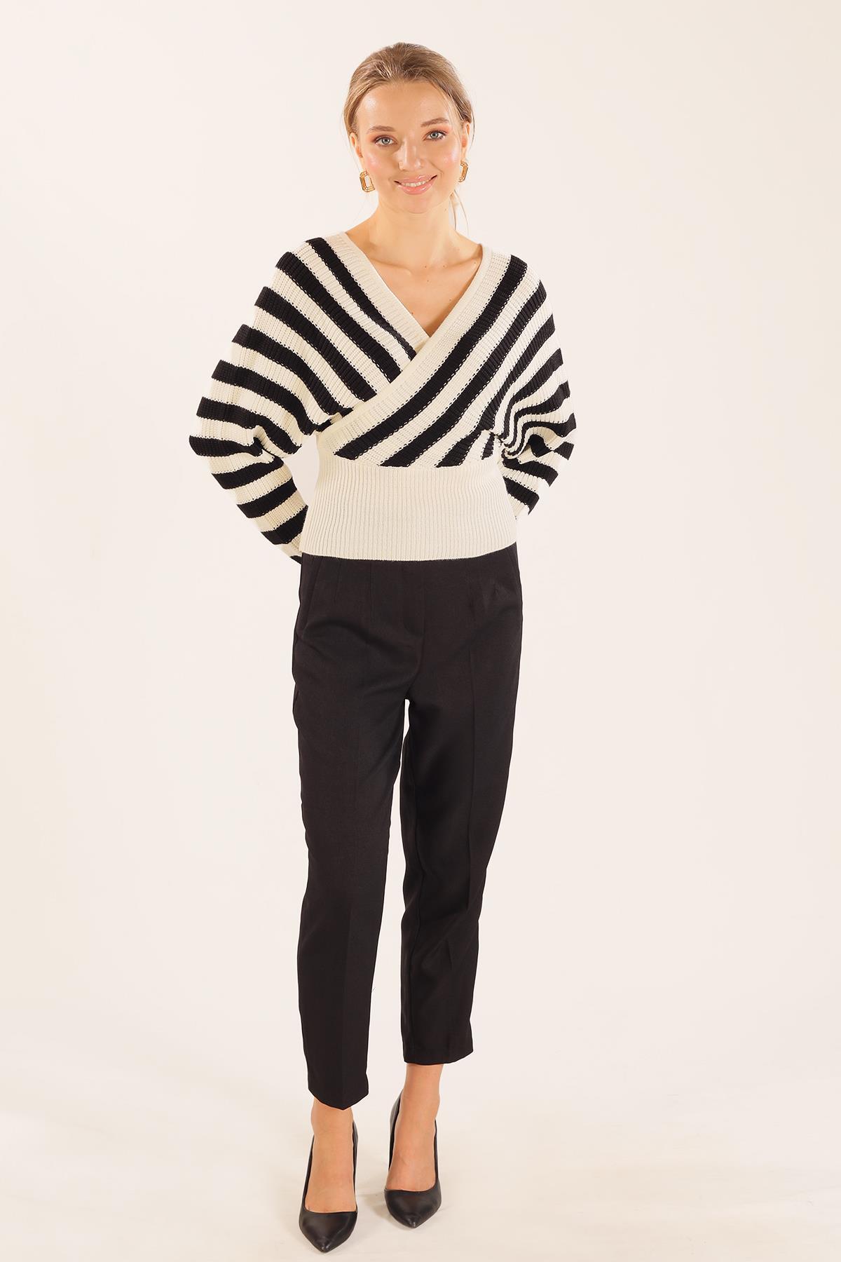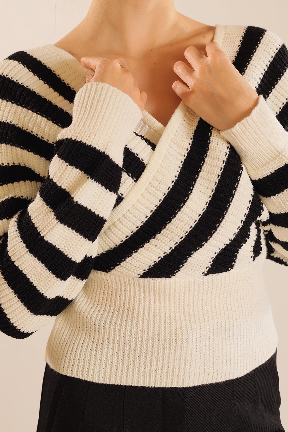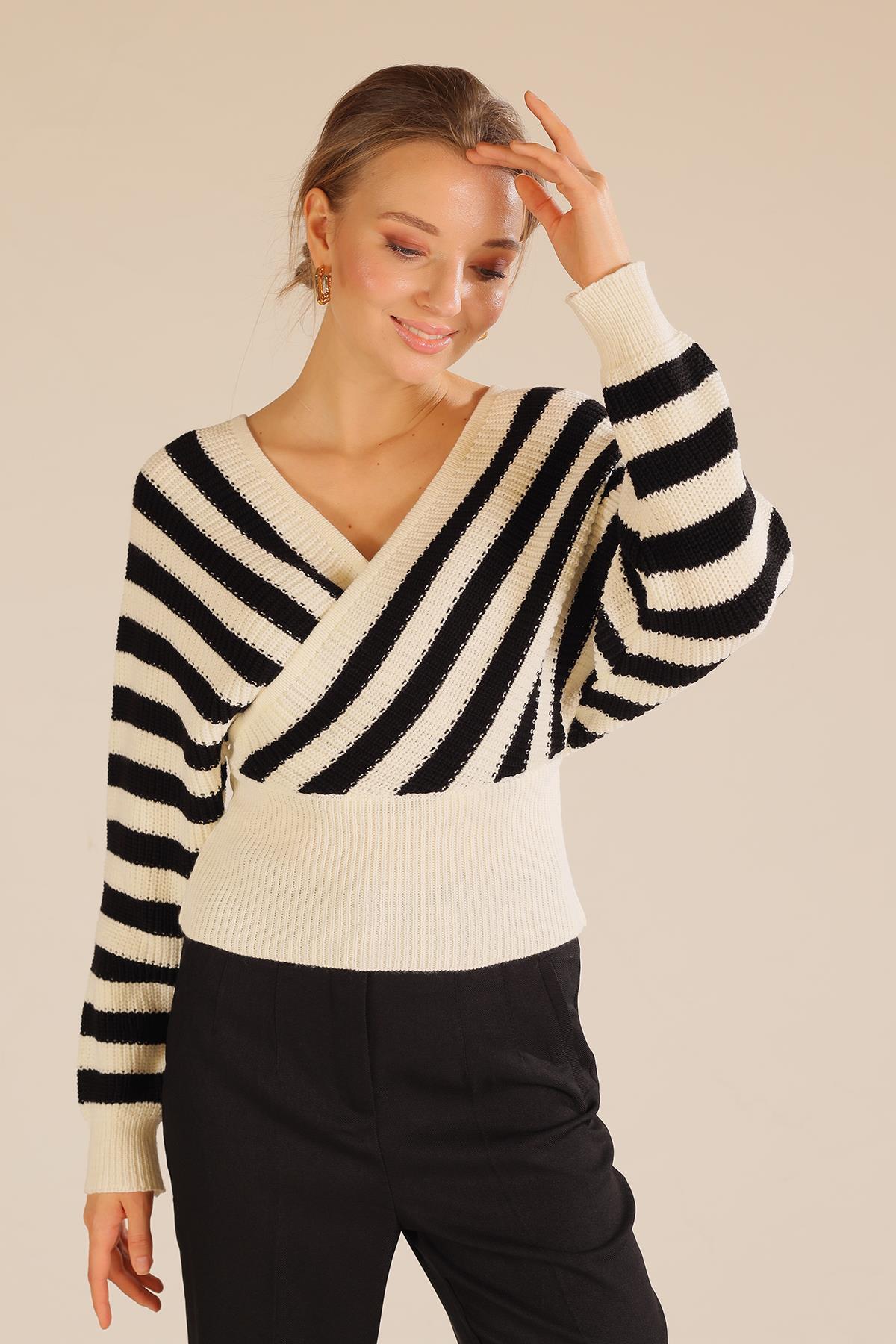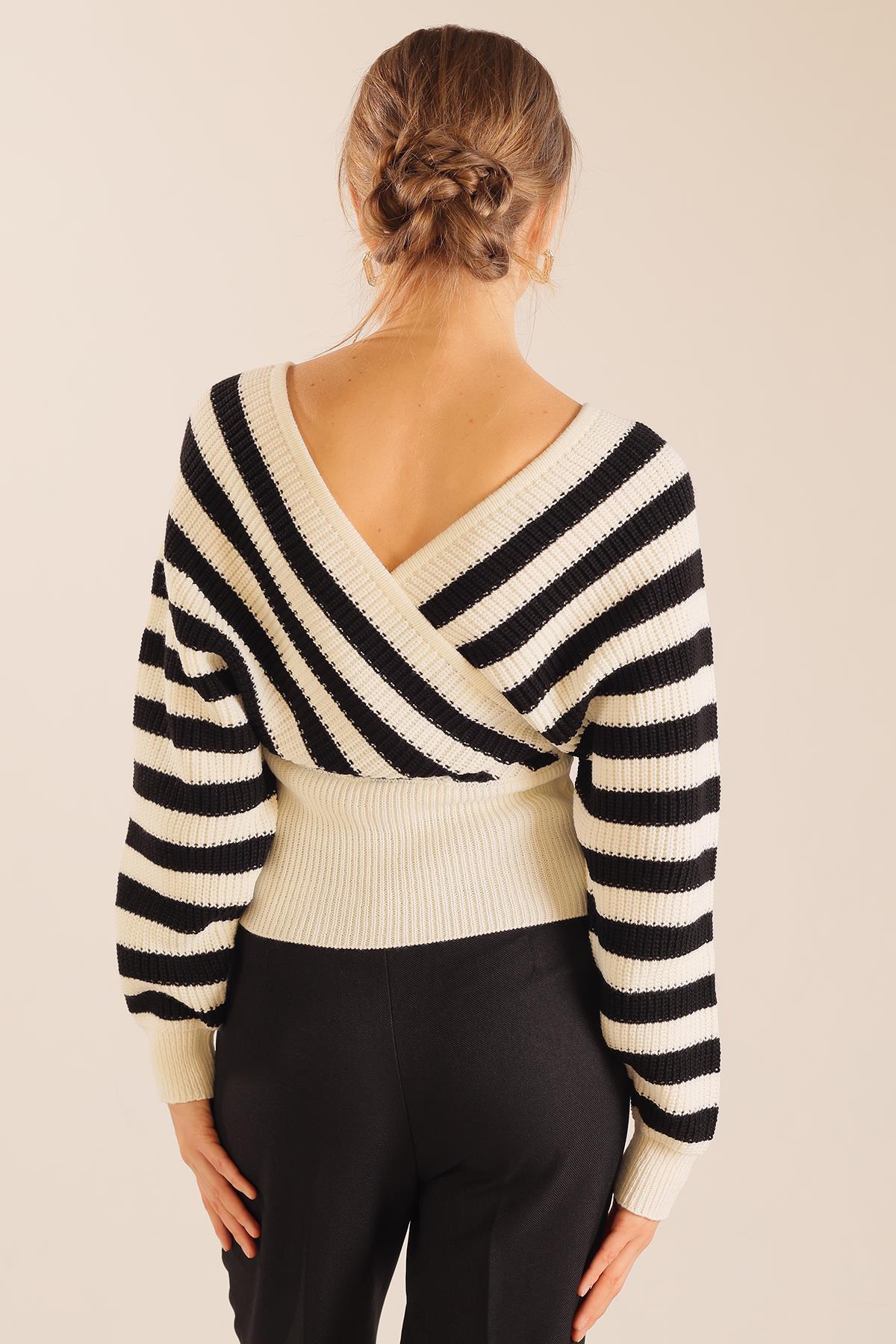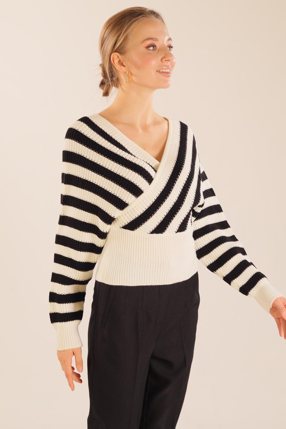 Ekru-Siyah Kruvaze Yaka Çizgili Kazak 11005