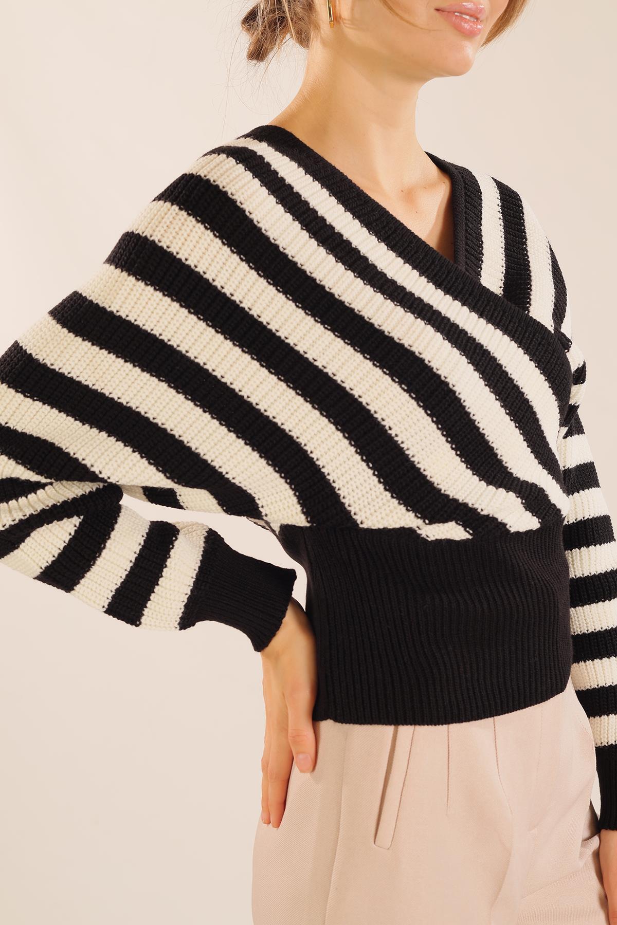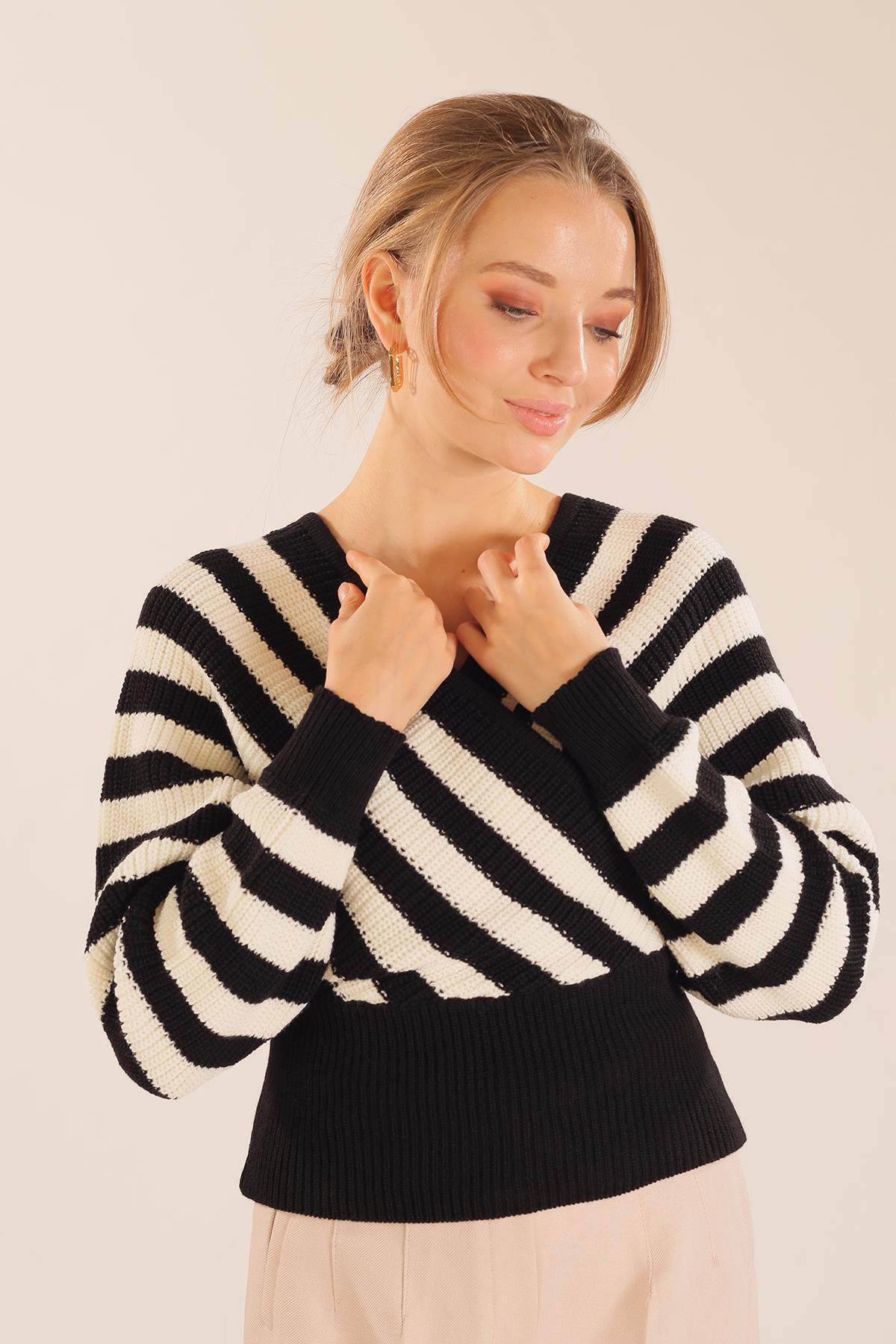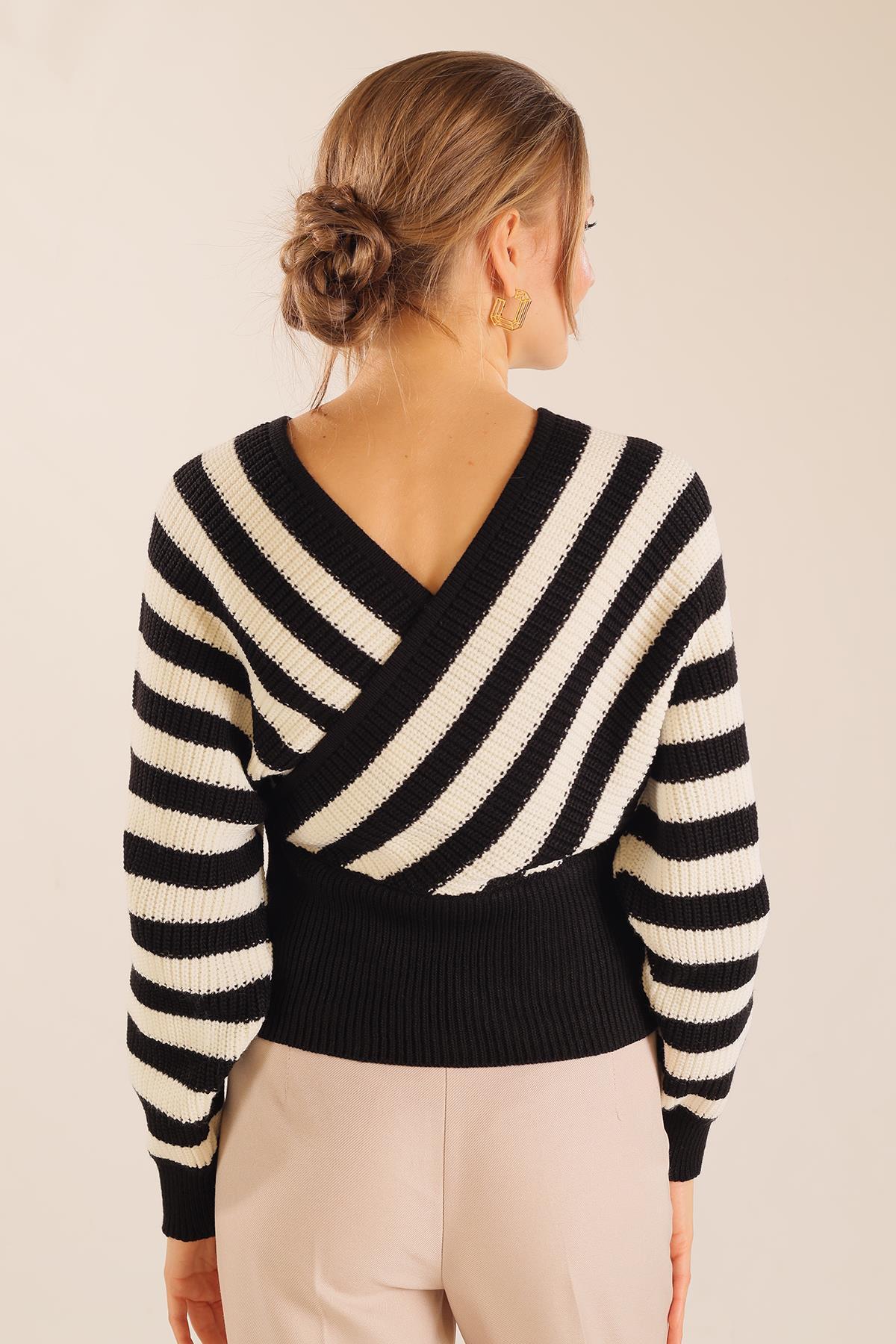 Siyah-Ekru Kruvaze Yaka Çizgili Kazak 11005