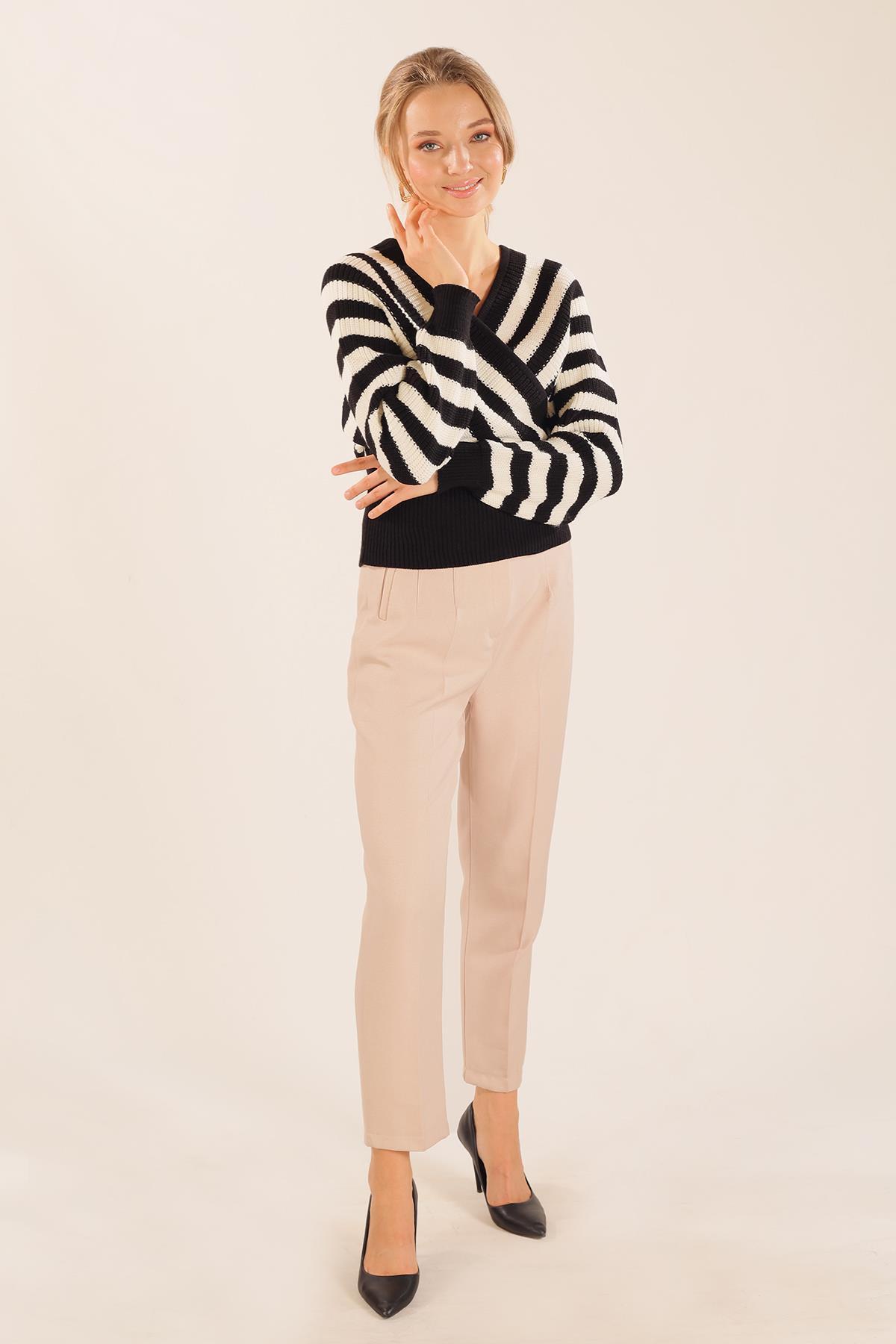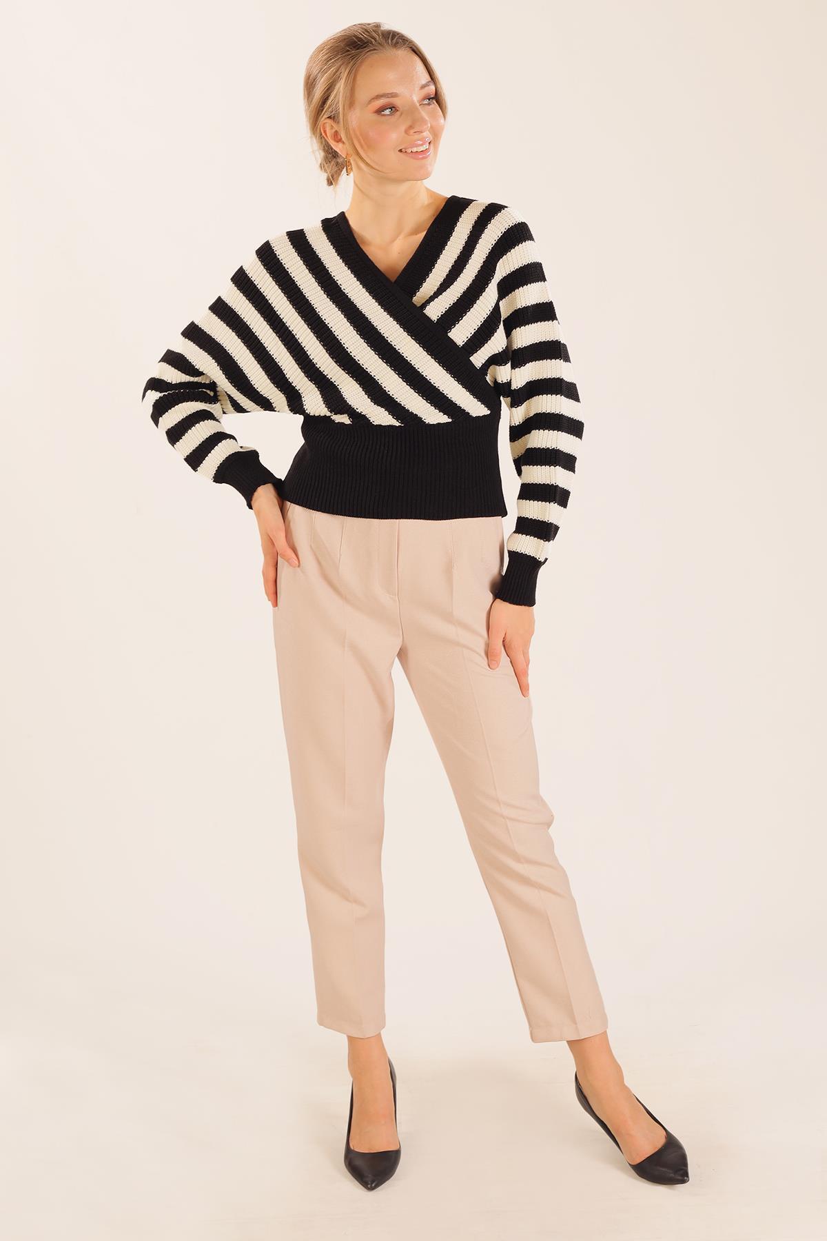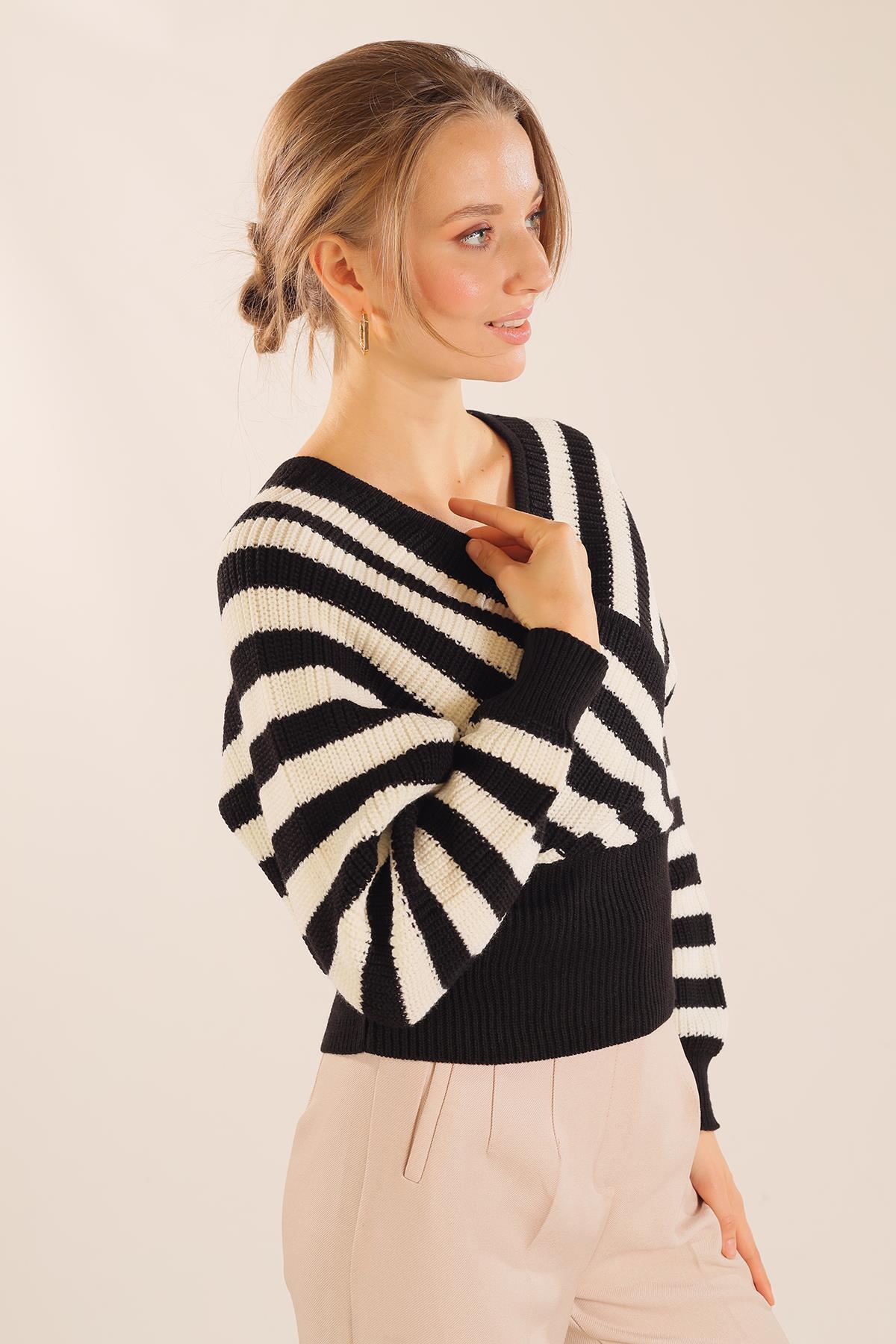 Siyah-Ekru Kruvaze Yaka Çizgili Kazak 11005