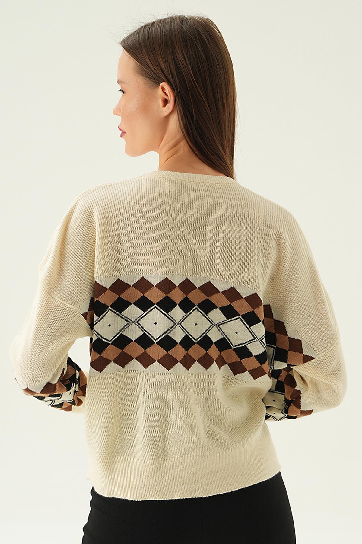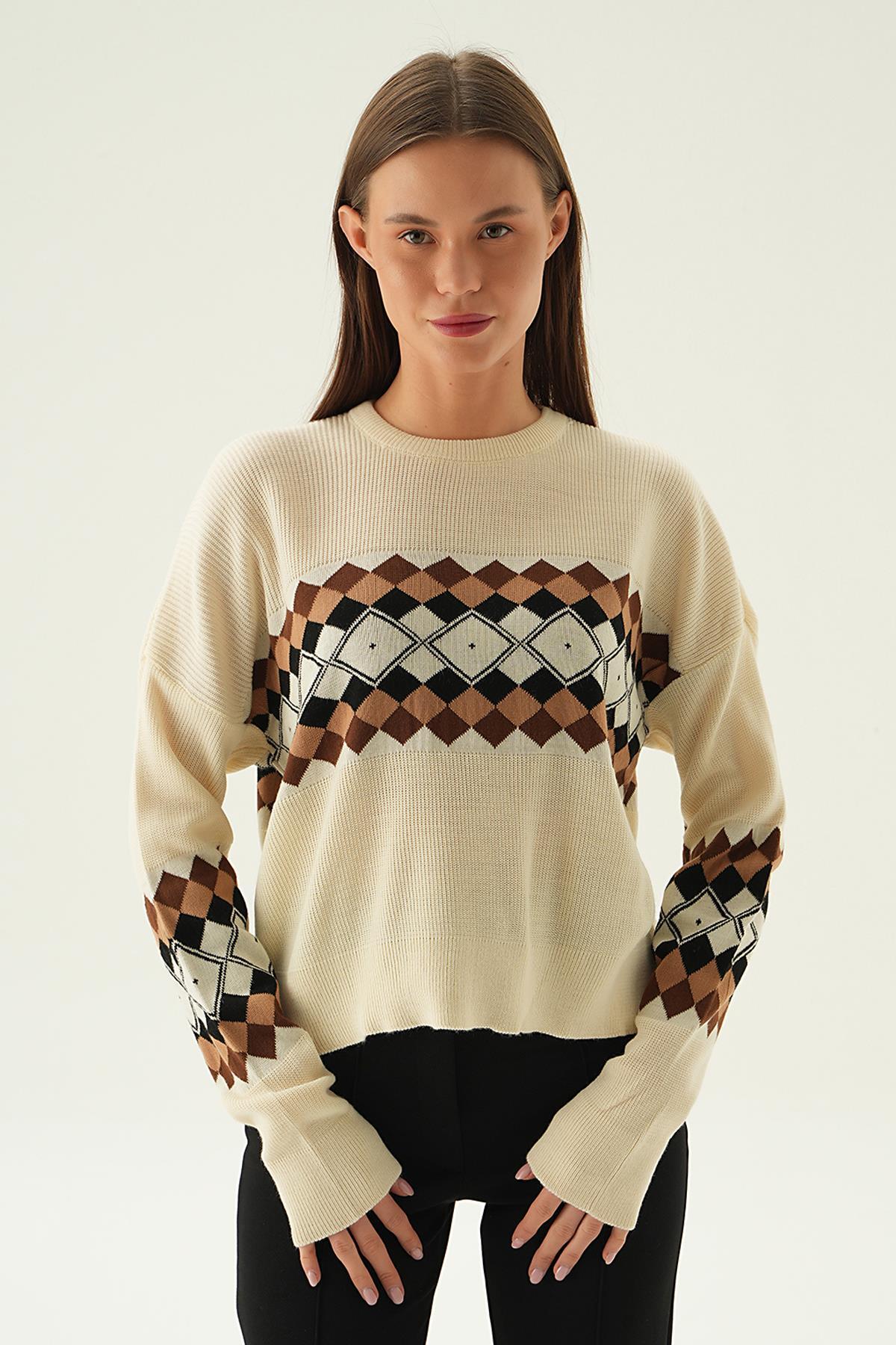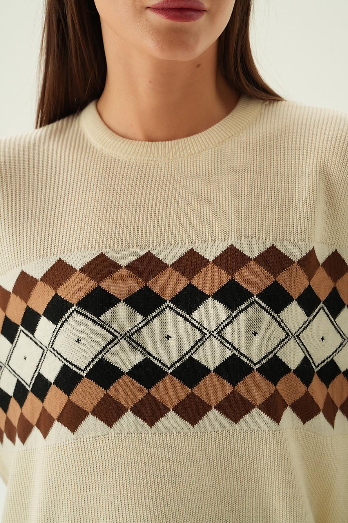 Bej Desenli Bisiklet Yaka Kazak 1333