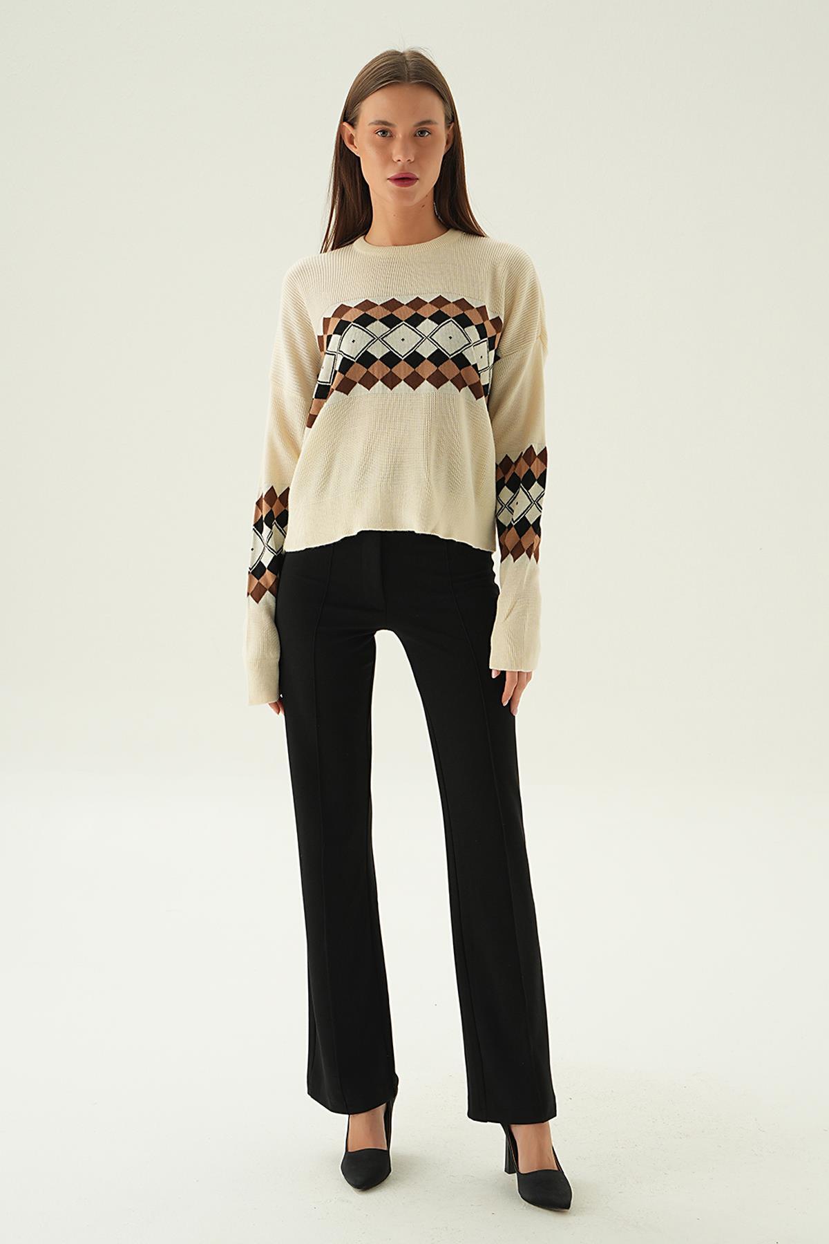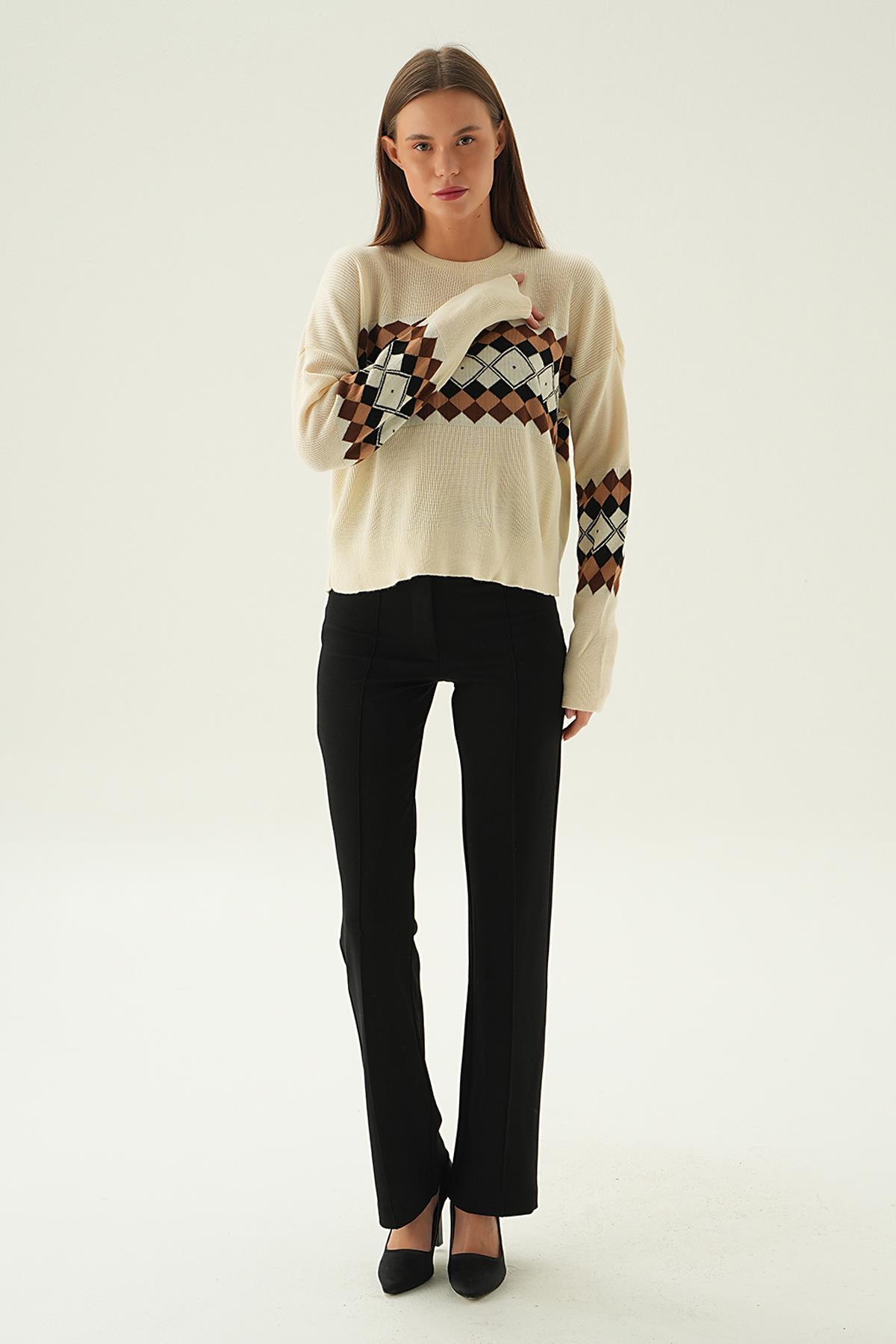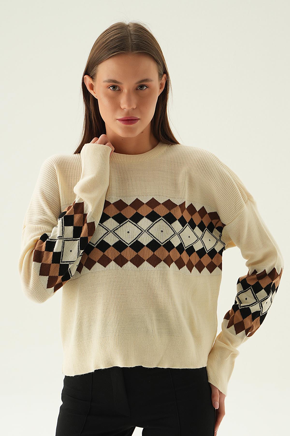 Bej Desenli Bisiklet Yaka Kazak 1333
