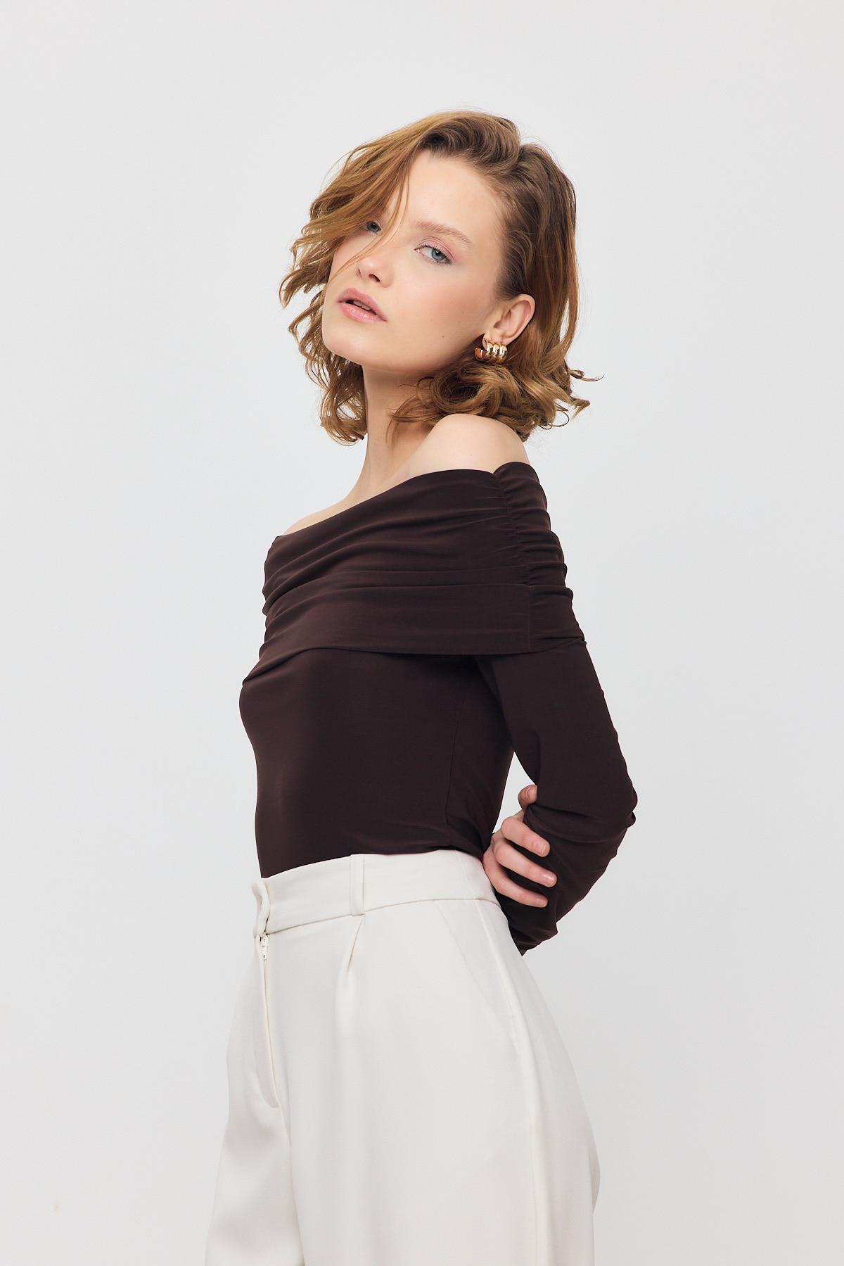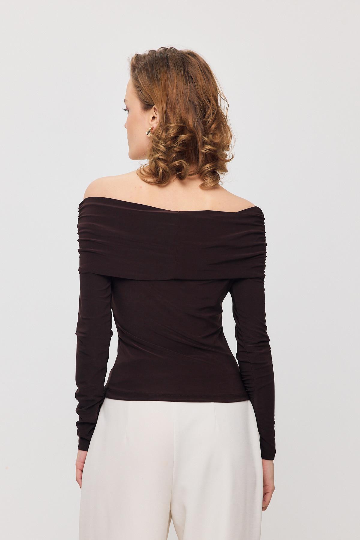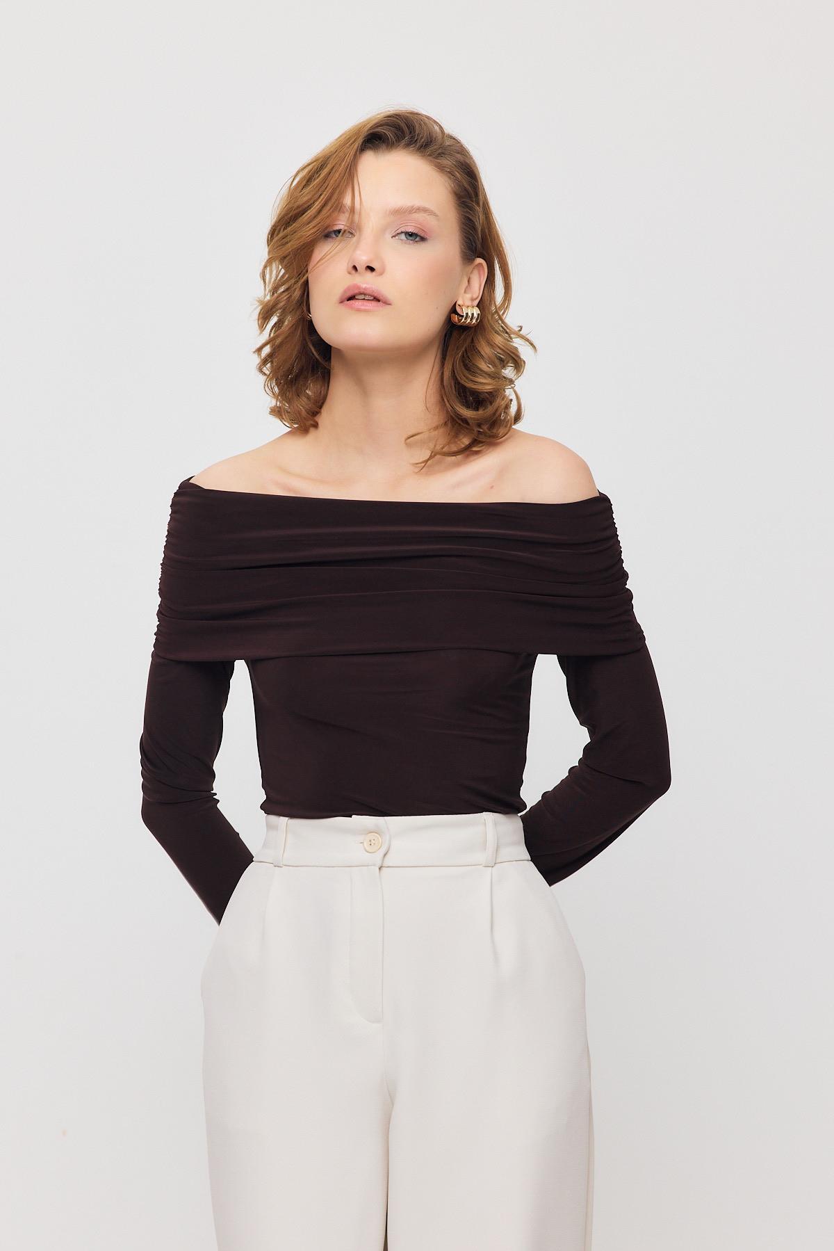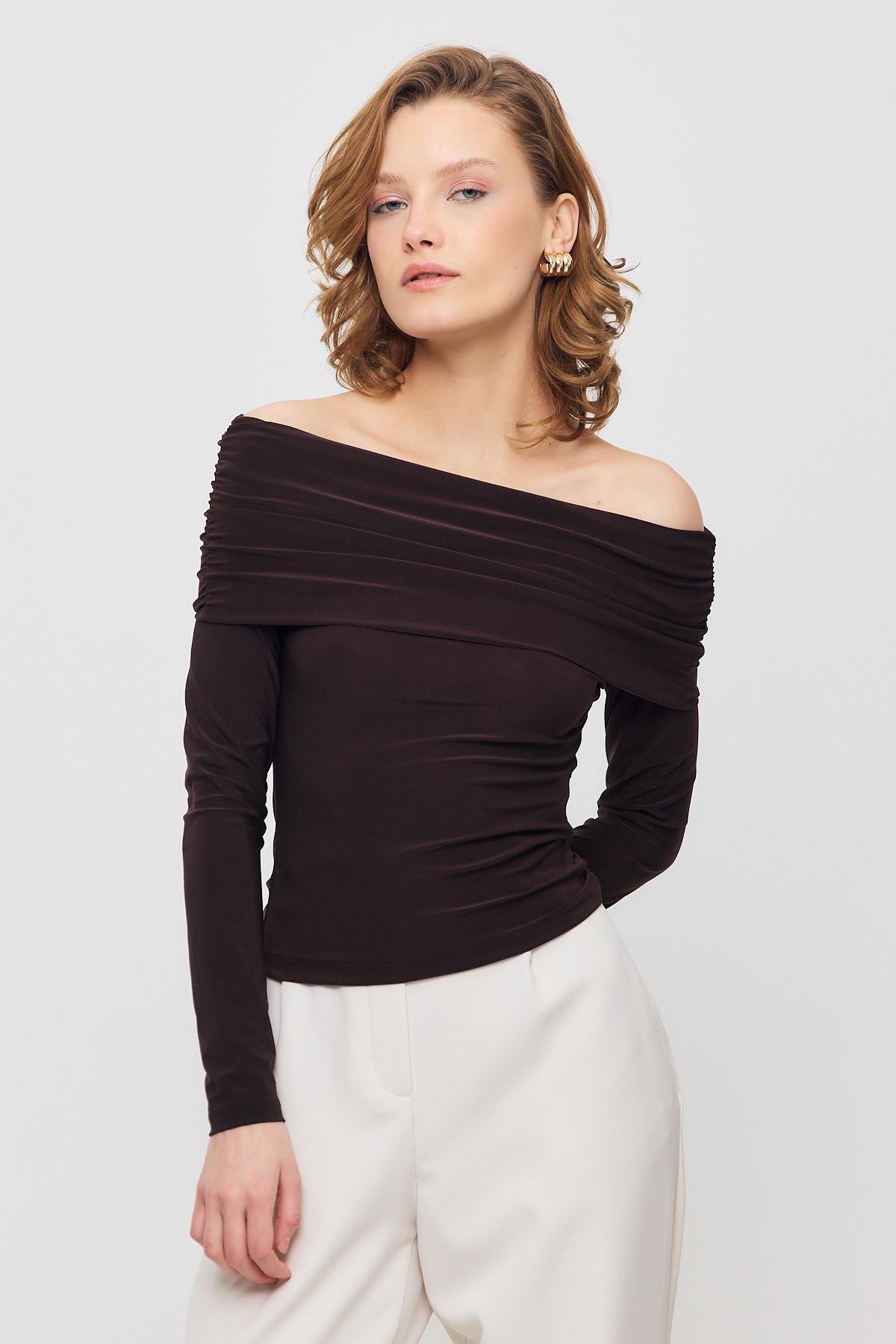 Kahve Madonna Yaka Büzgülü Bluz 12222