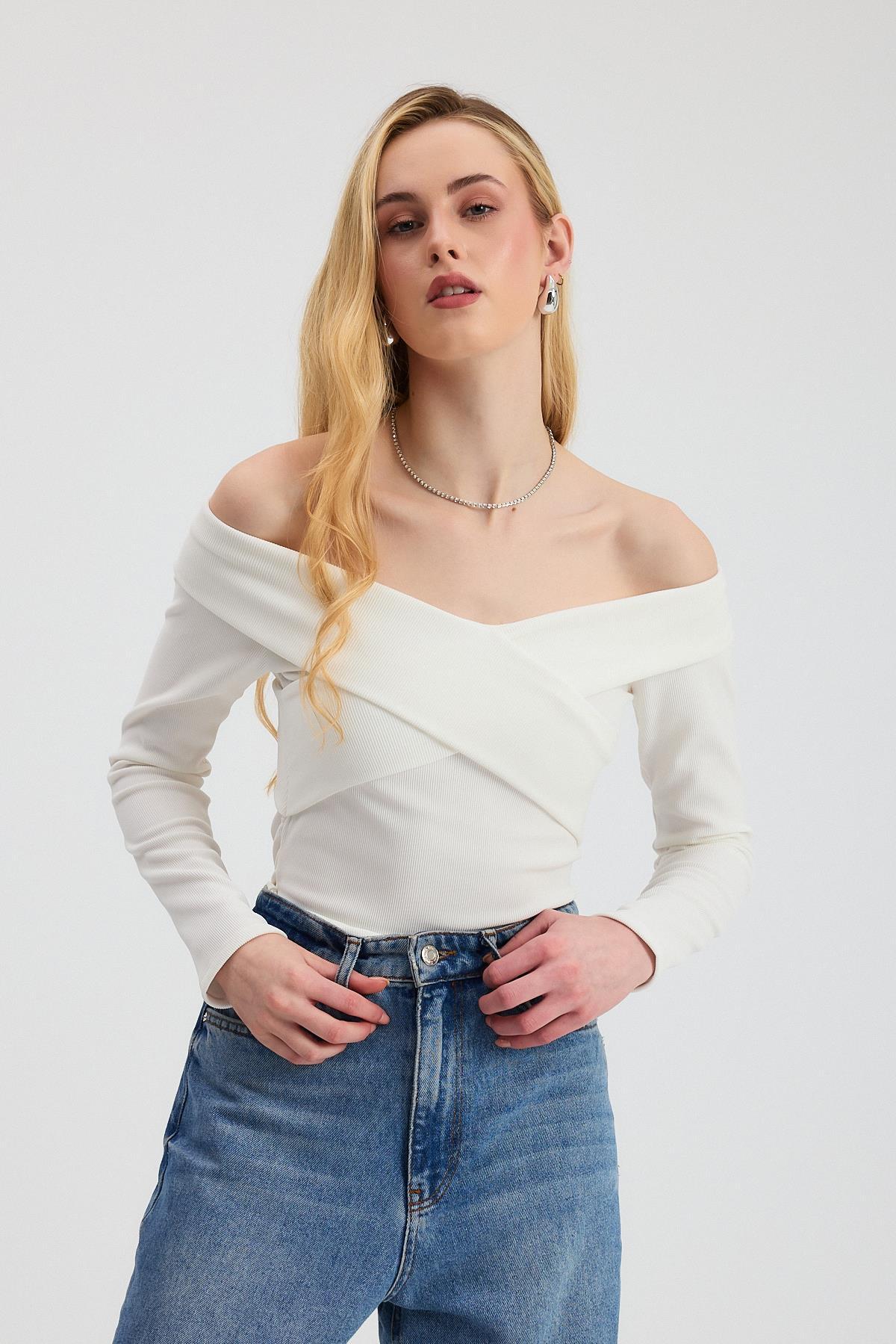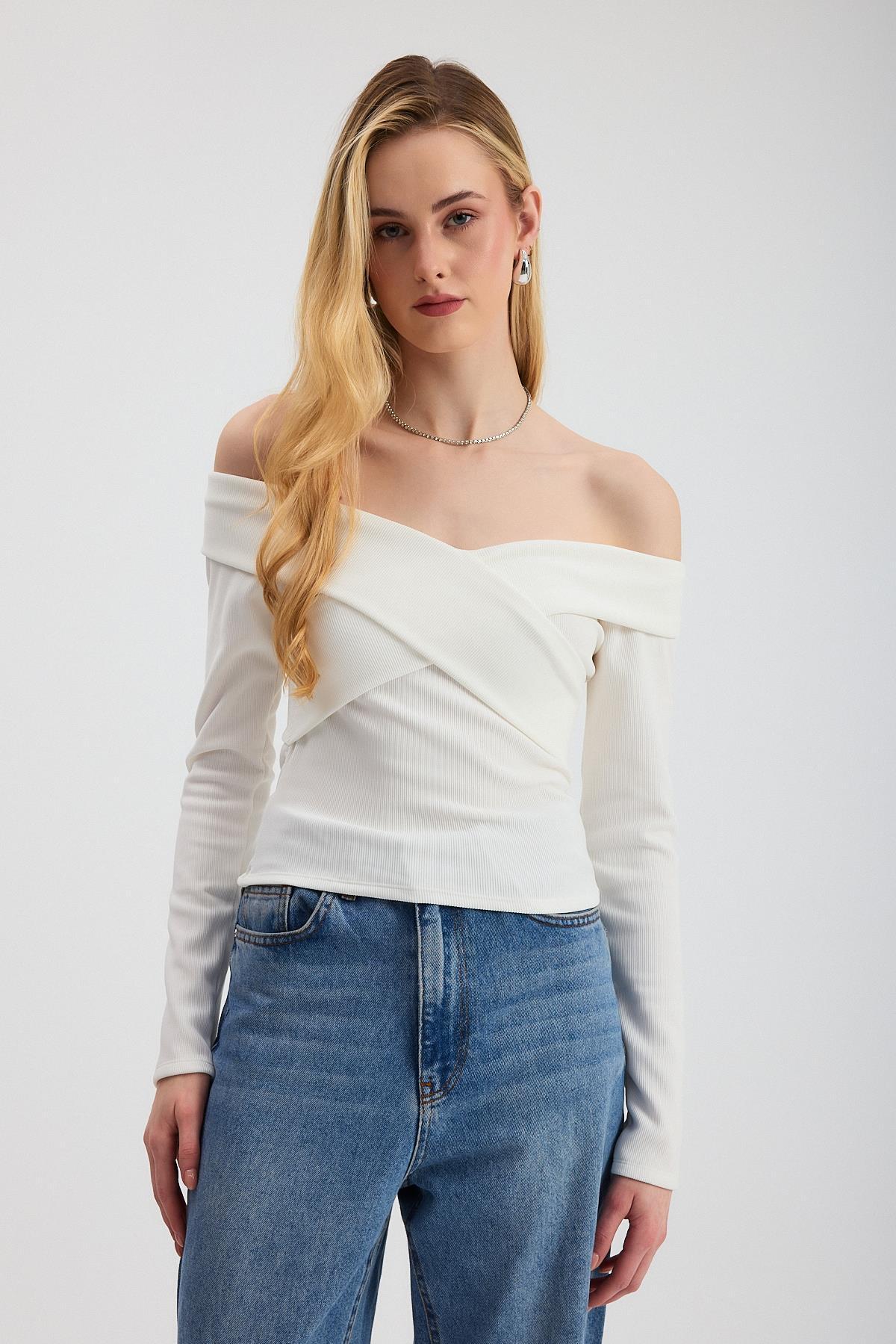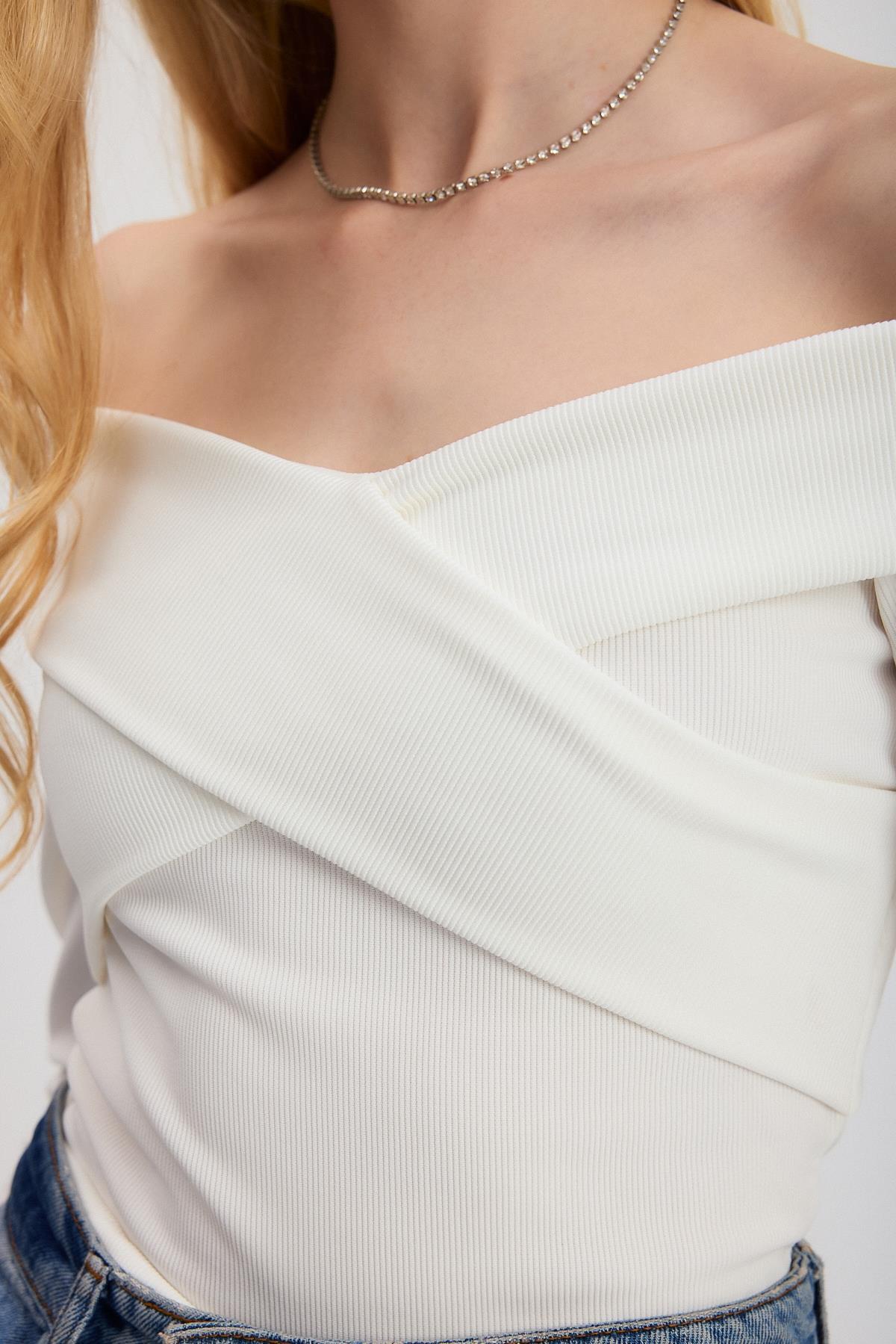 Ekru Çapraz Madonna Yaka Bluz 12748