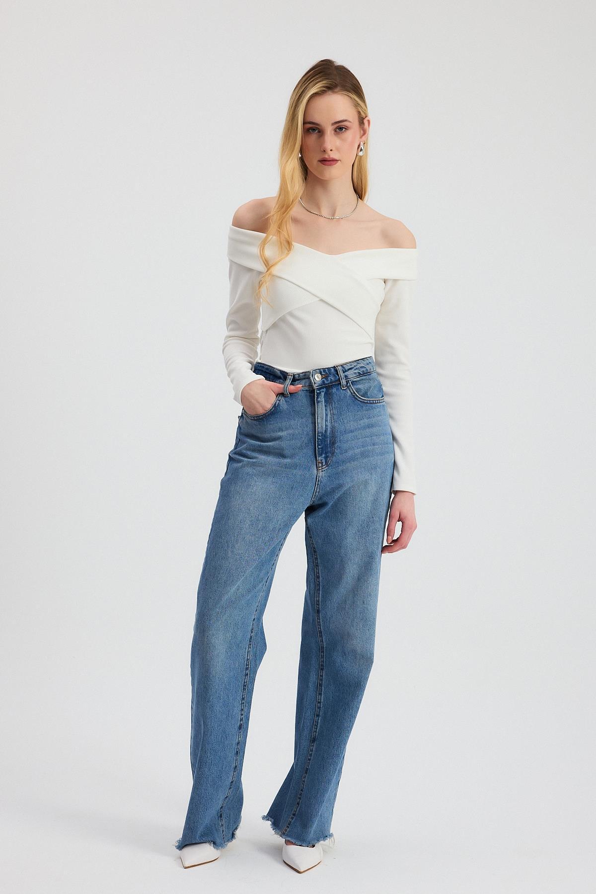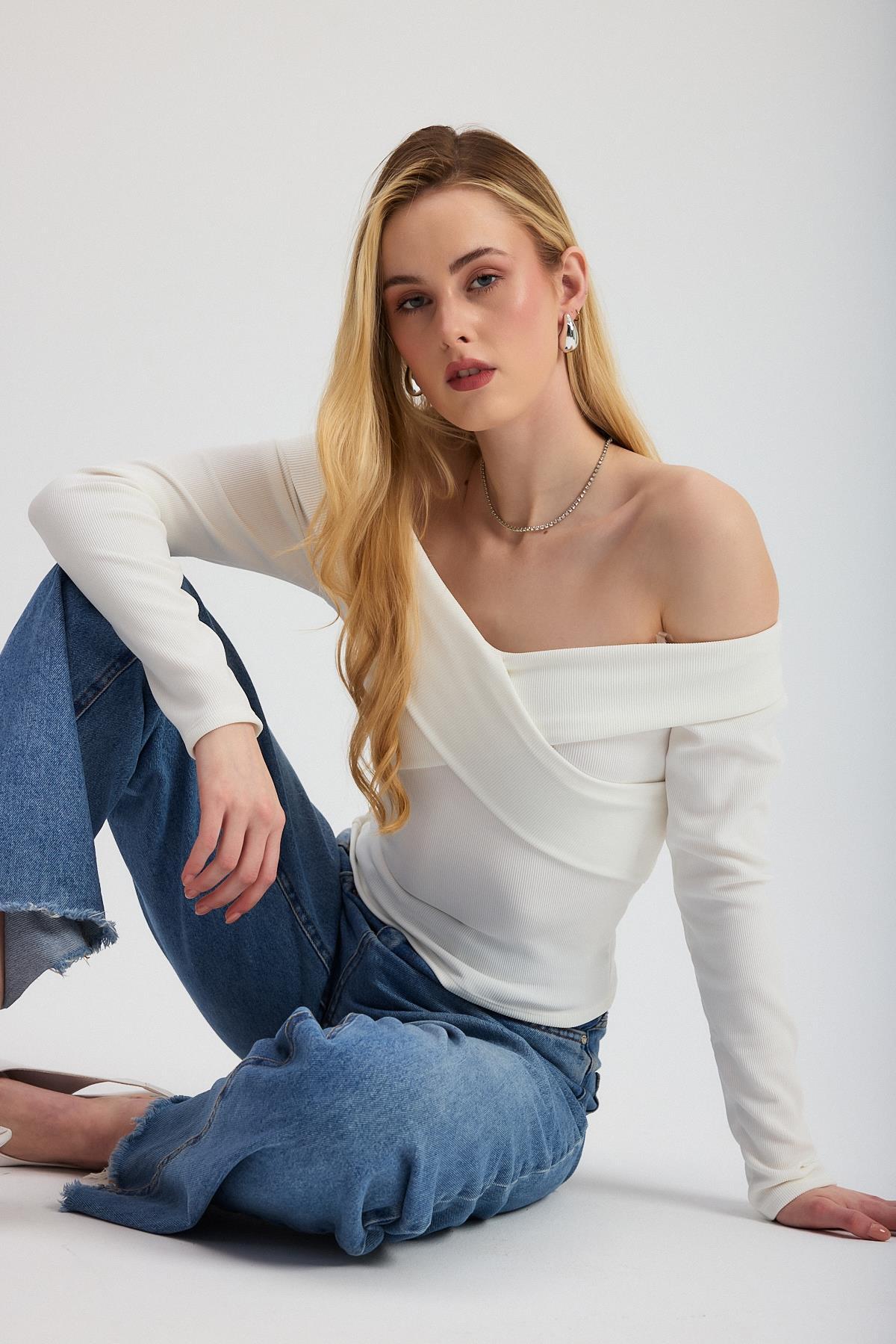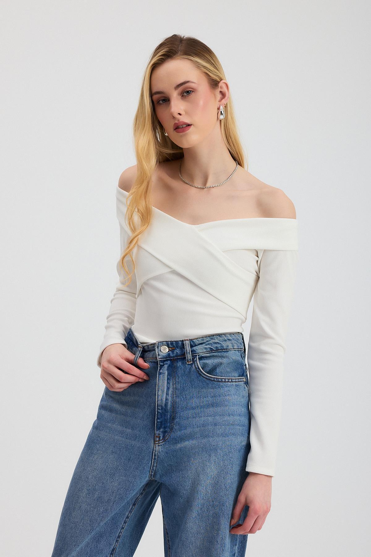Ekru Çapraz Madonna Yaka Bluz 12748