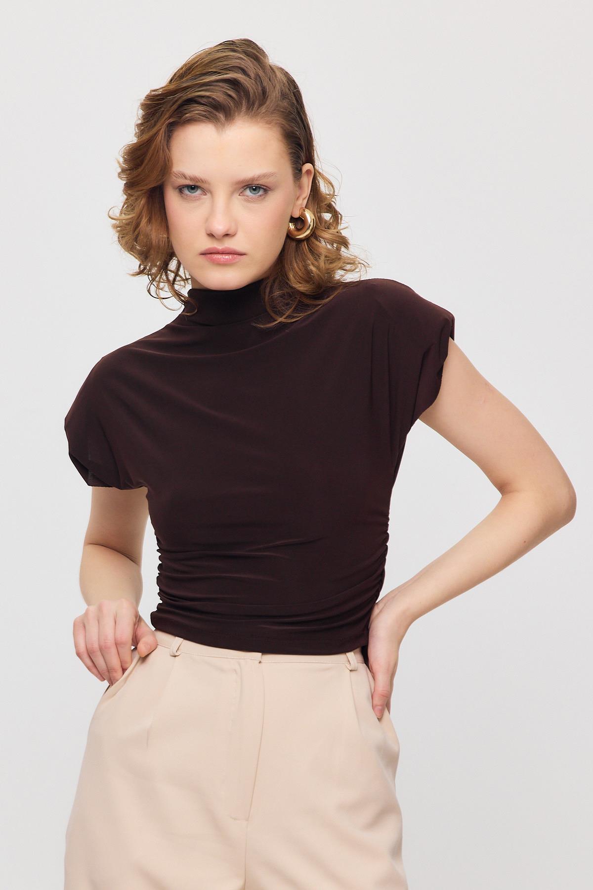 13185 Vatkalı Drapeli Kısa Kollu Bluz Kahve