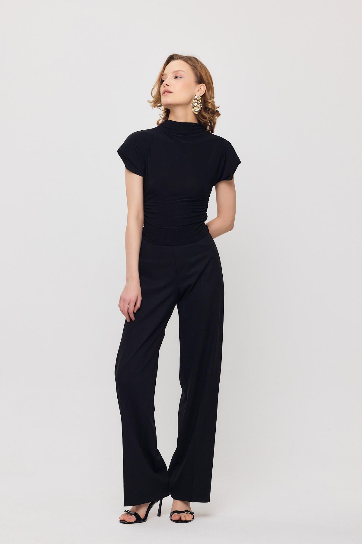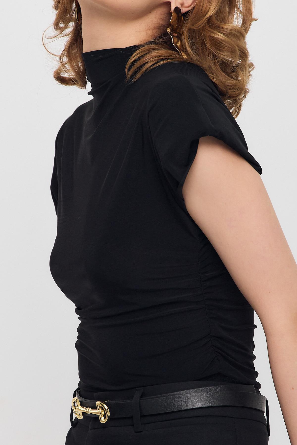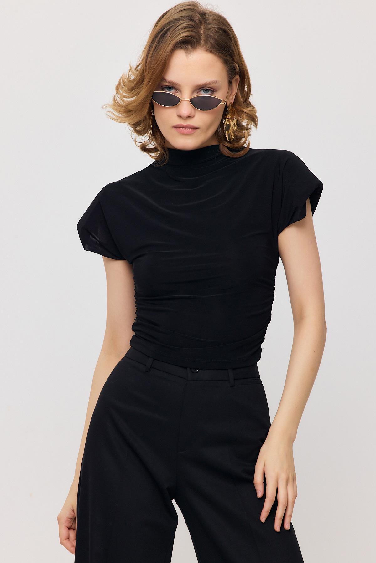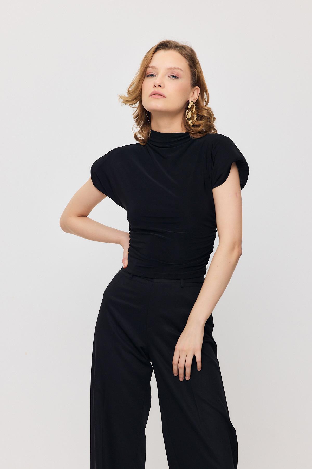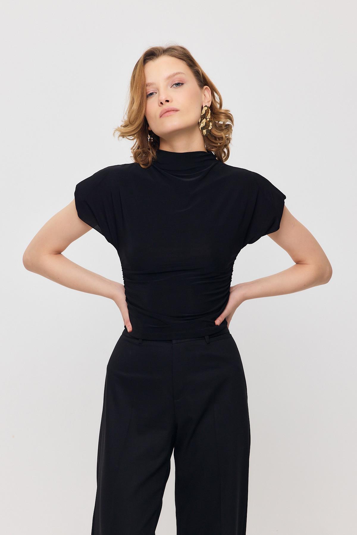 13185 Vatkalı Drapeli Kısa Kollu Bluz Siyah