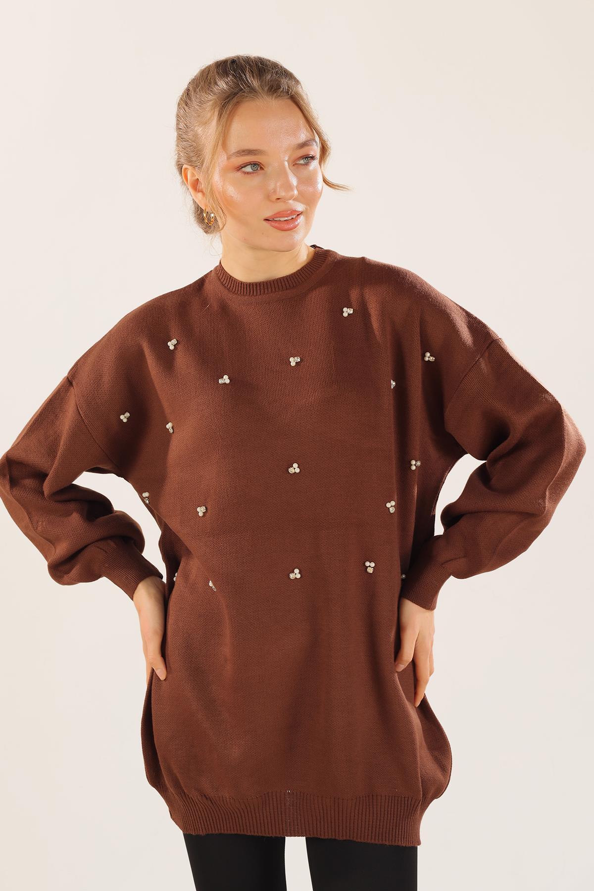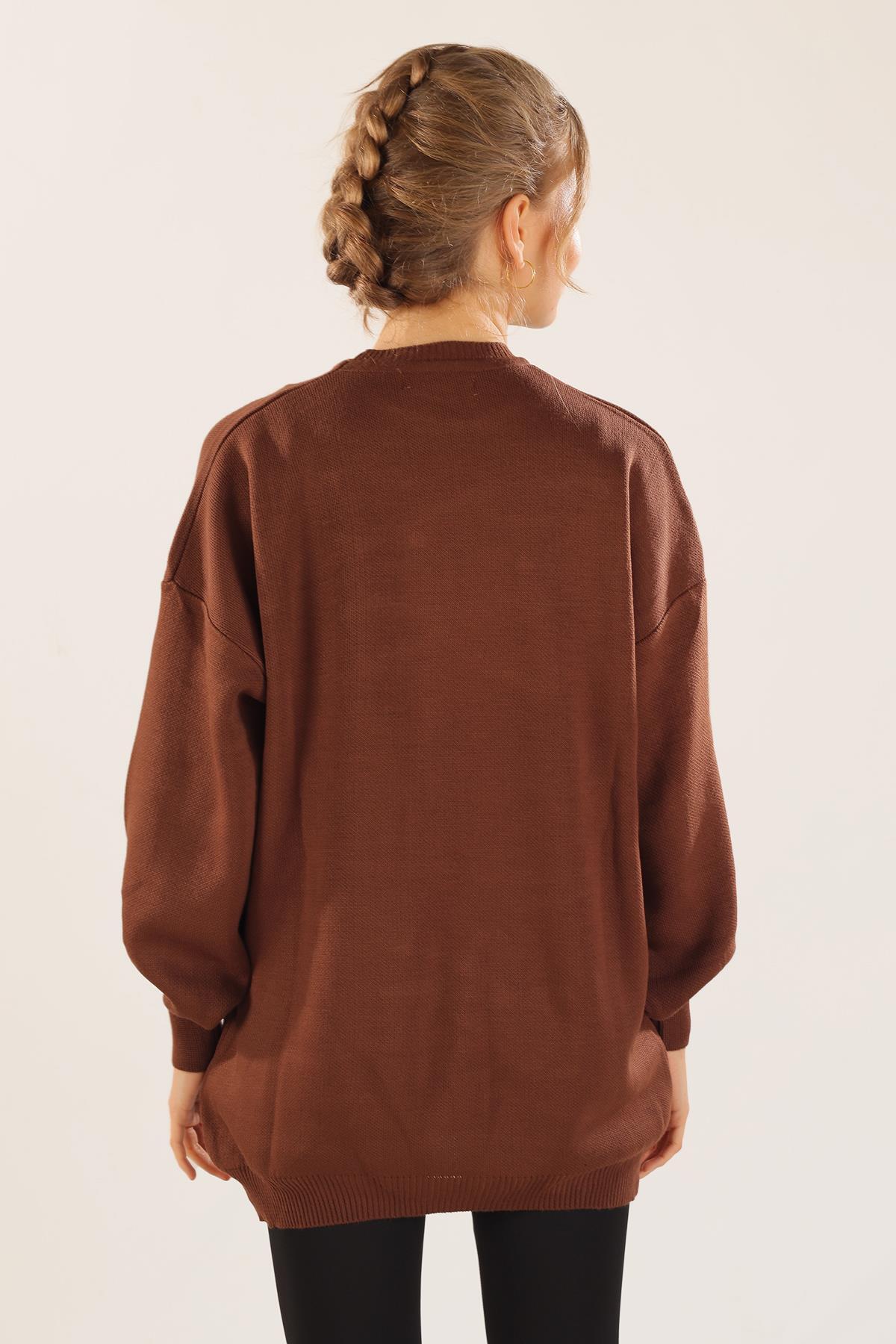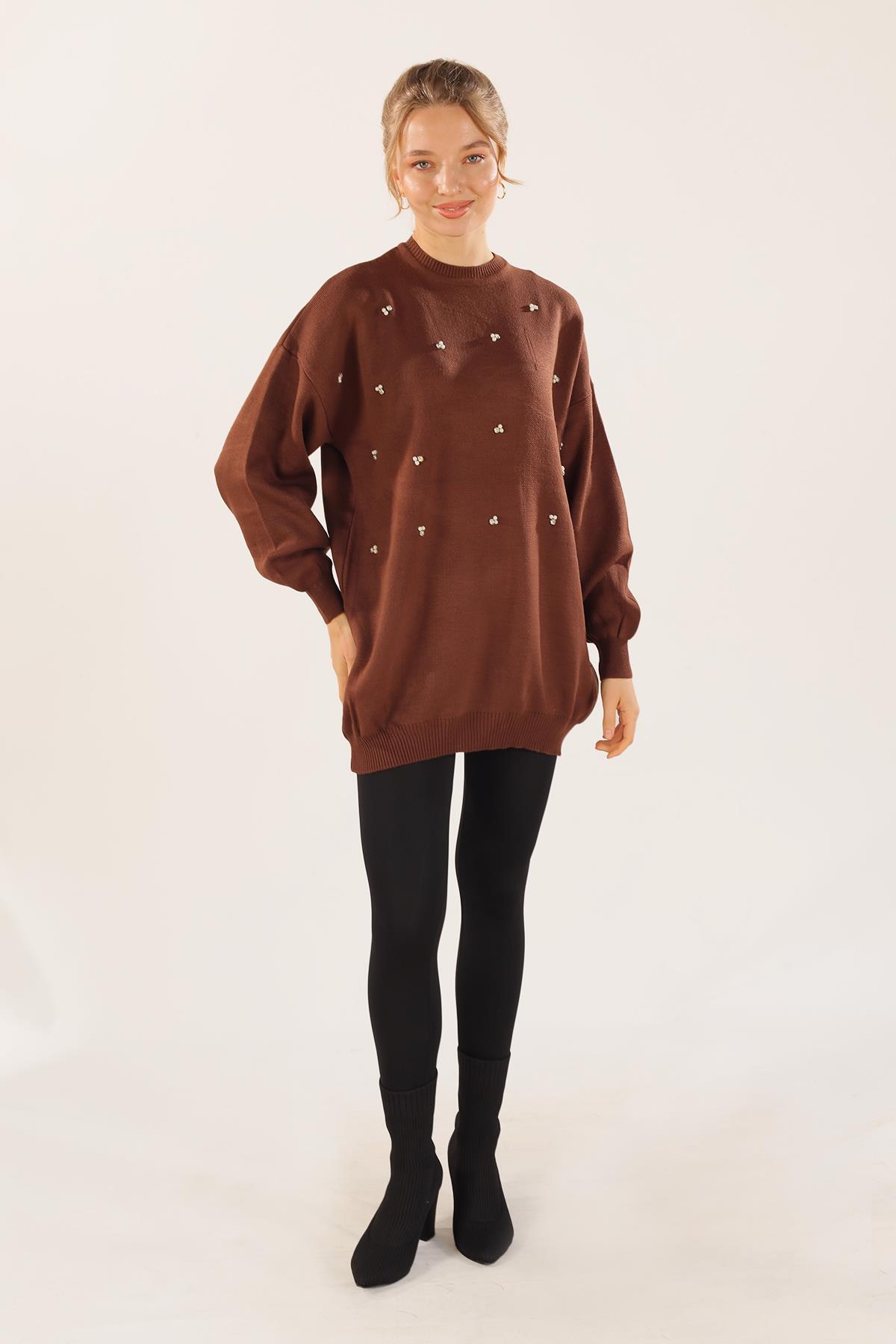 Kahve Boncuk İşlemeli Balon Kol Kazak 1335
