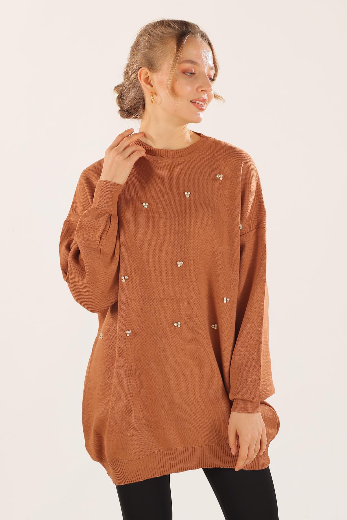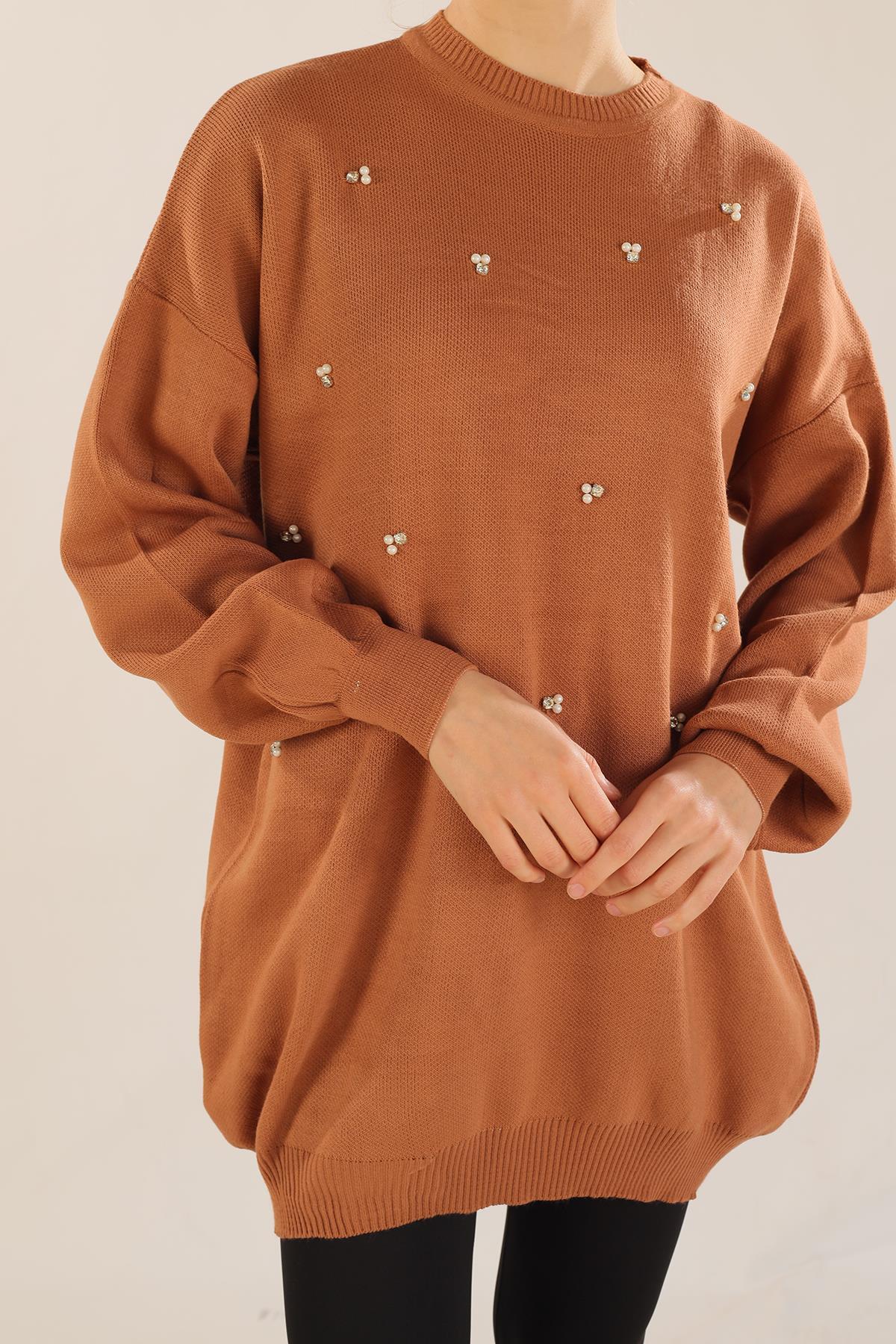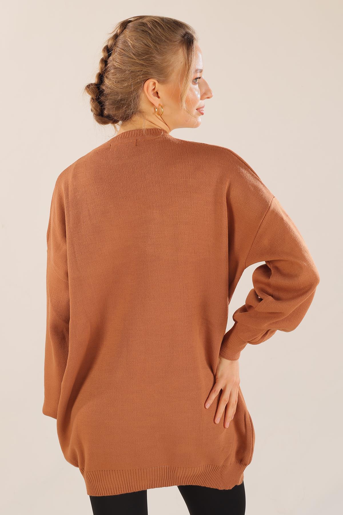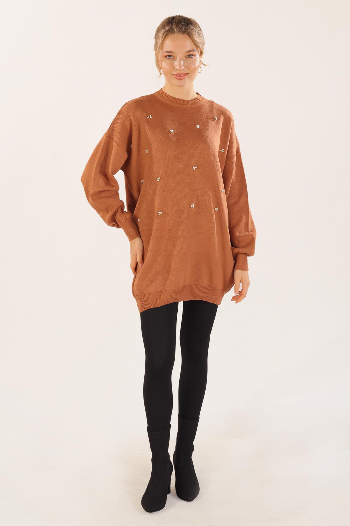 Karamel Boncuk İşlemeli Balon Kol Kazak 1335