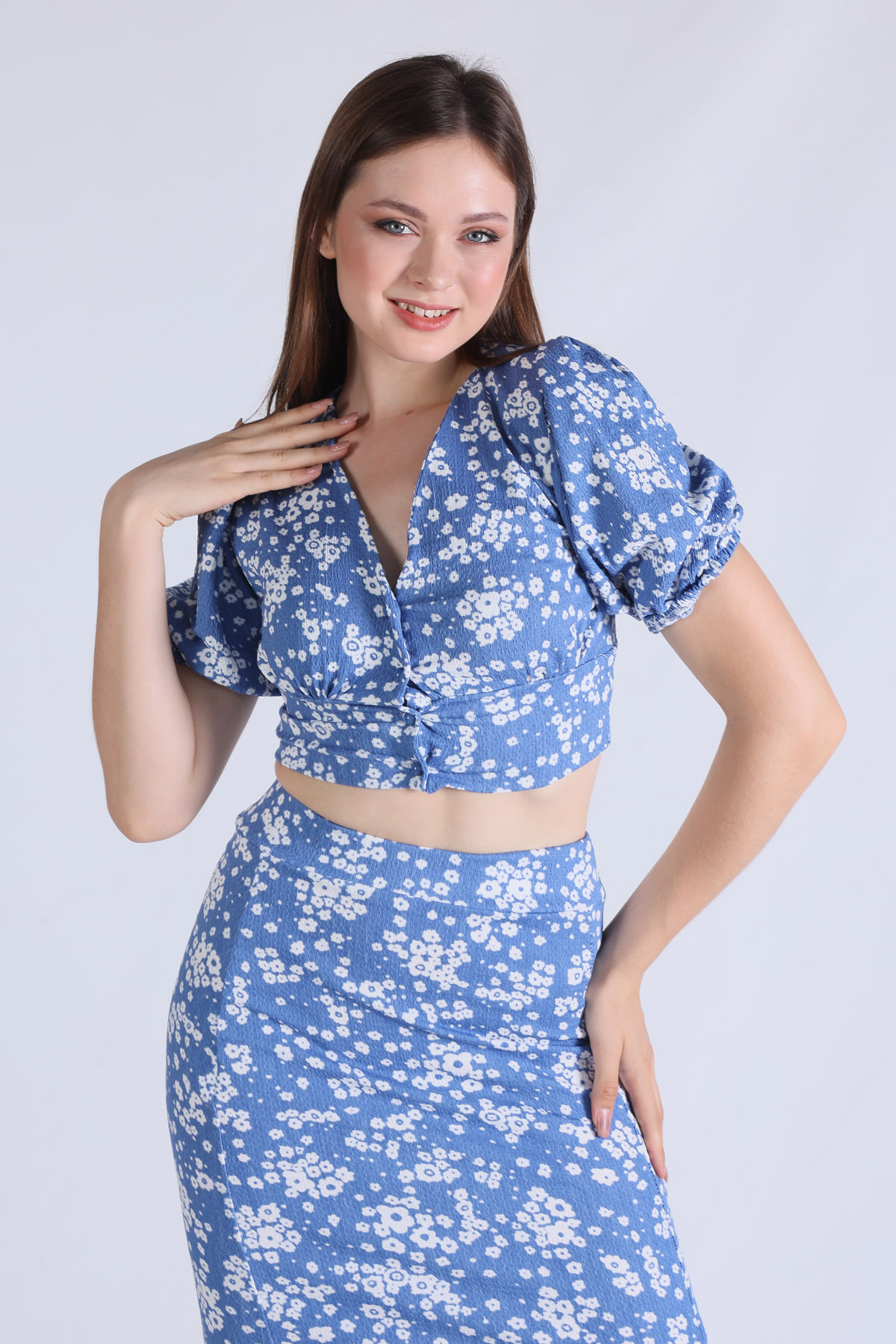 1374 Önü Düğmeli Yırtmaçlı Desenli Takım Mavi