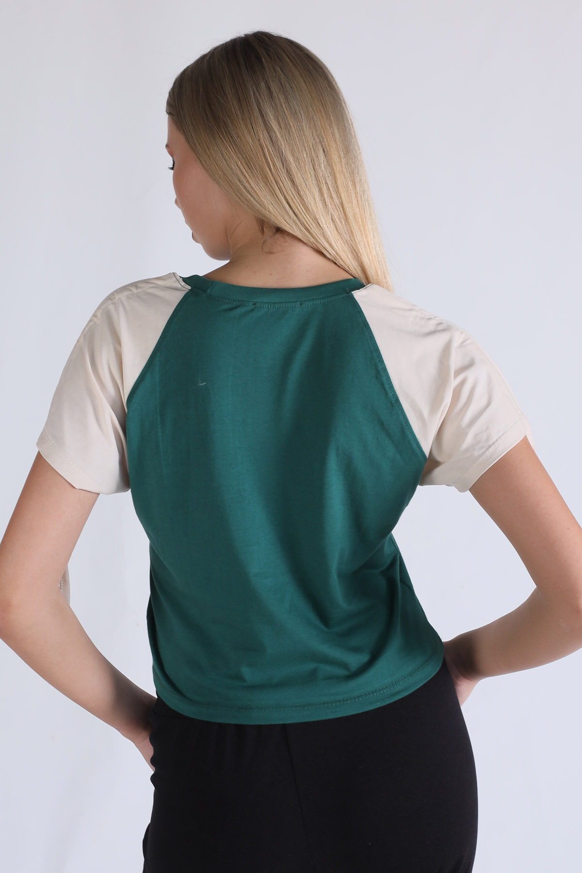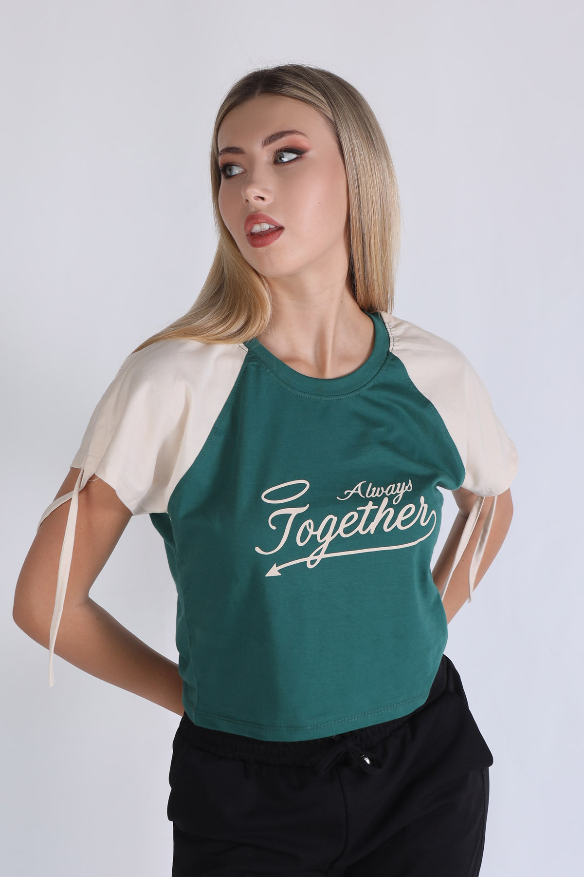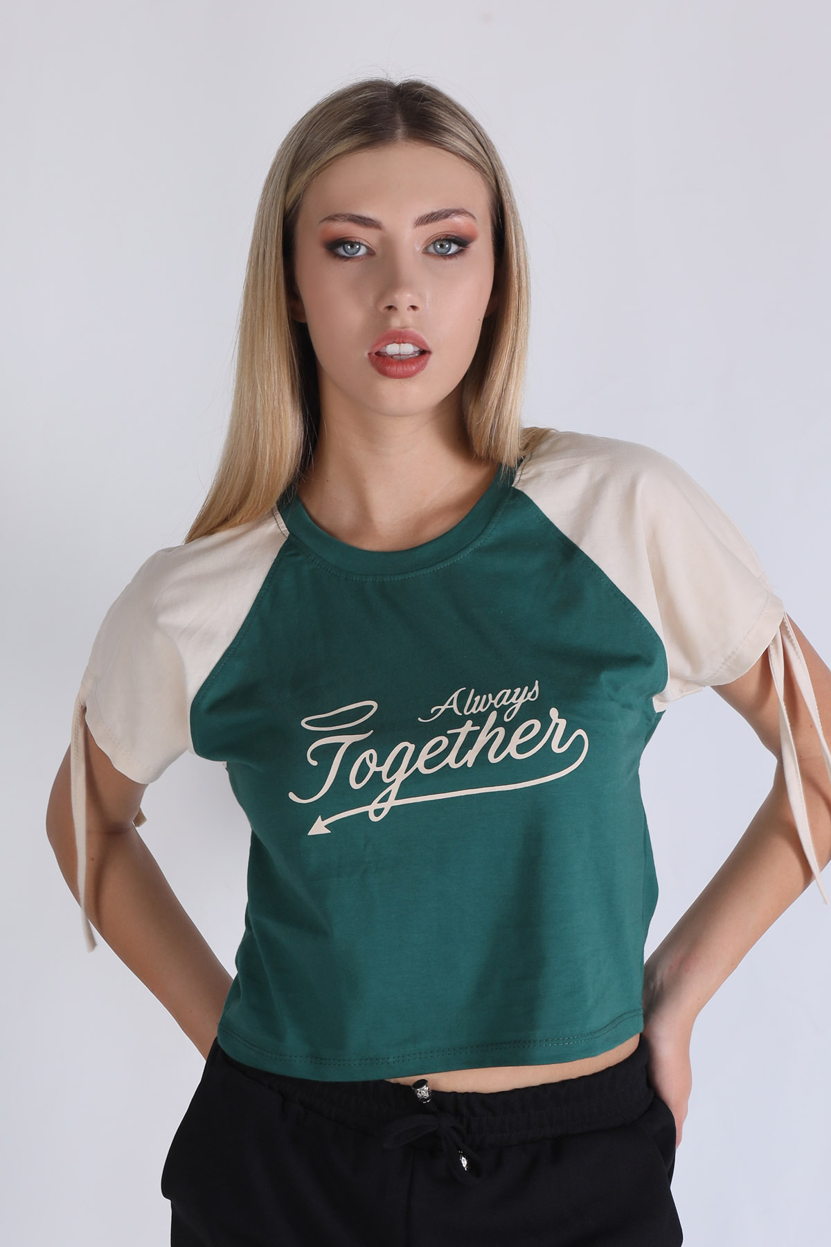 Yeşil Kol Büzgü Detay Crop Tişört 1436