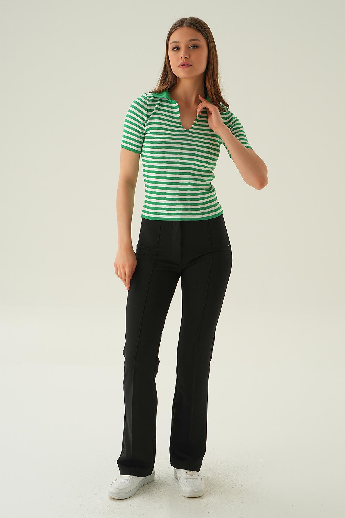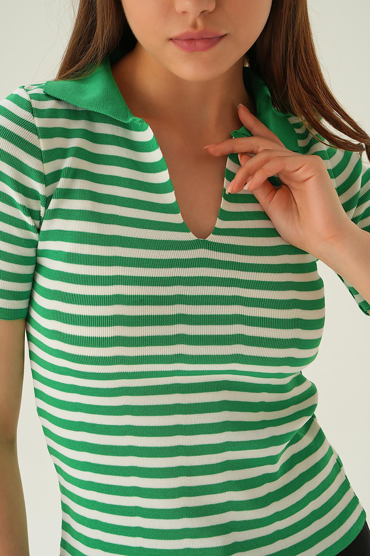 Benetton Yeşili V Yaka Çizgili Tişört 1456
