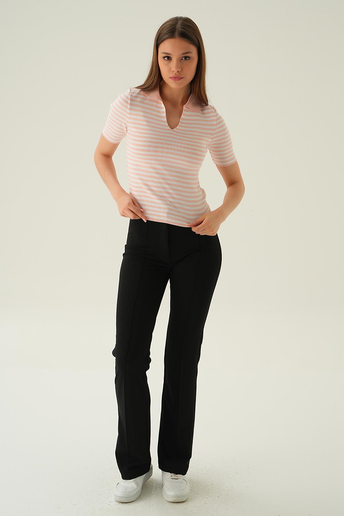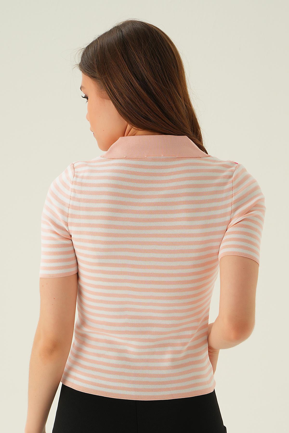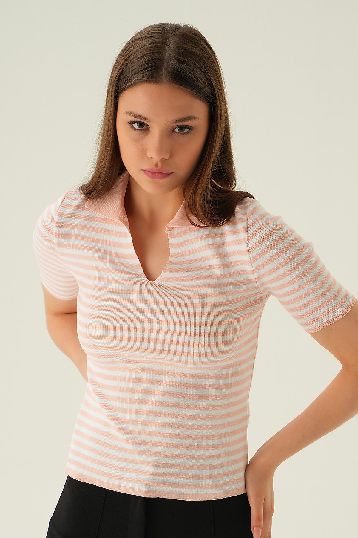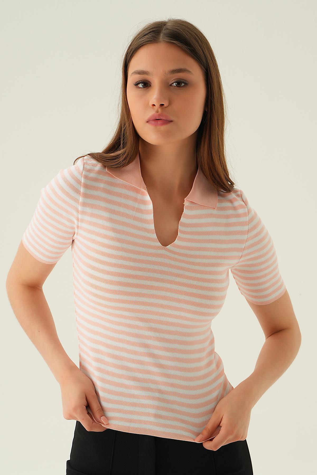 Pudra V Yaka Çizgili Tişört 1456