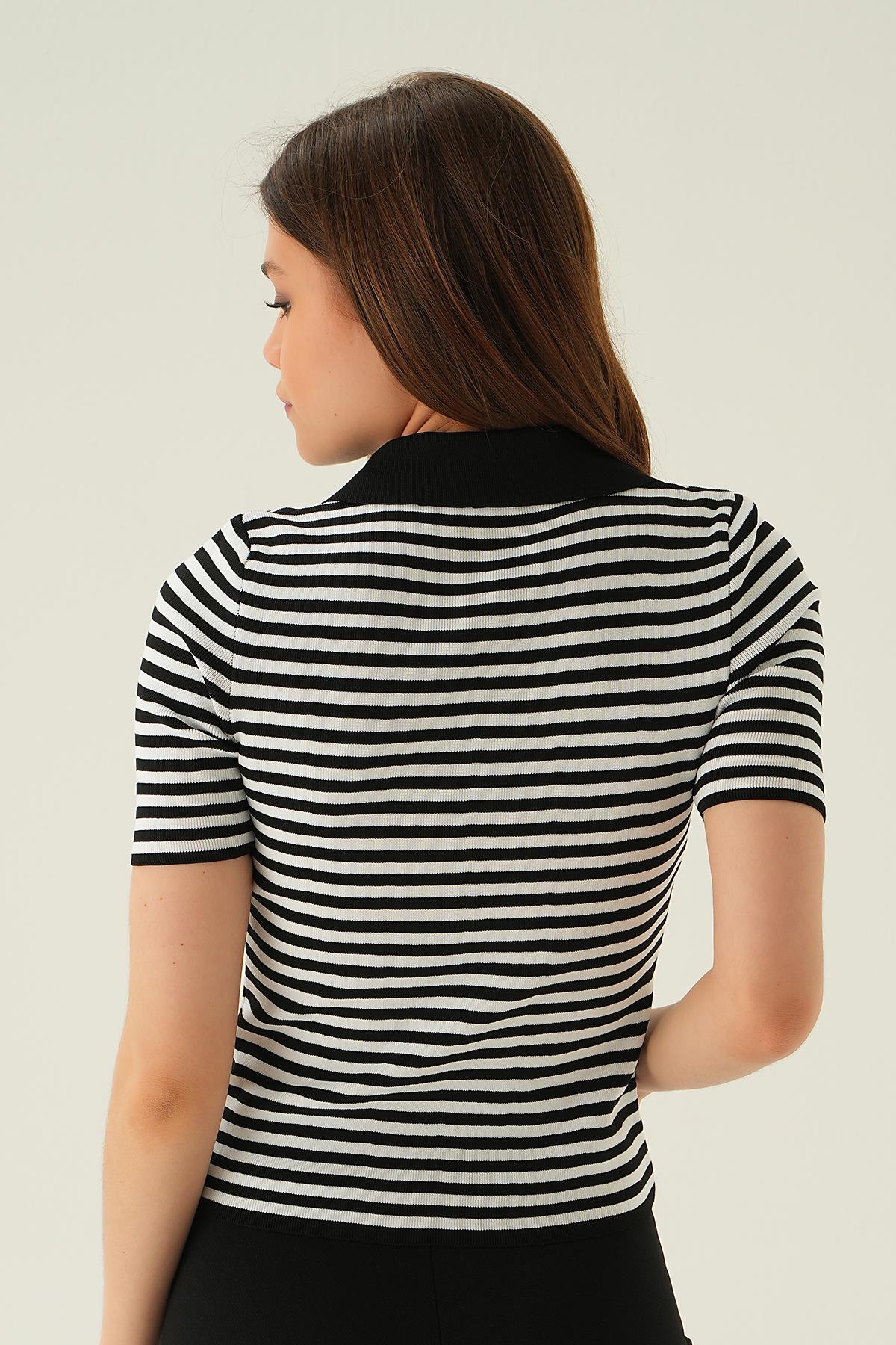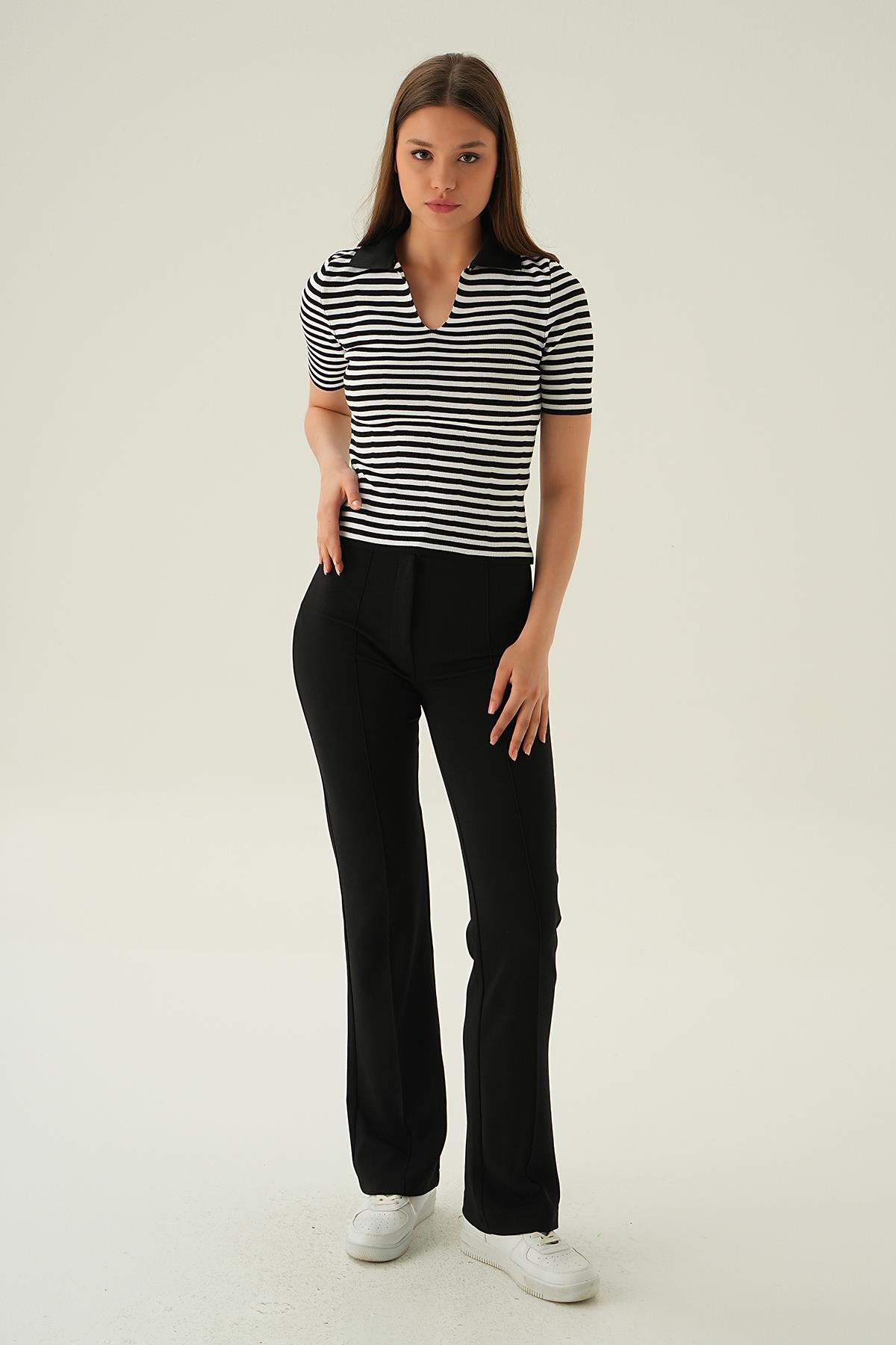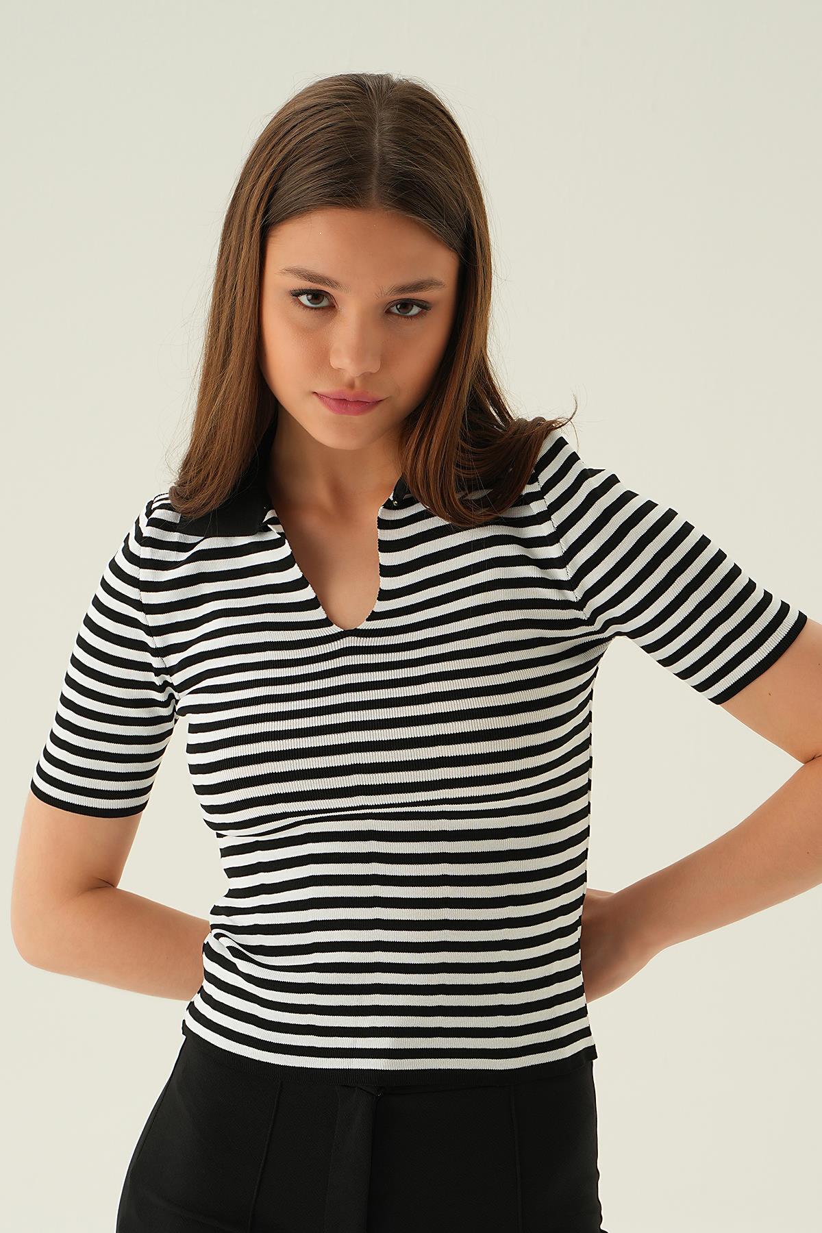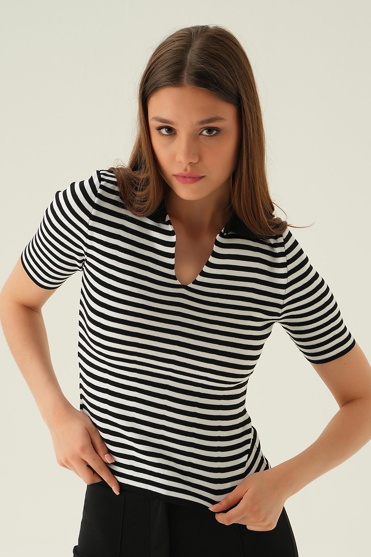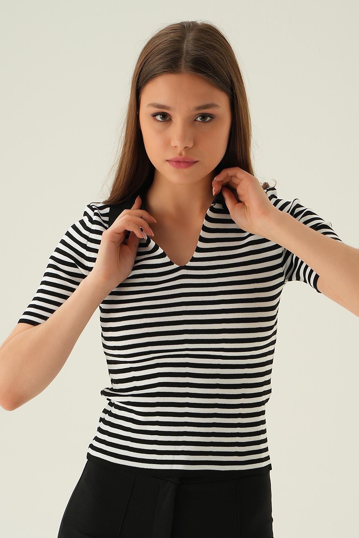 Siyah V Yaka Çizgili Tişört 1456