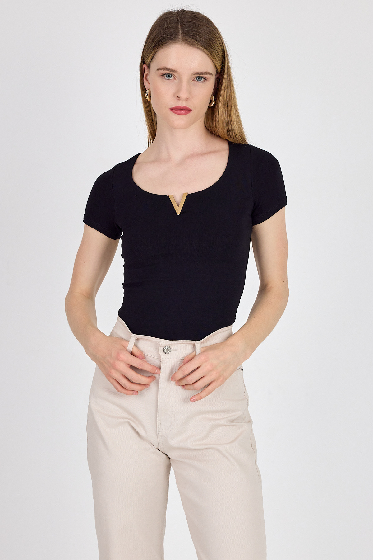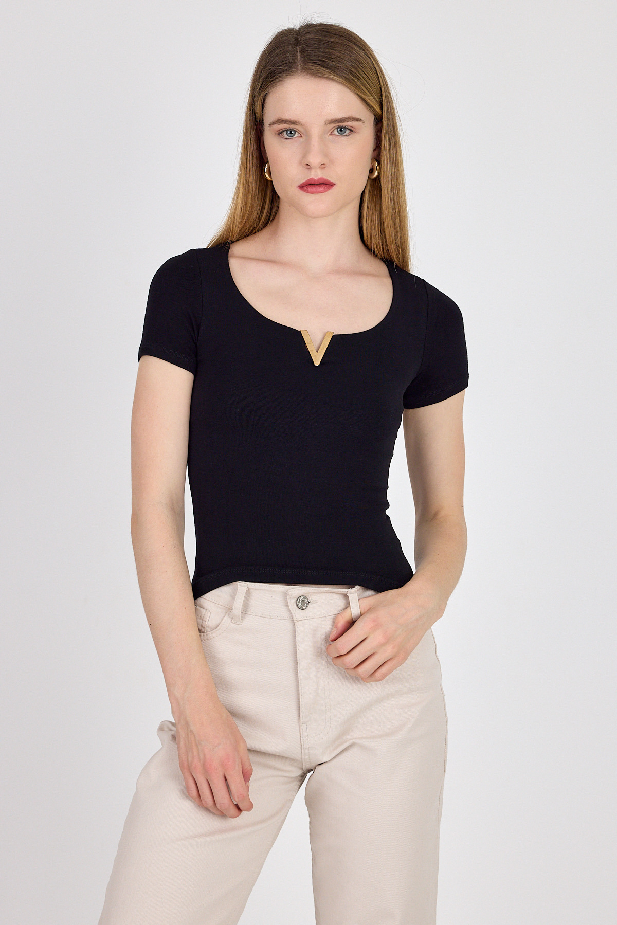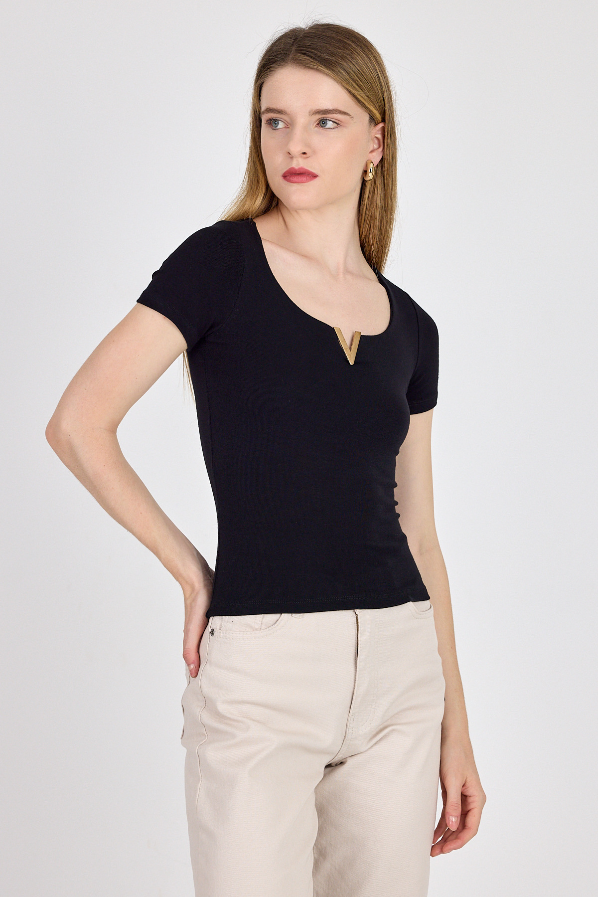 Siyah Gold Aksesuar Detaylı Viskoz/Yumuşak Kumaş Tişört 1460