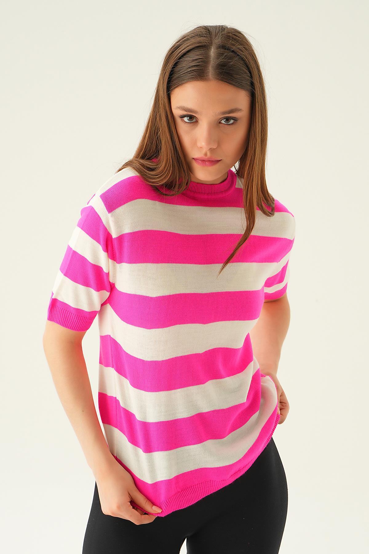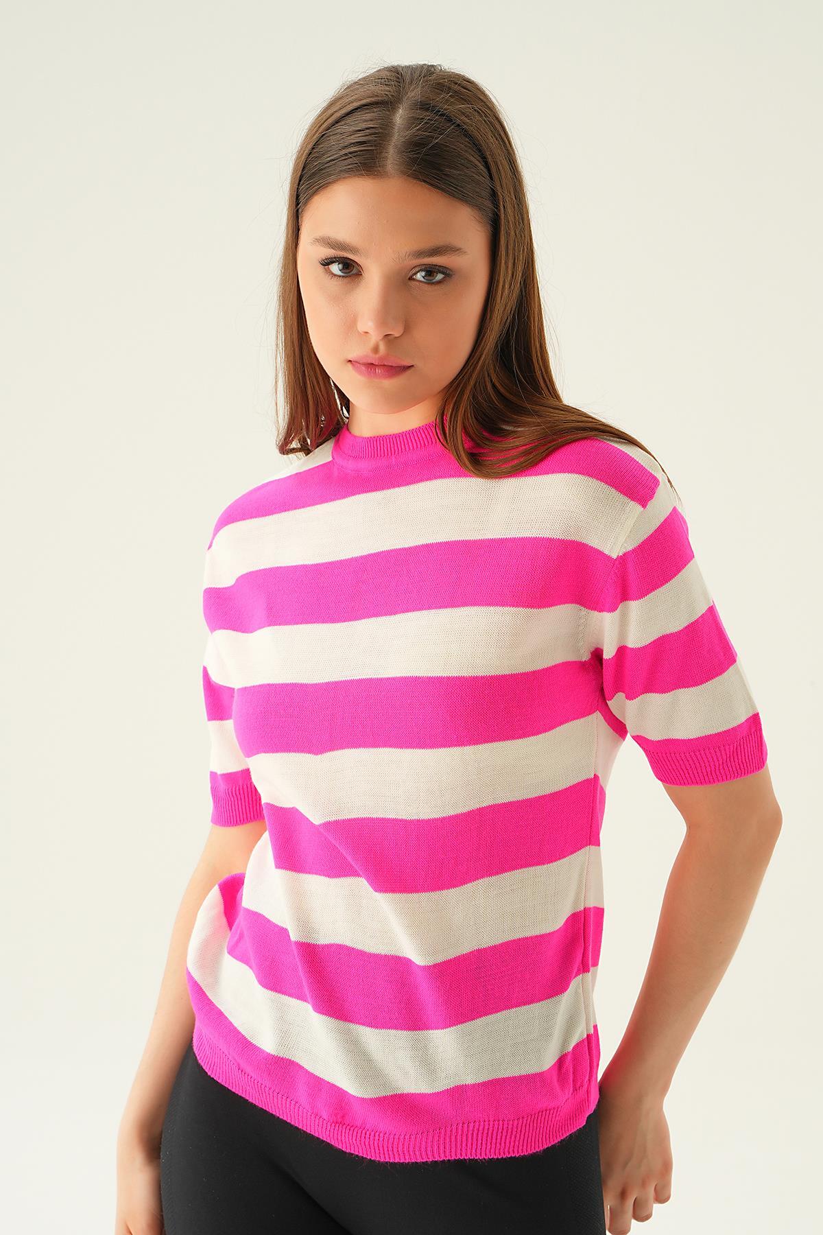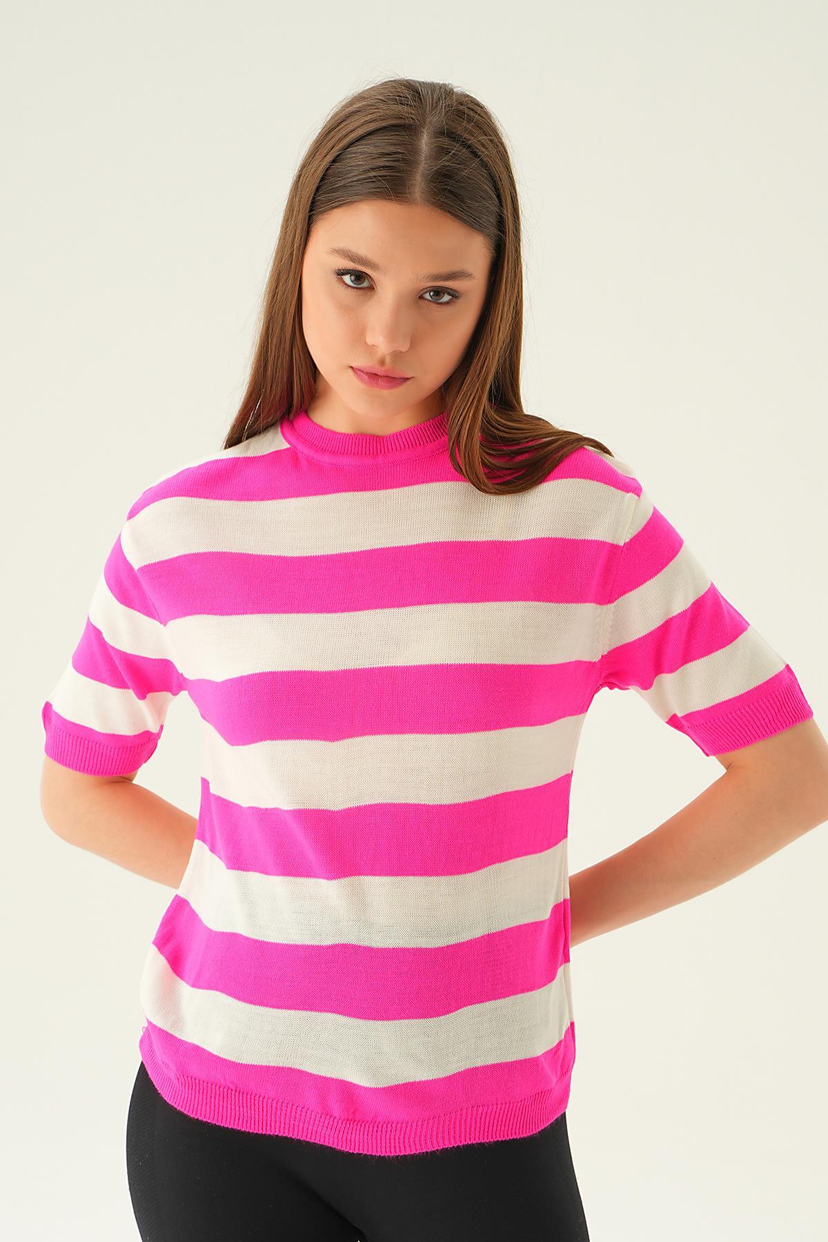 Fuşya Kalın Çizgili Tişört 1461