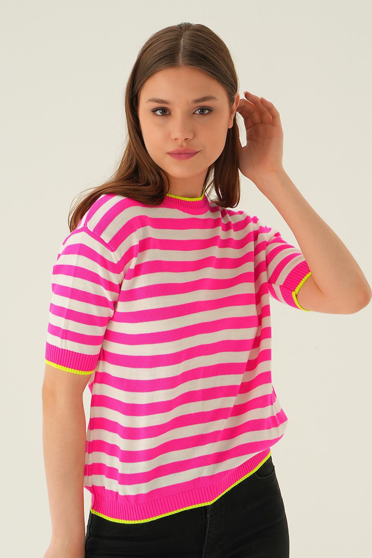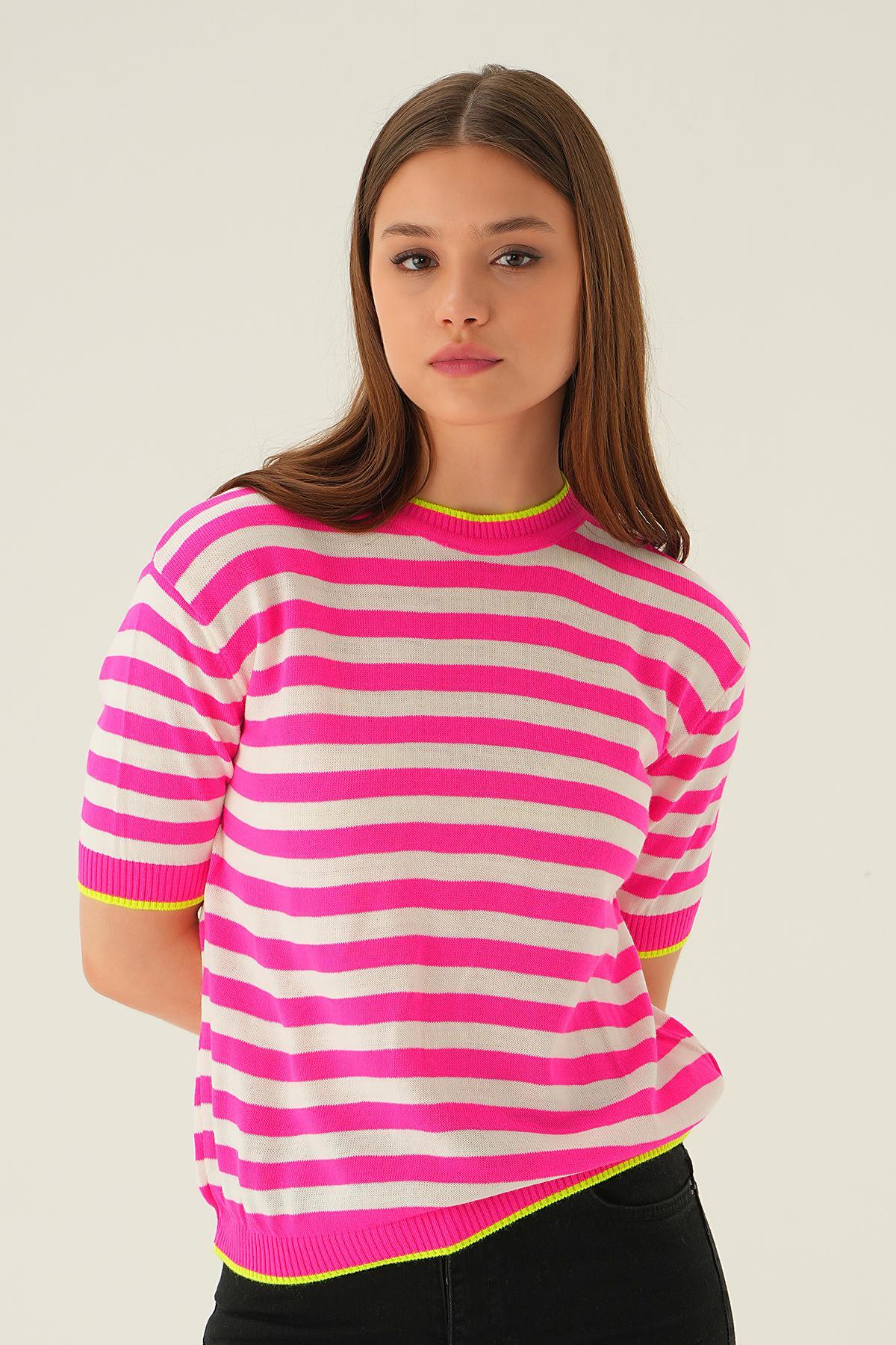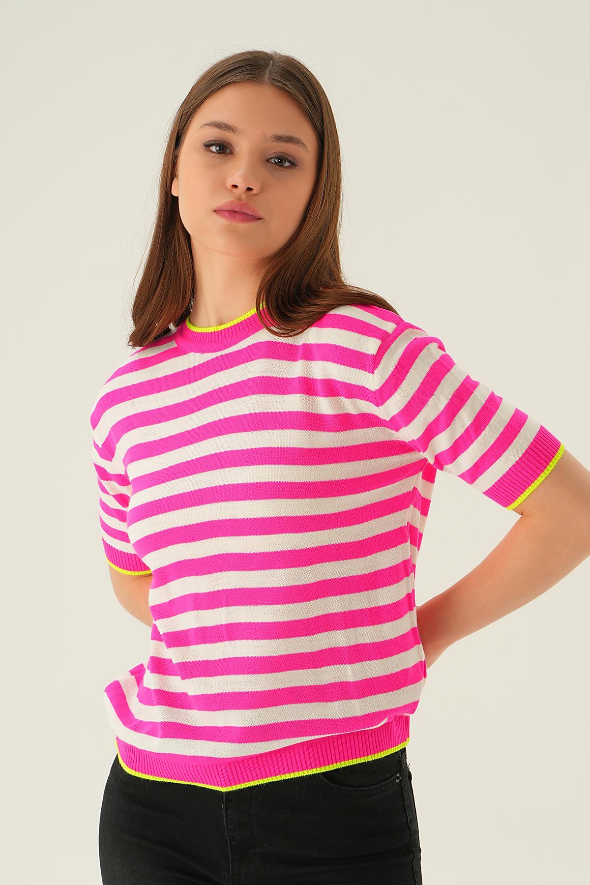 Fuşya Bisiklet Yaka Çizgili Tişört 1469