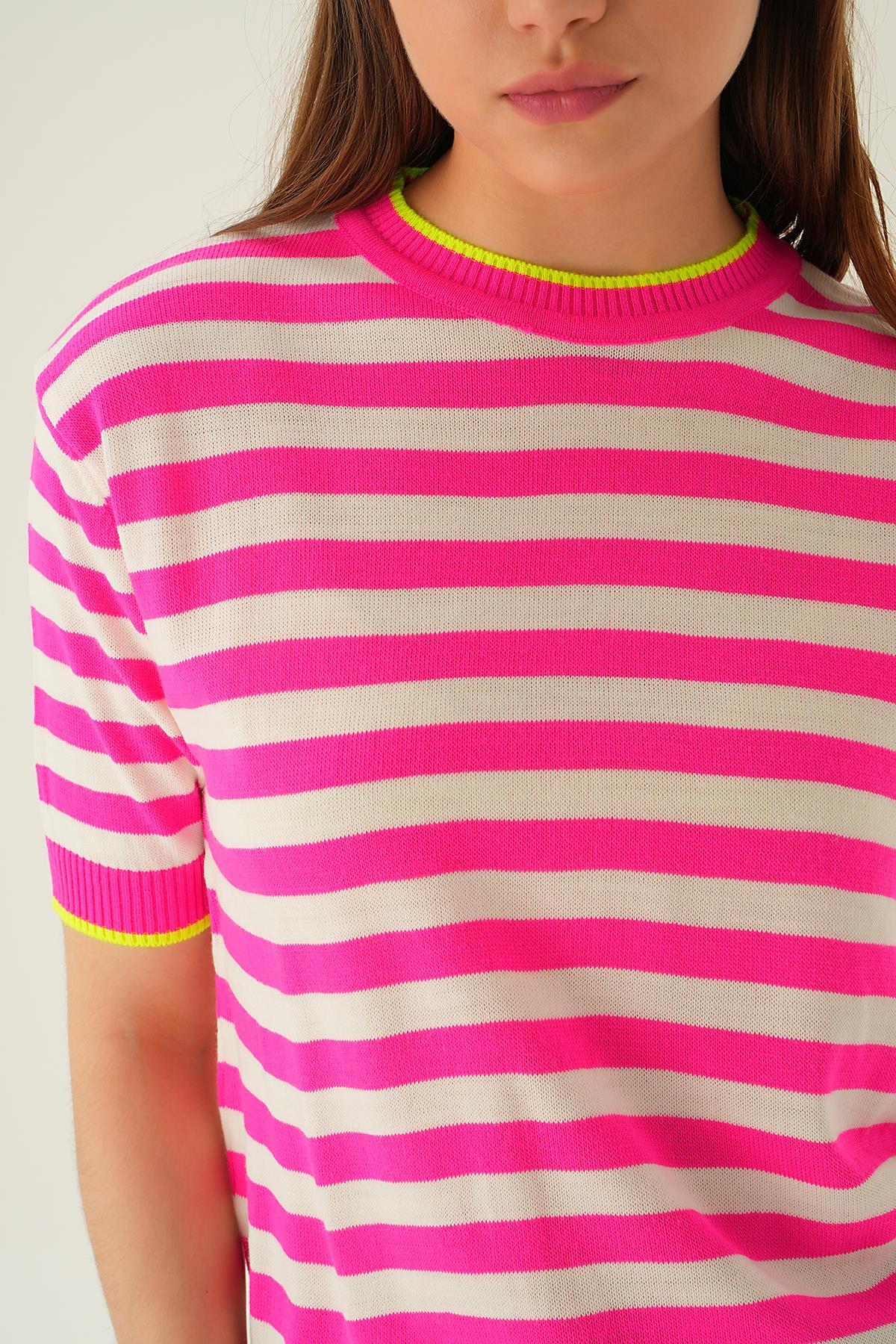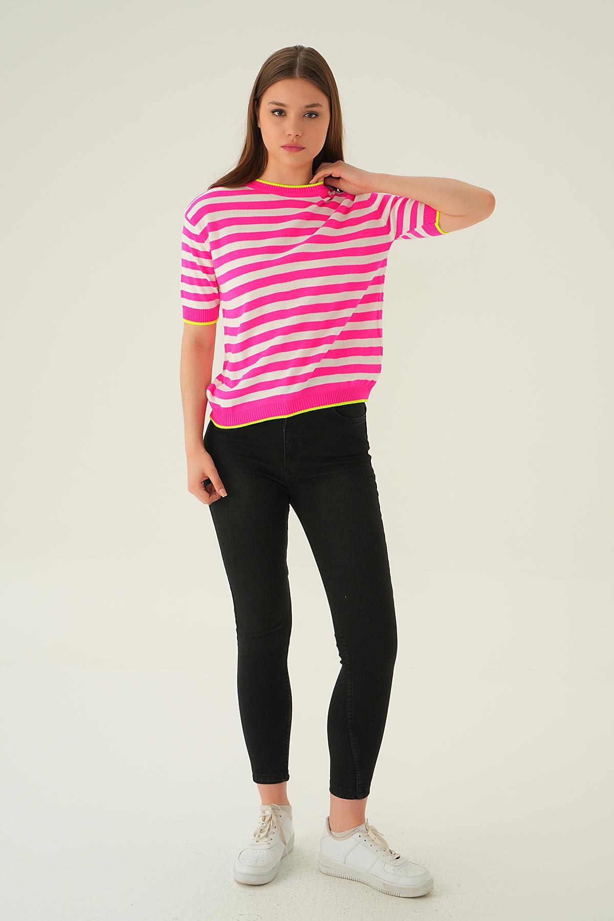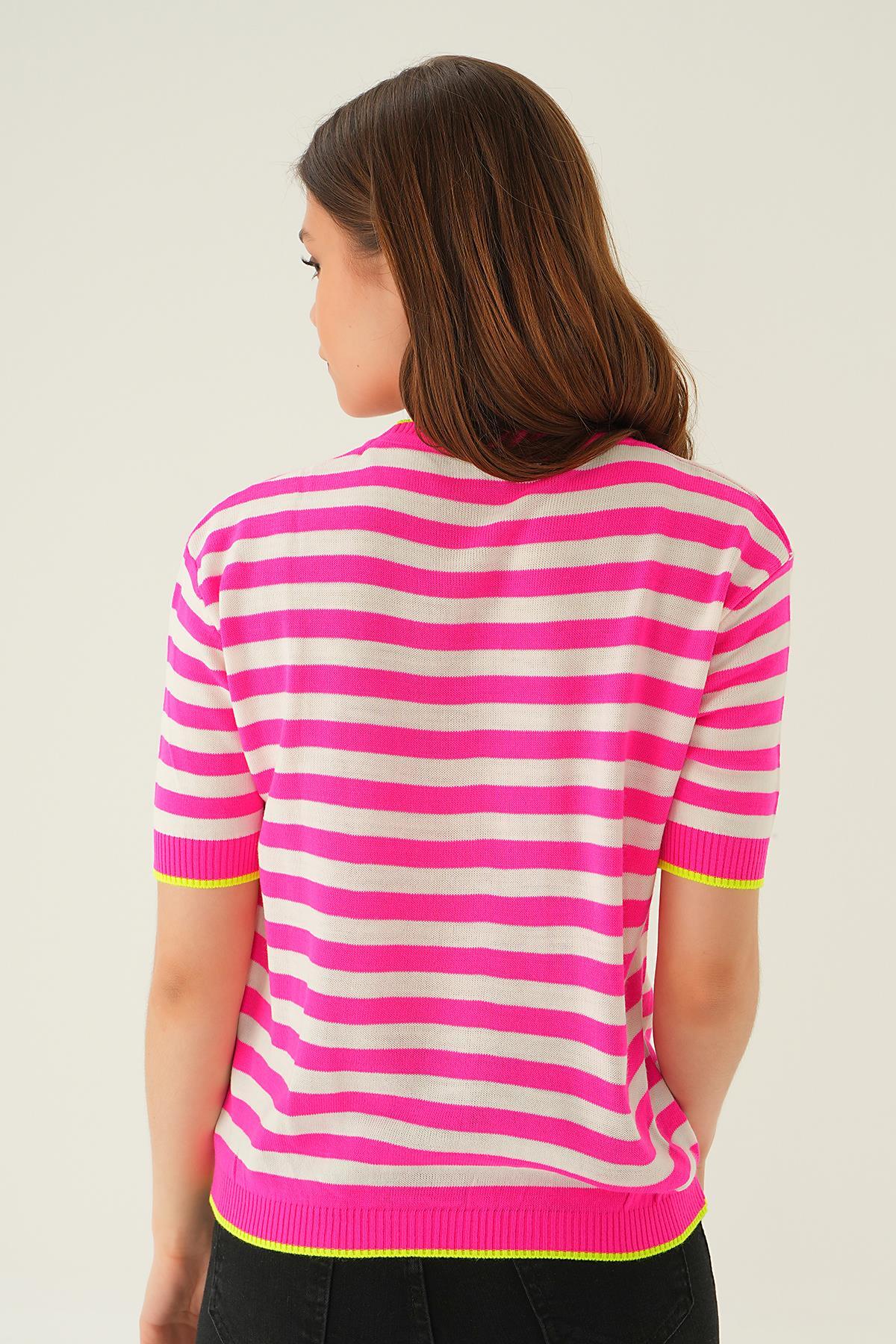 Fuşya Bisiklet Yaka Çizgili Tişört 1469
