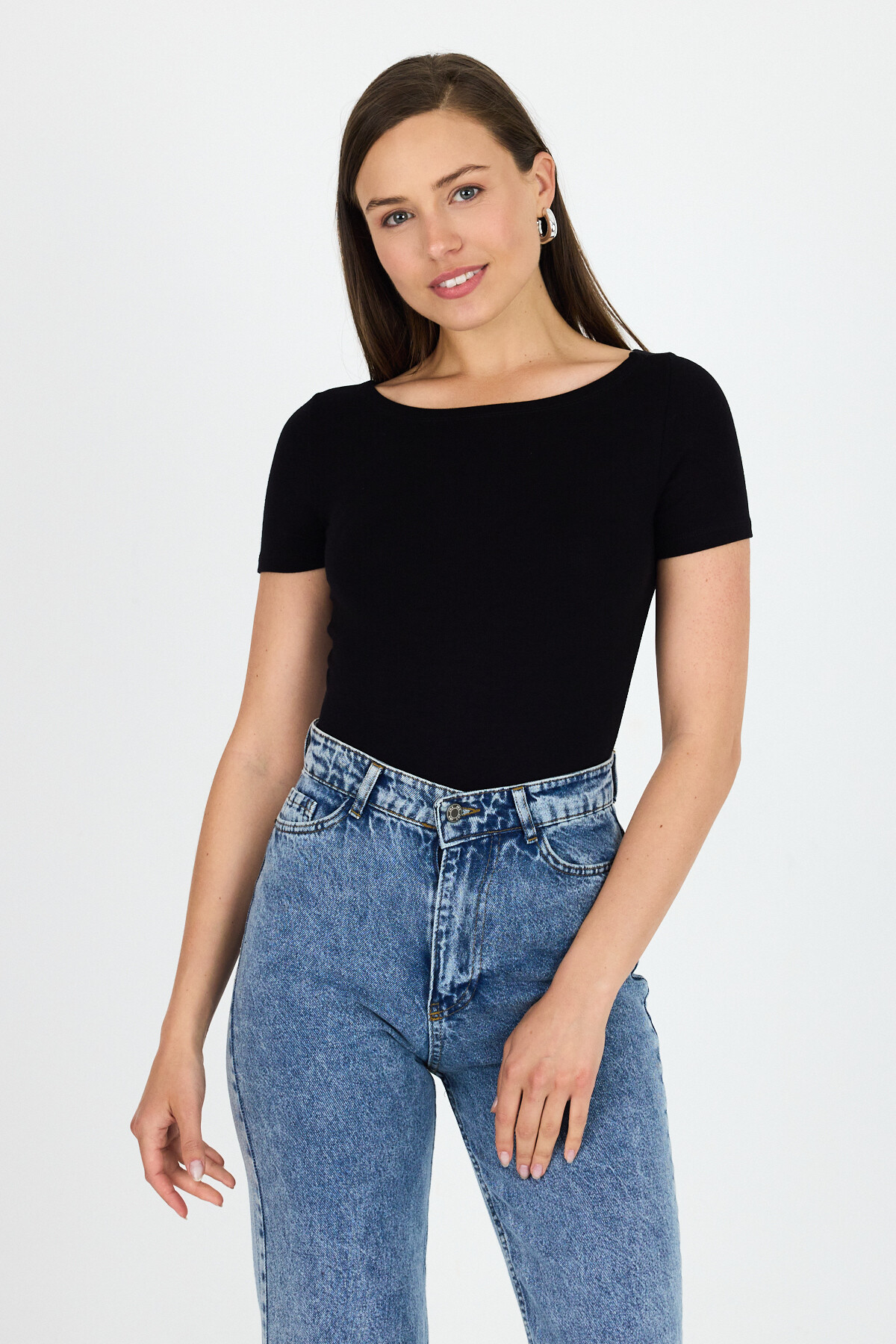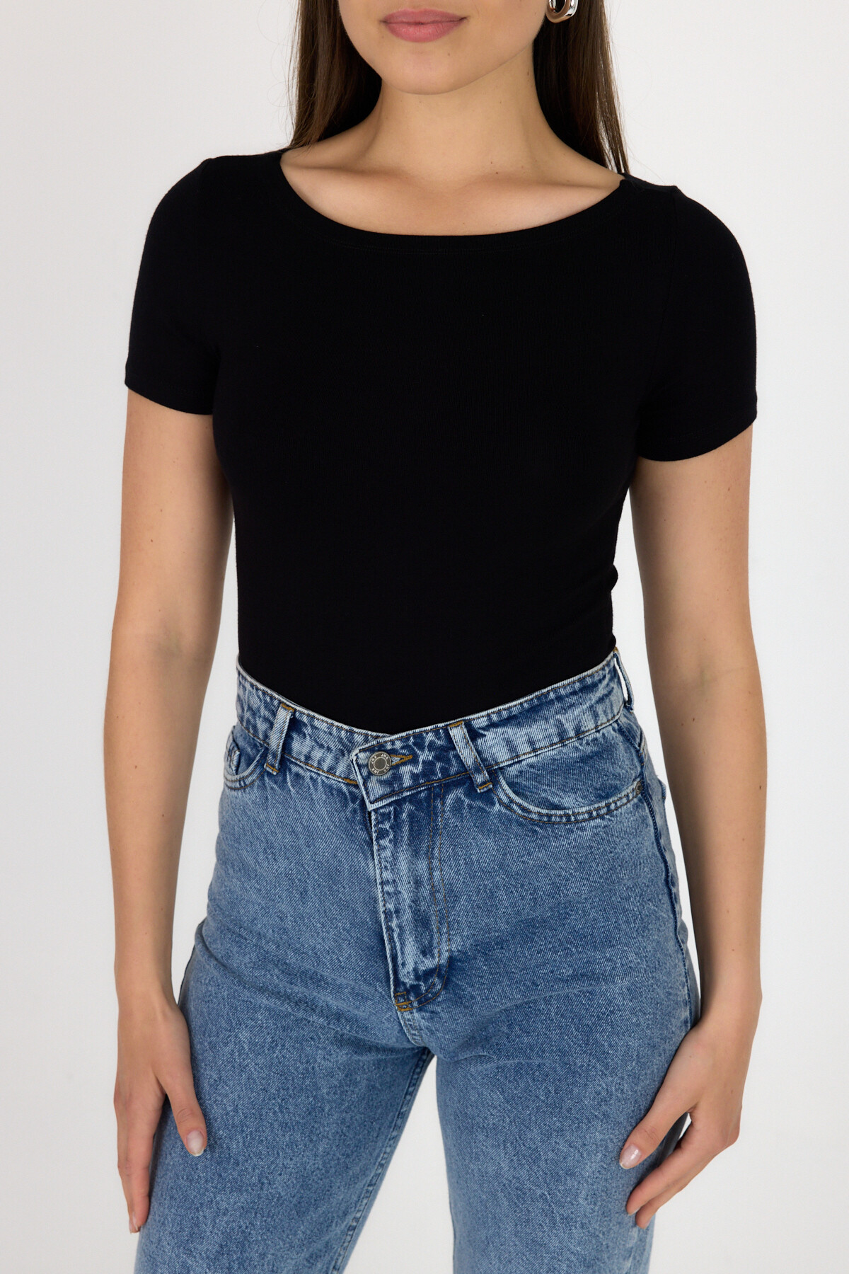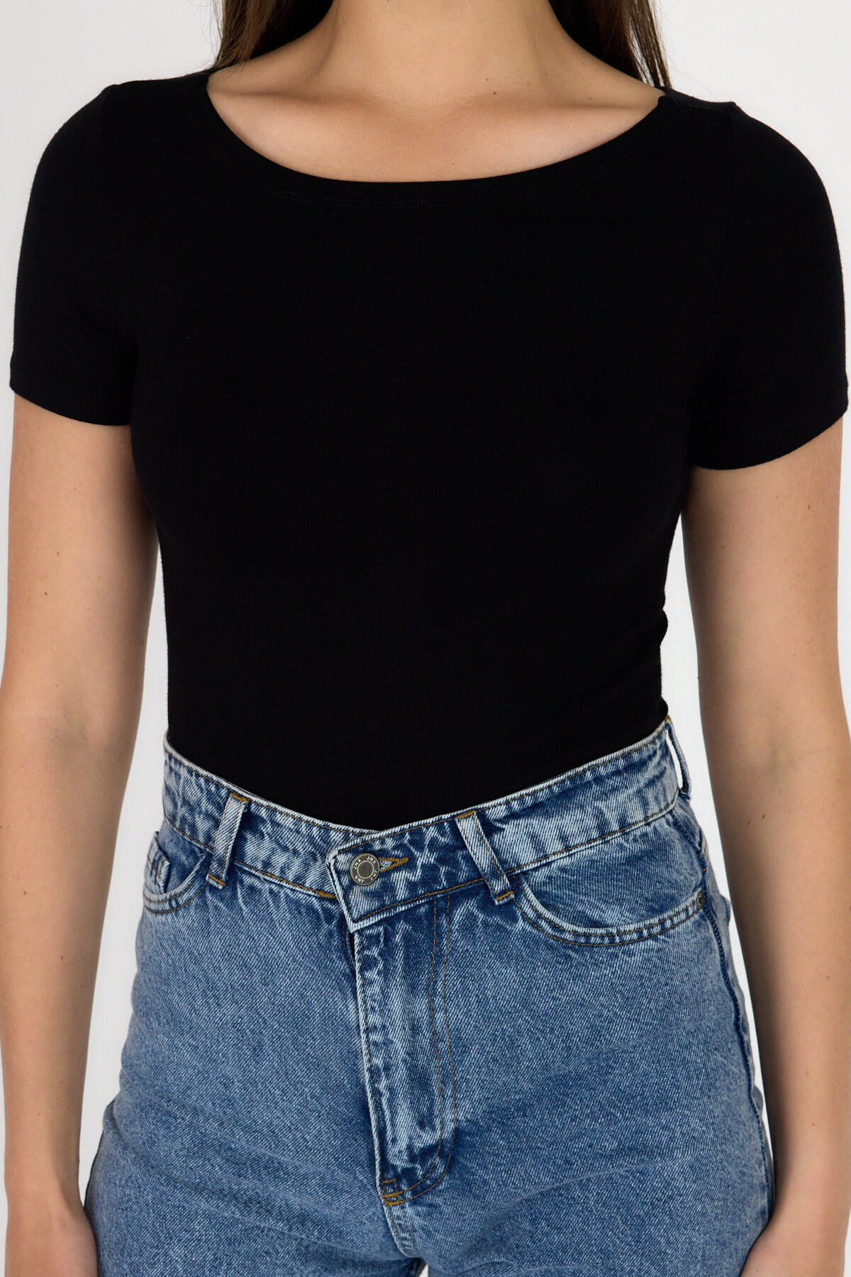 Siyah Bisiklet Yaka Viskoz/Yumuşak Kumaş Tişört 1469