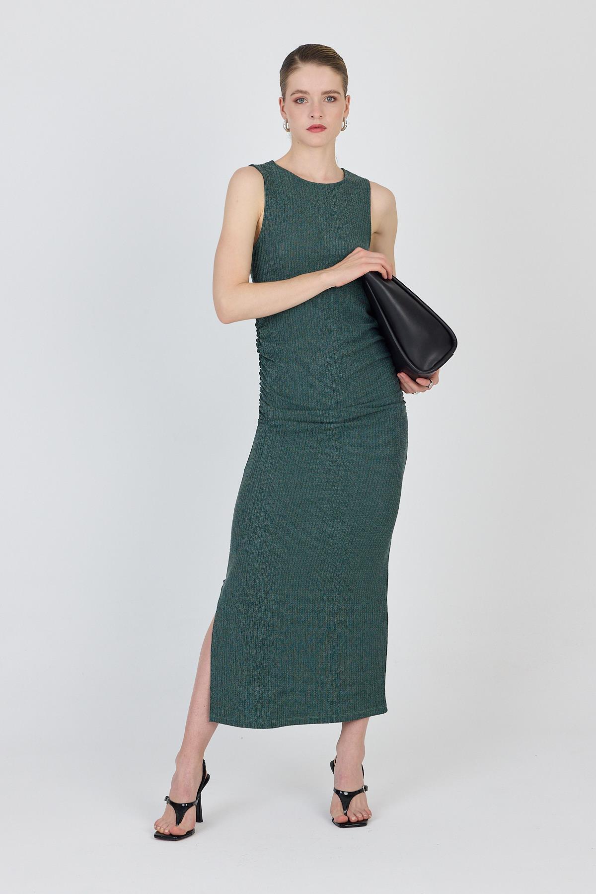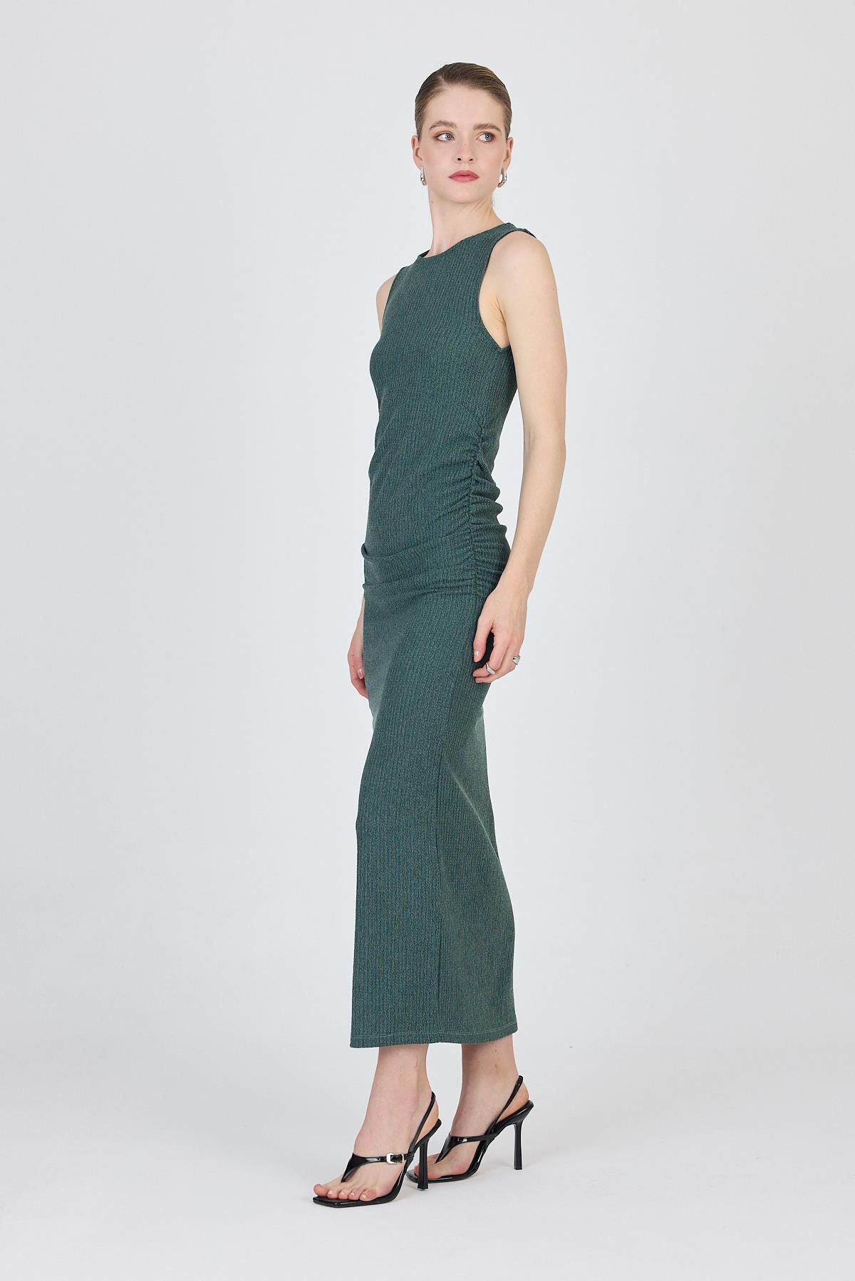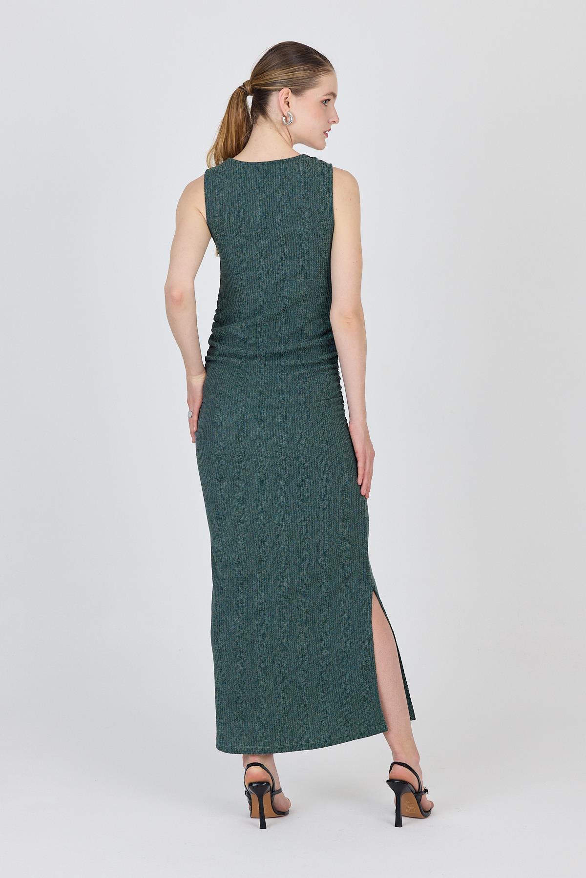 Yeşil Bisiklet Yaka Yanları Büzgülü Uzun Elbise 1489