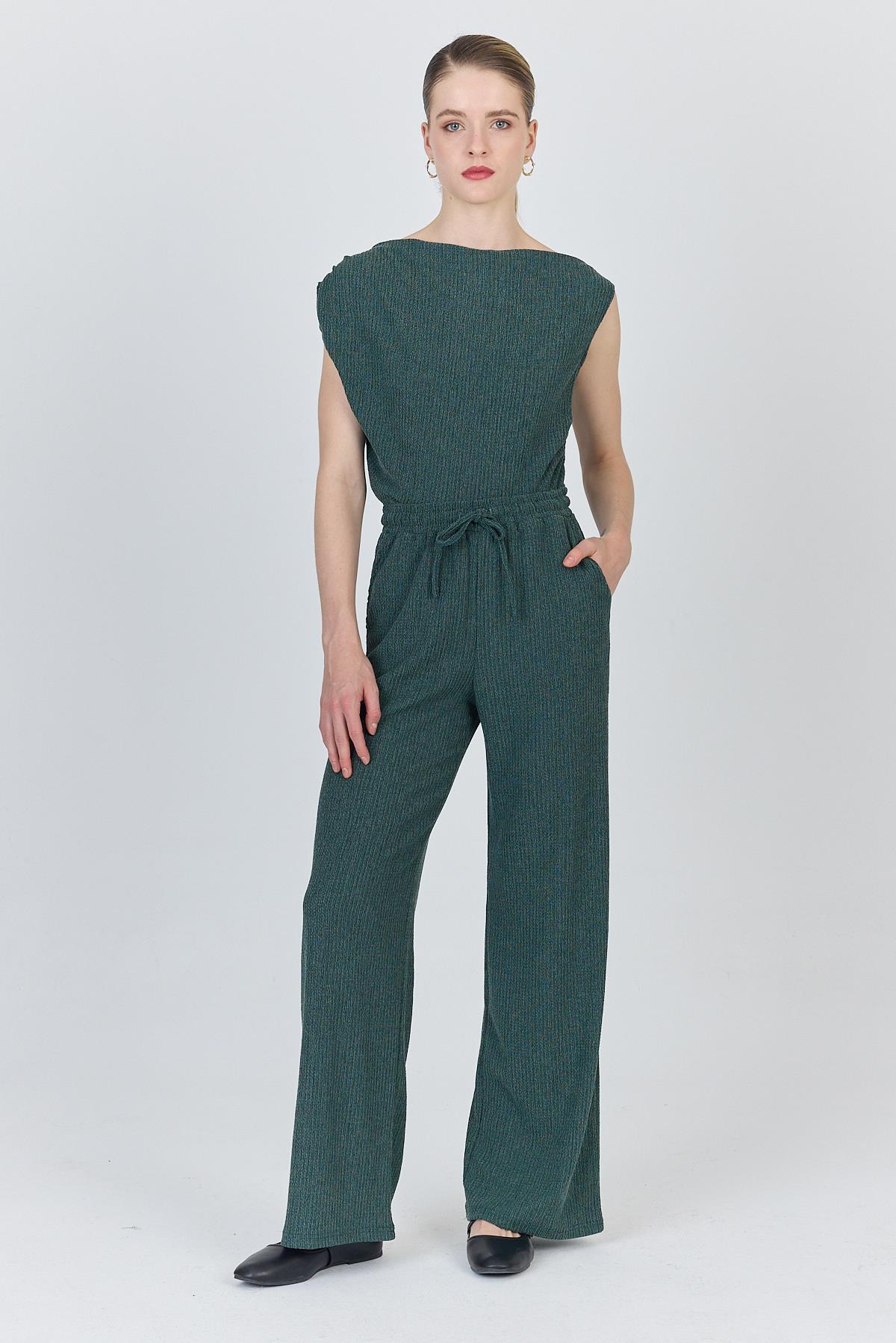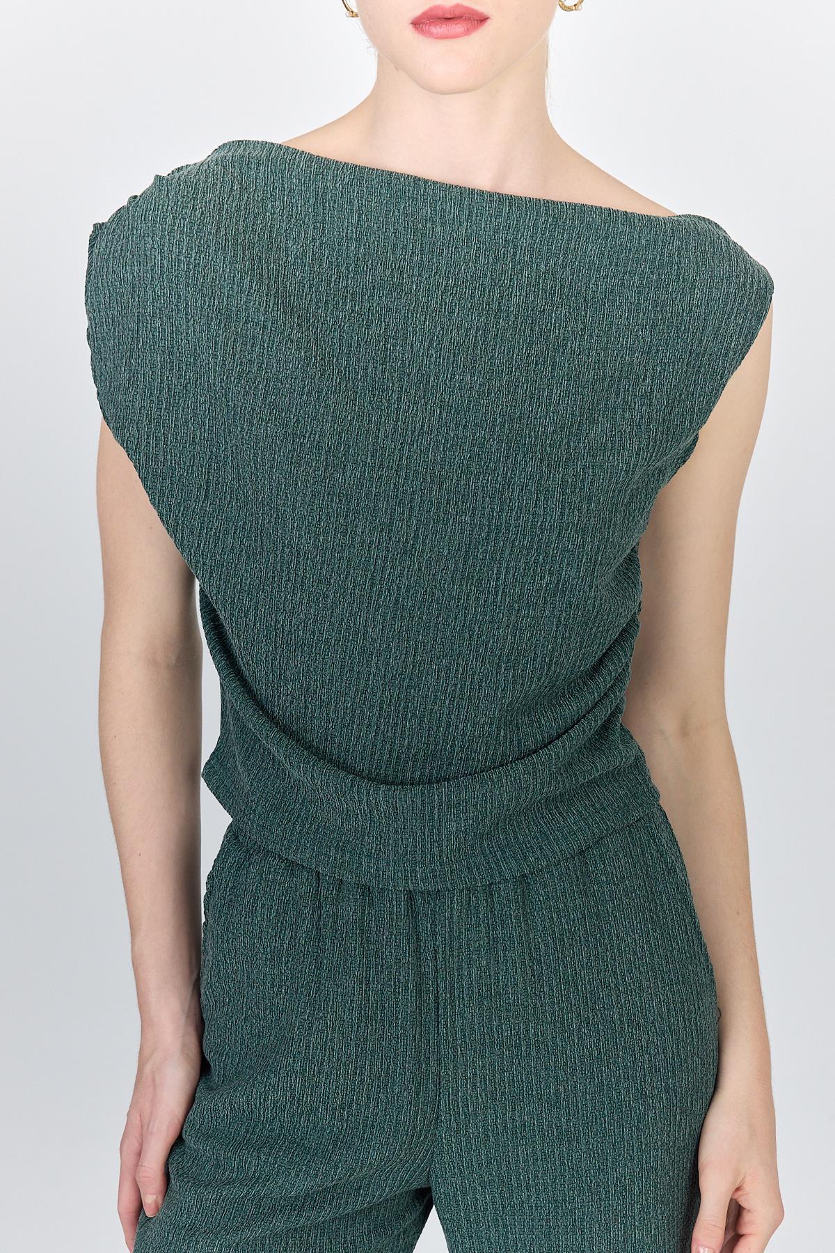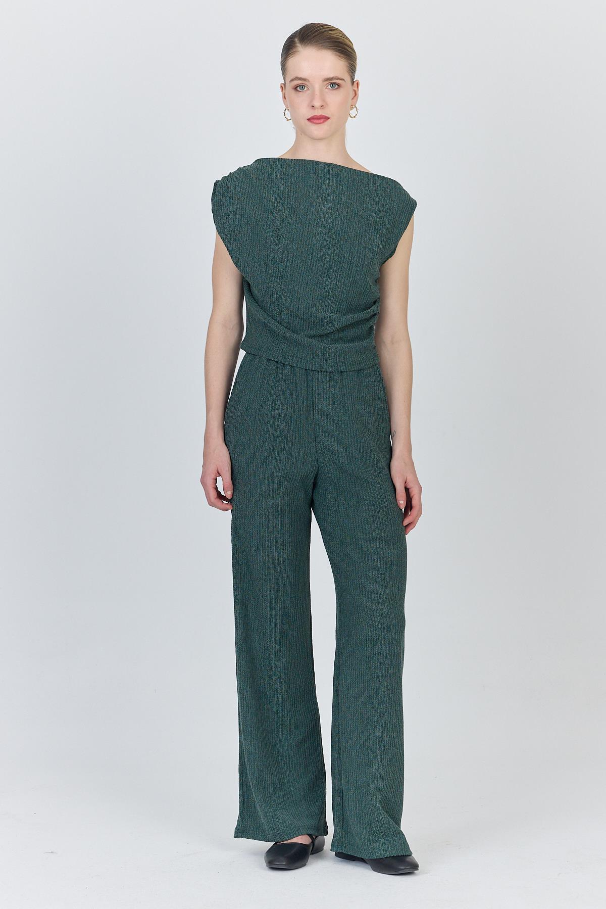 Yeşil Asimetrik Omuz Detaylı Bluz ve Geniş Paça Pantolon Takım 1491