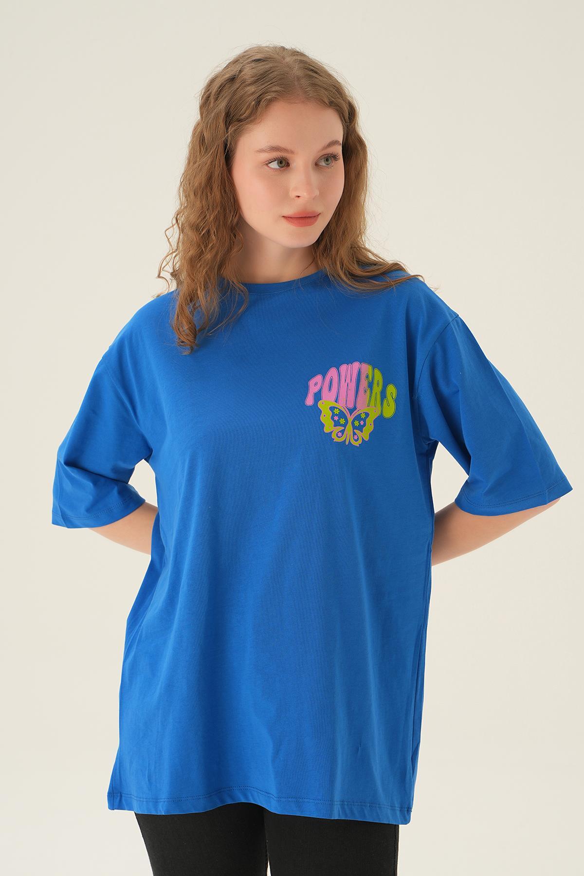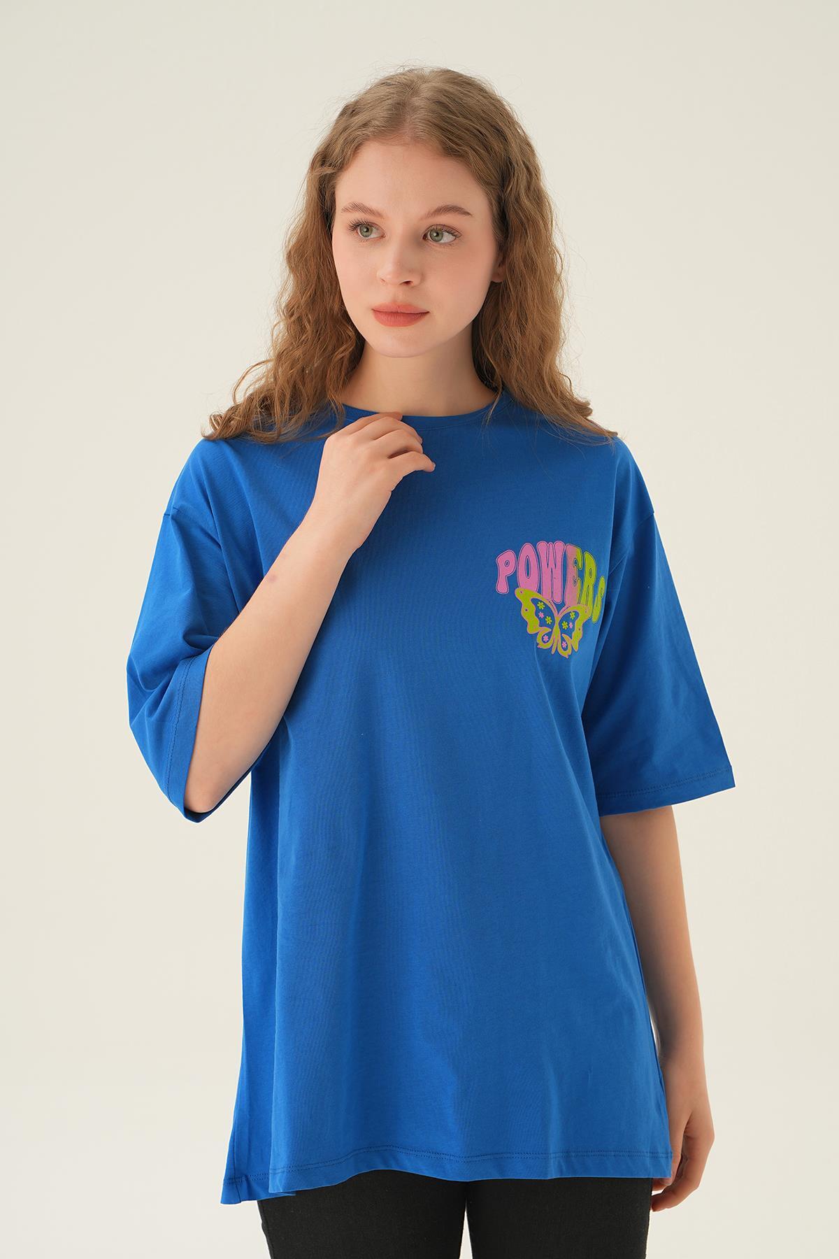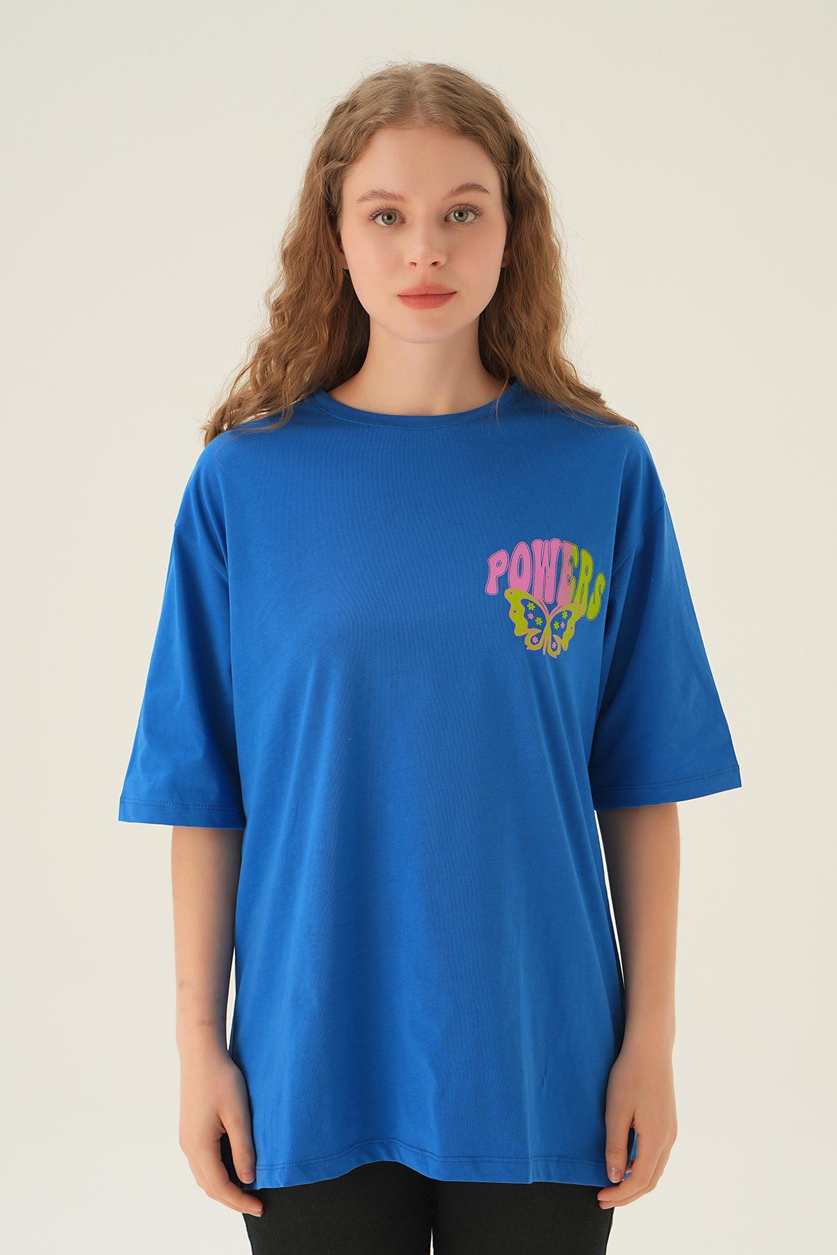 Mavi Powers Kelebek Baskı Oversize Tişört 1700