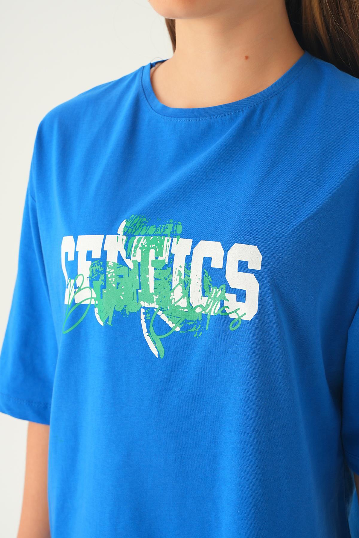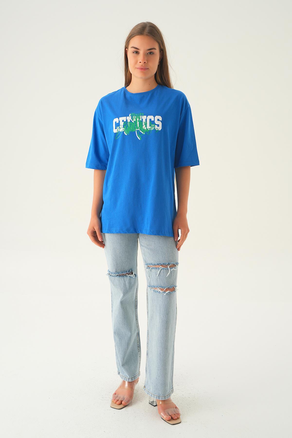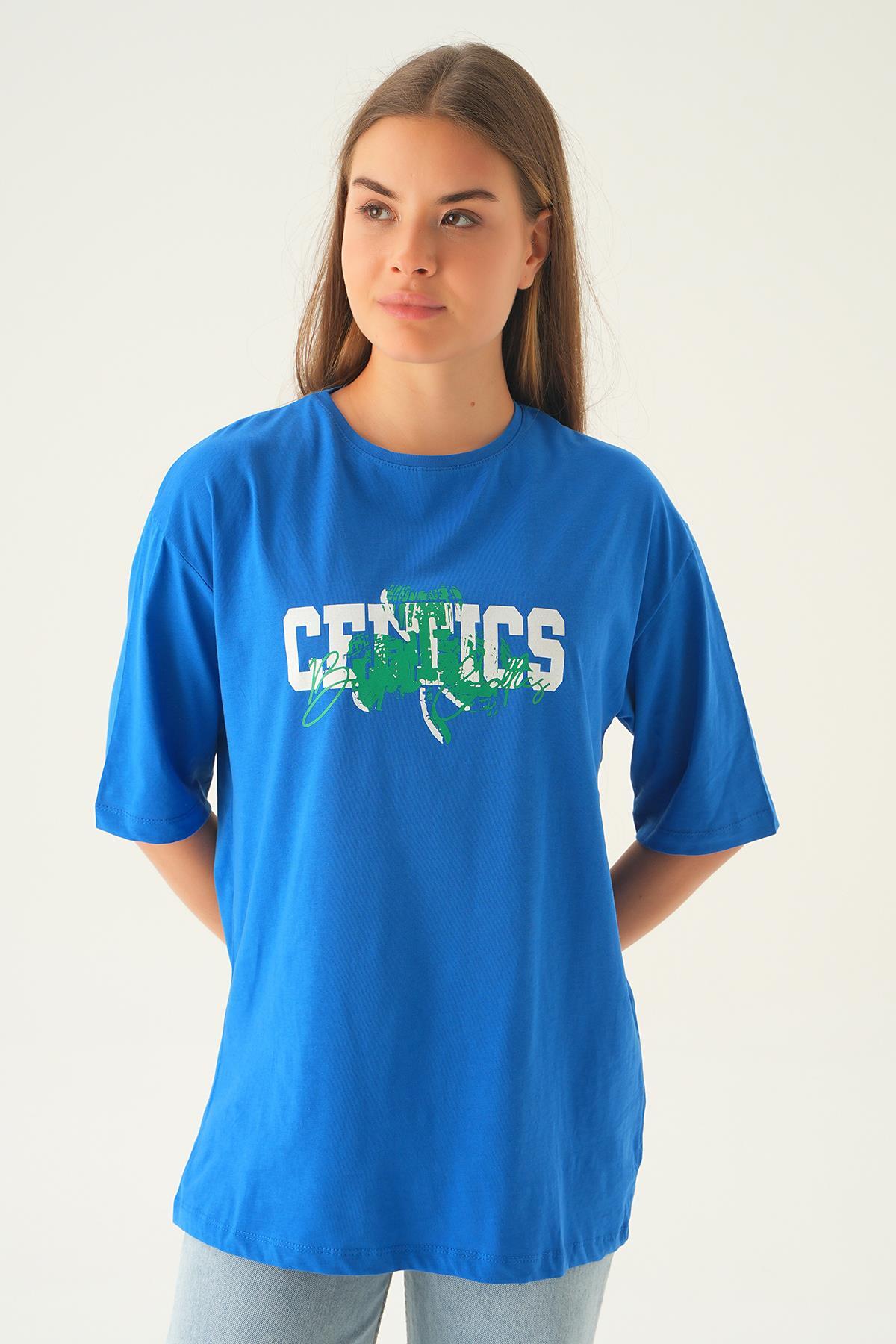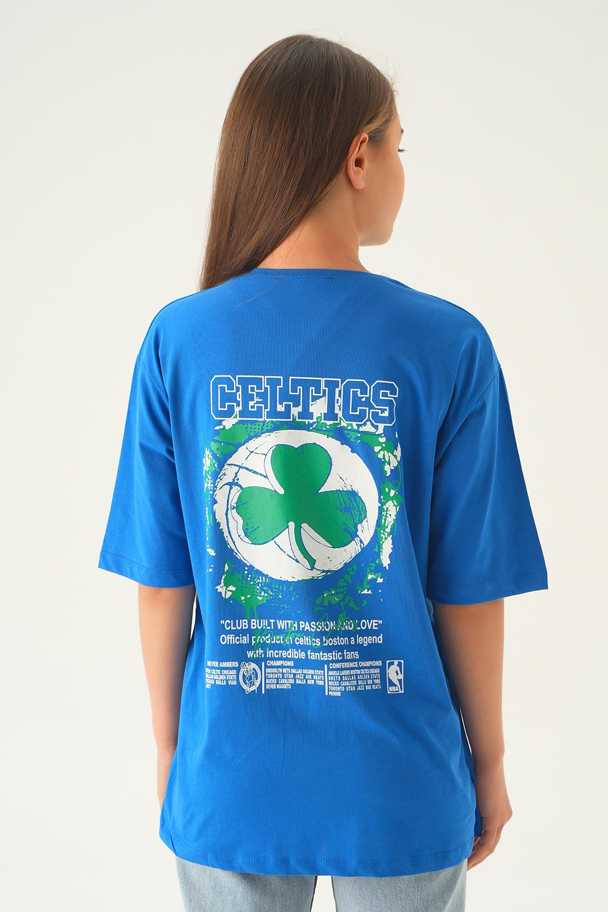 Mavi Celtıcs Baskı Oversize Tişört 1701