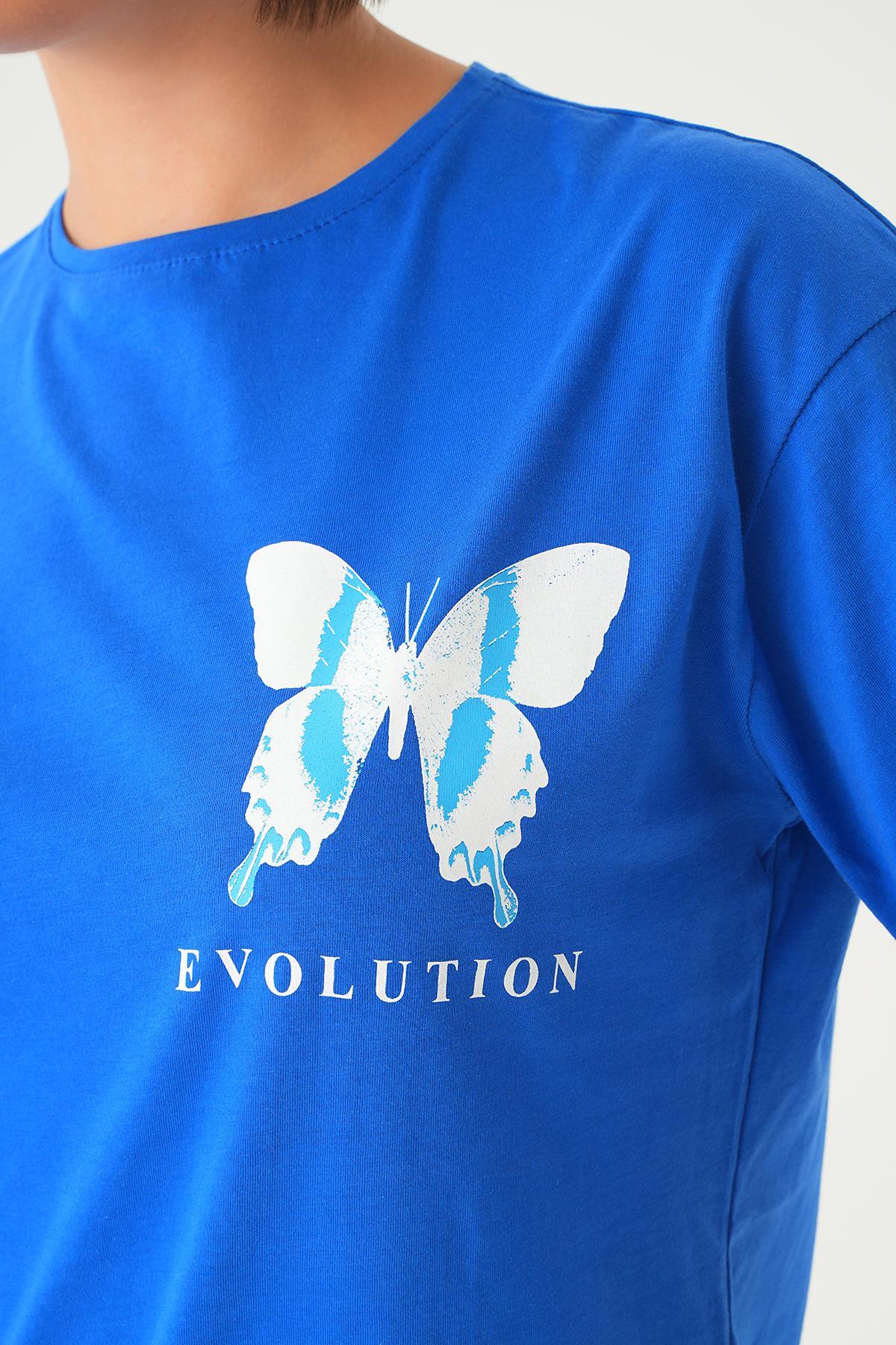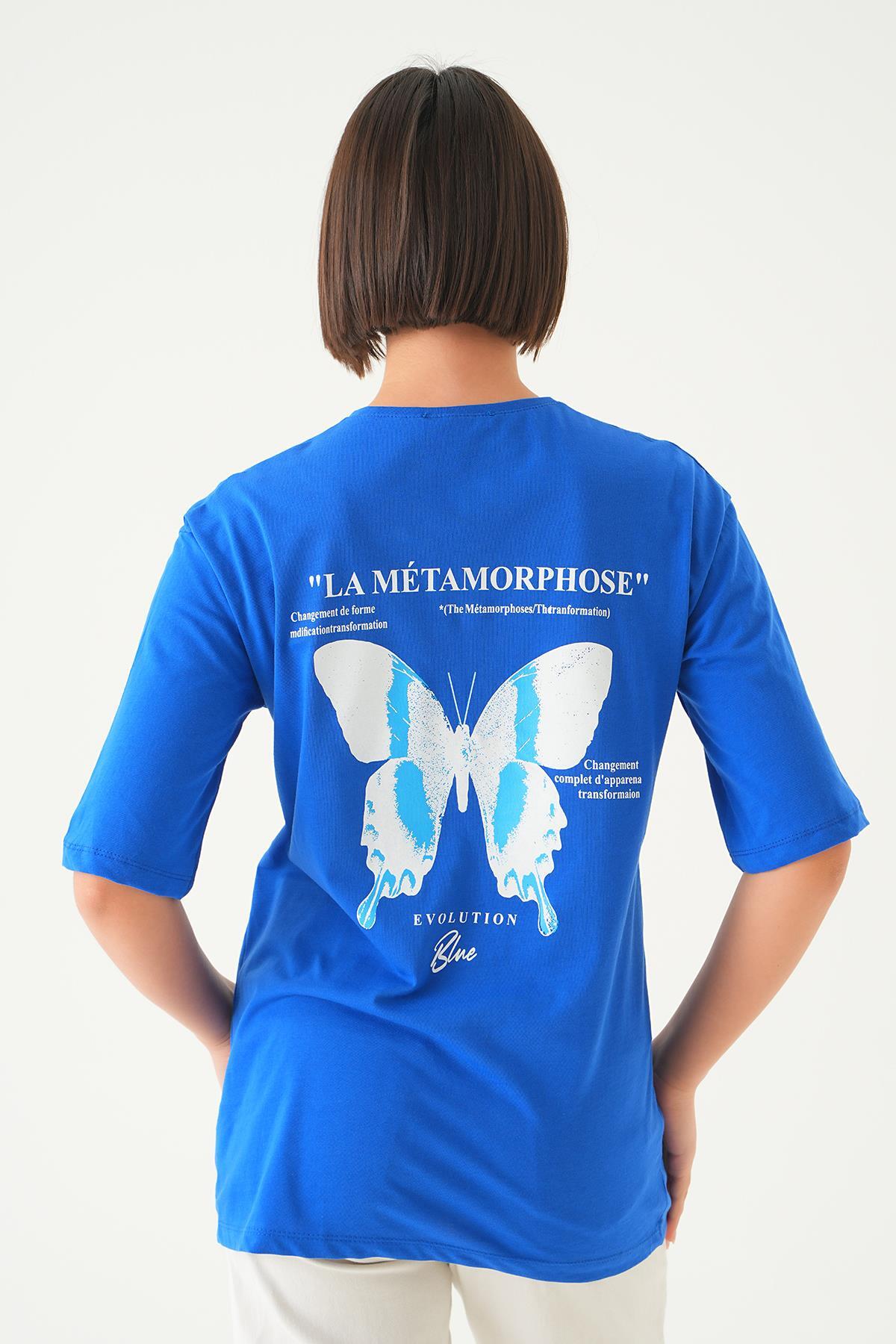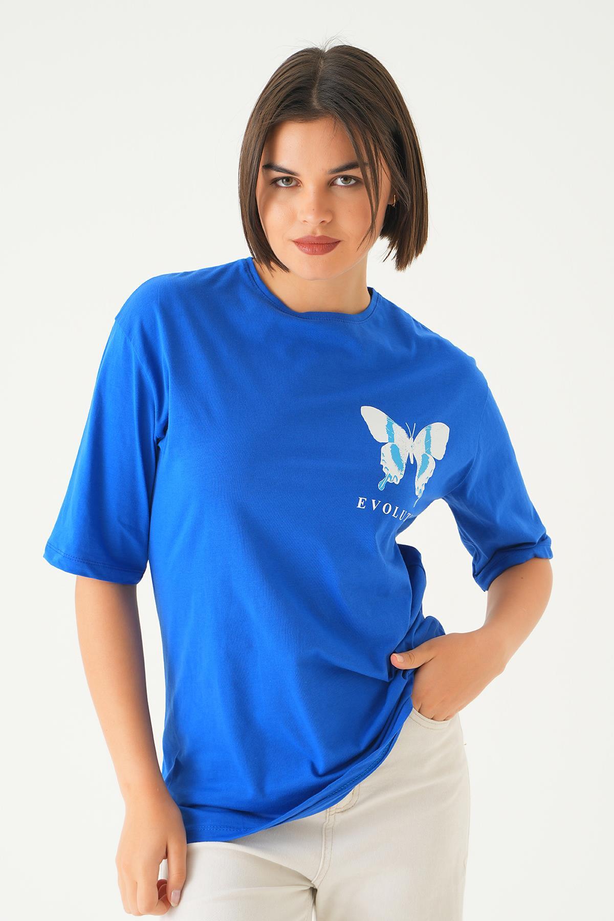 Mavi Kelebek Baskılı Oversize Tişört 1708