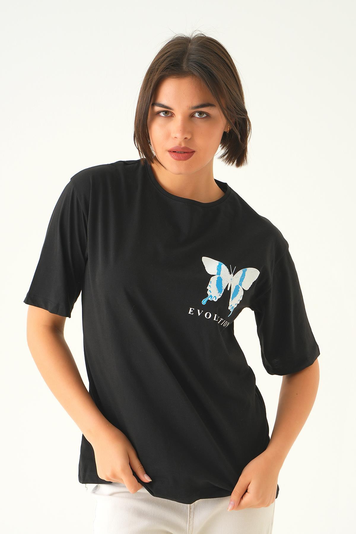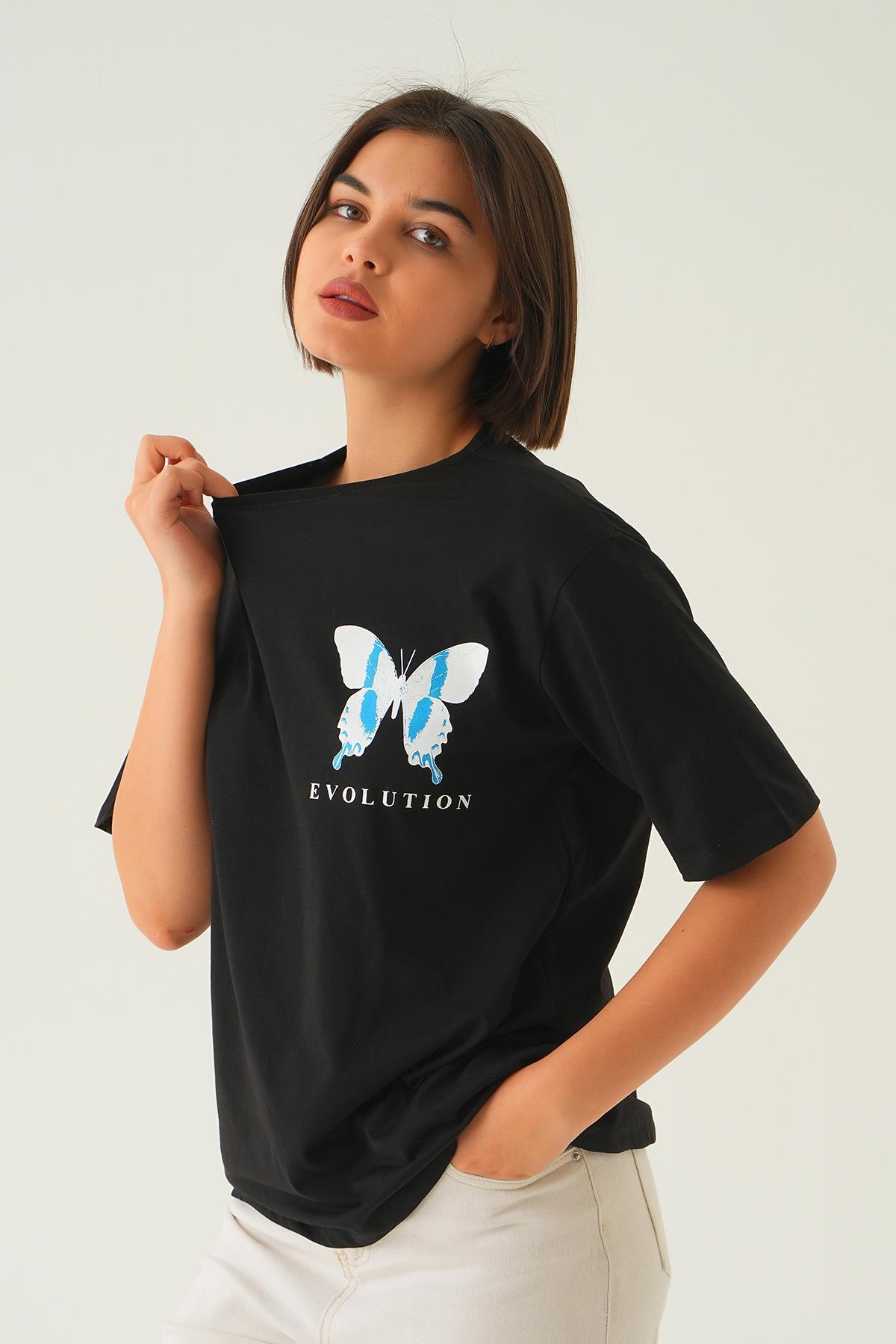 Siyah Kelebek Baskılı Oversize Tişört 1708