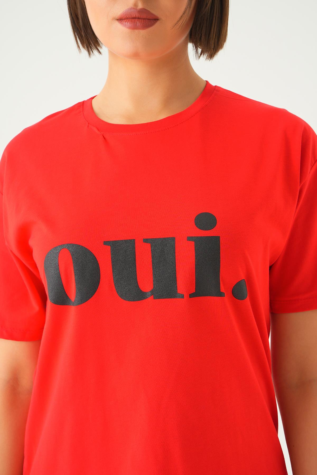 Kırmızı Oui Baskı Oversize Tişört 1714