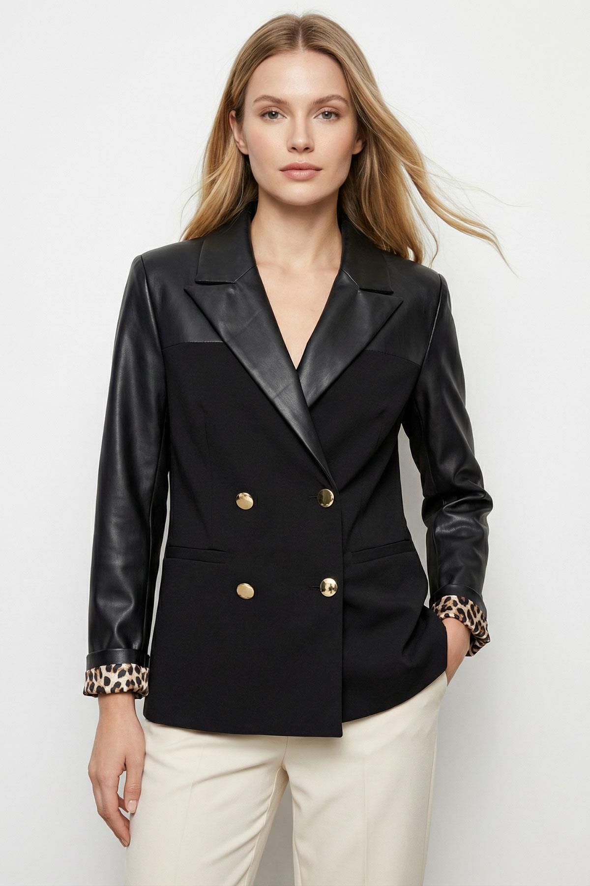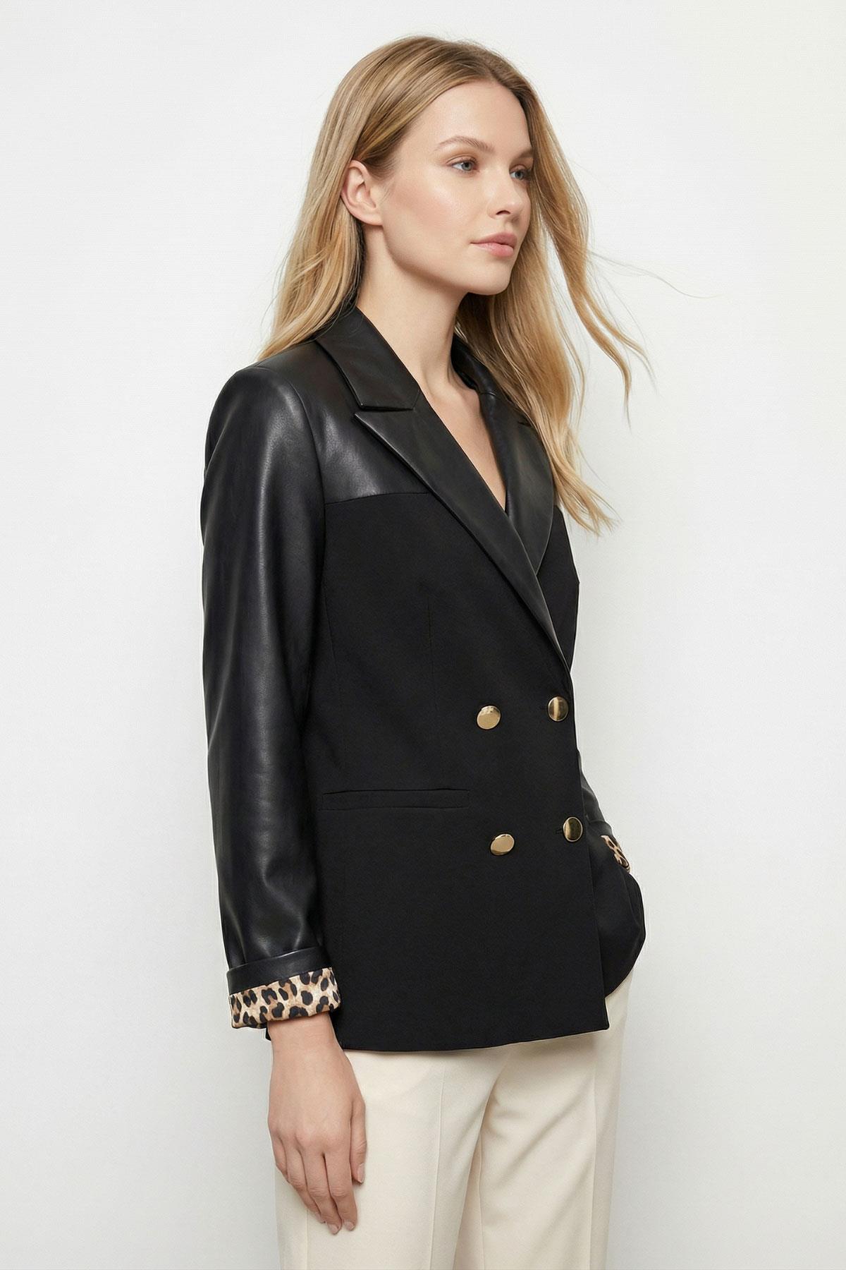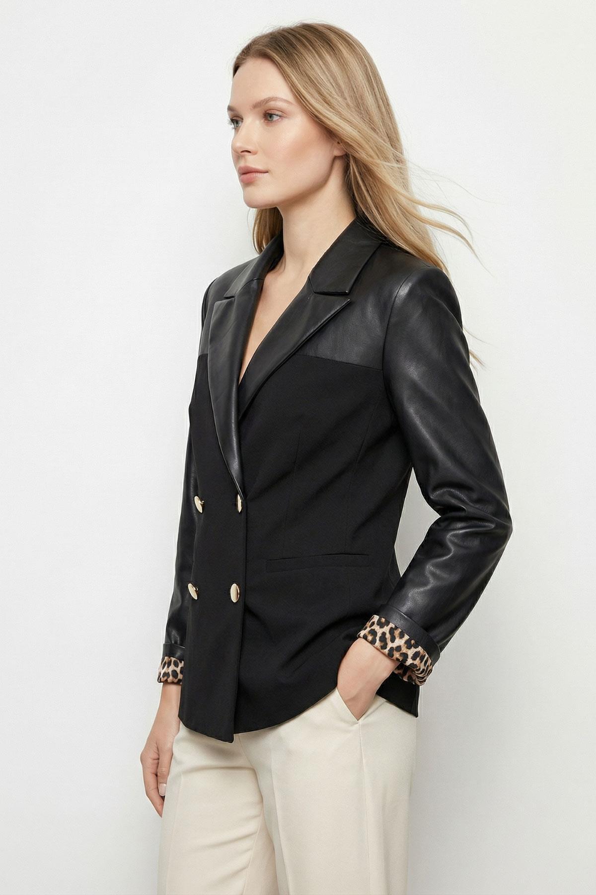 1883 Poliviskon Garnili Kruvaze Yaka Deri Ceket Siyah