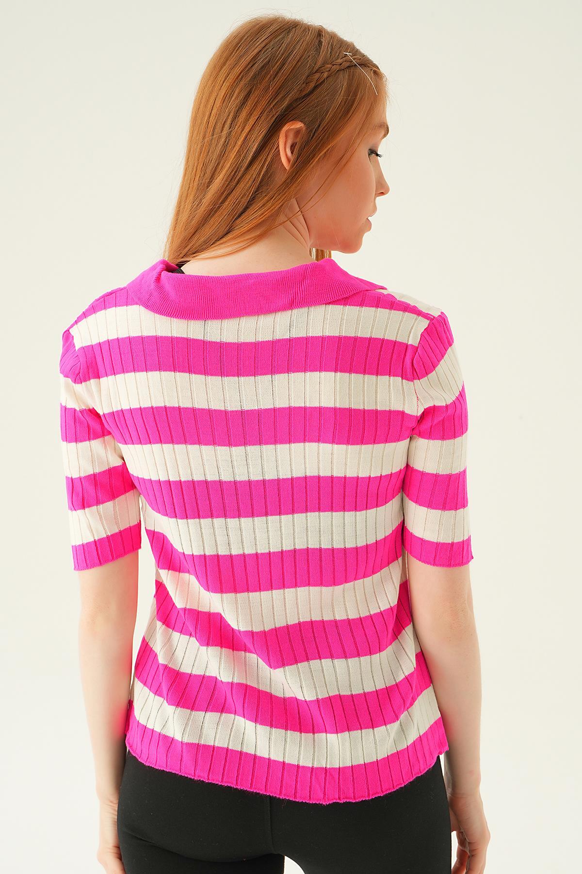 Fuşya Polo Yaka Çizgili Tişört 1900