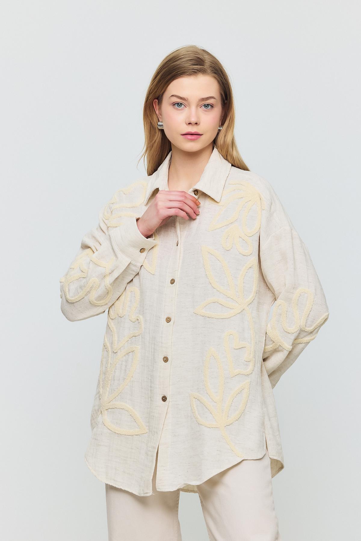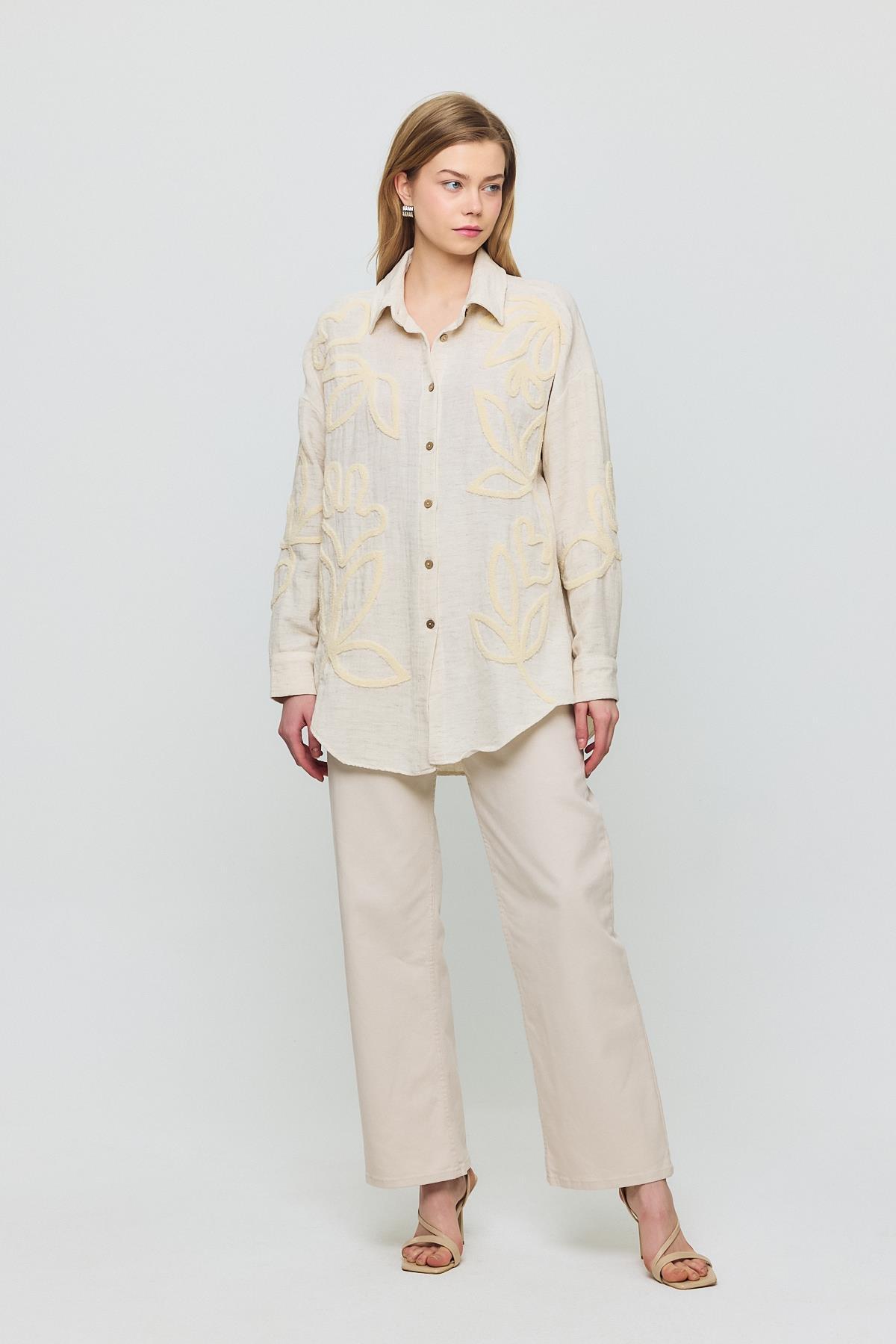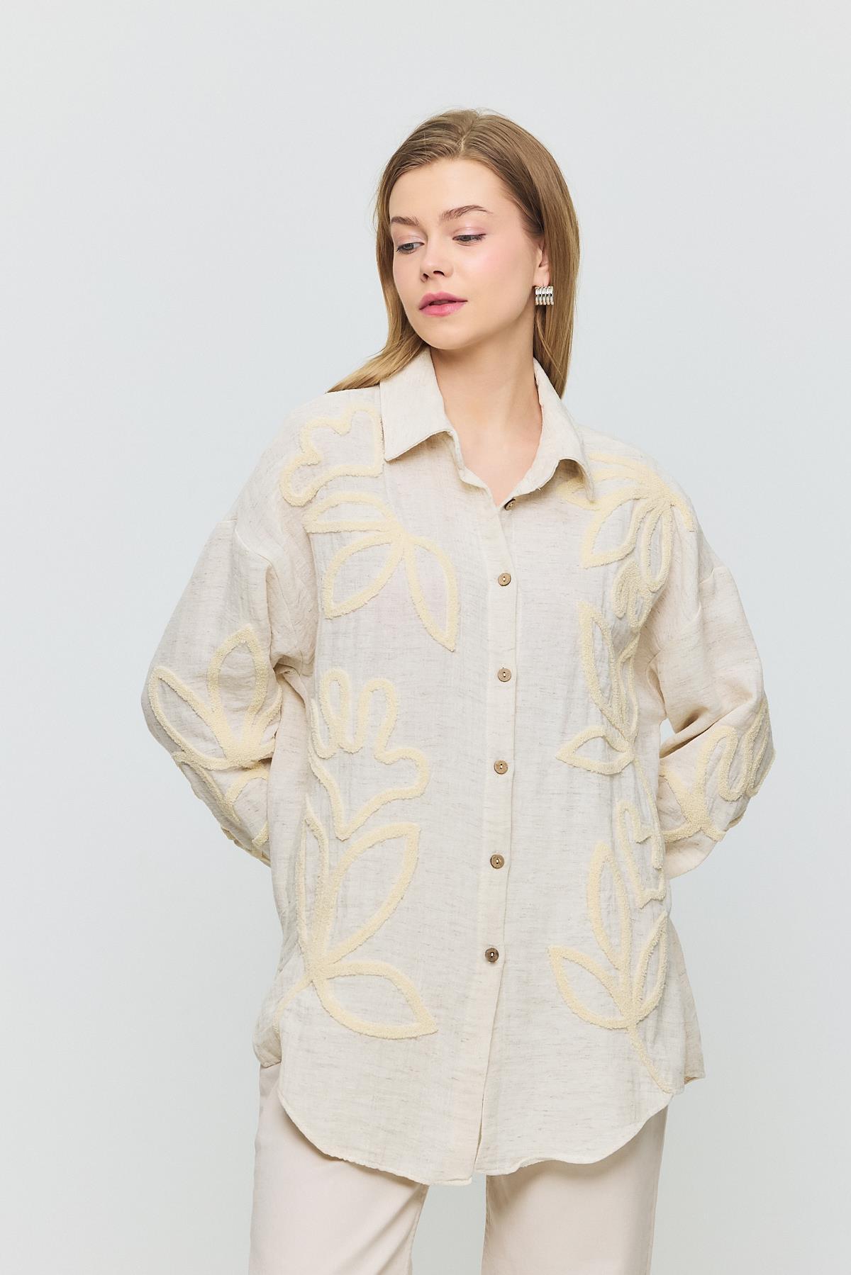 Bej Önü Yaprak Nakışlı Gömlek 2004