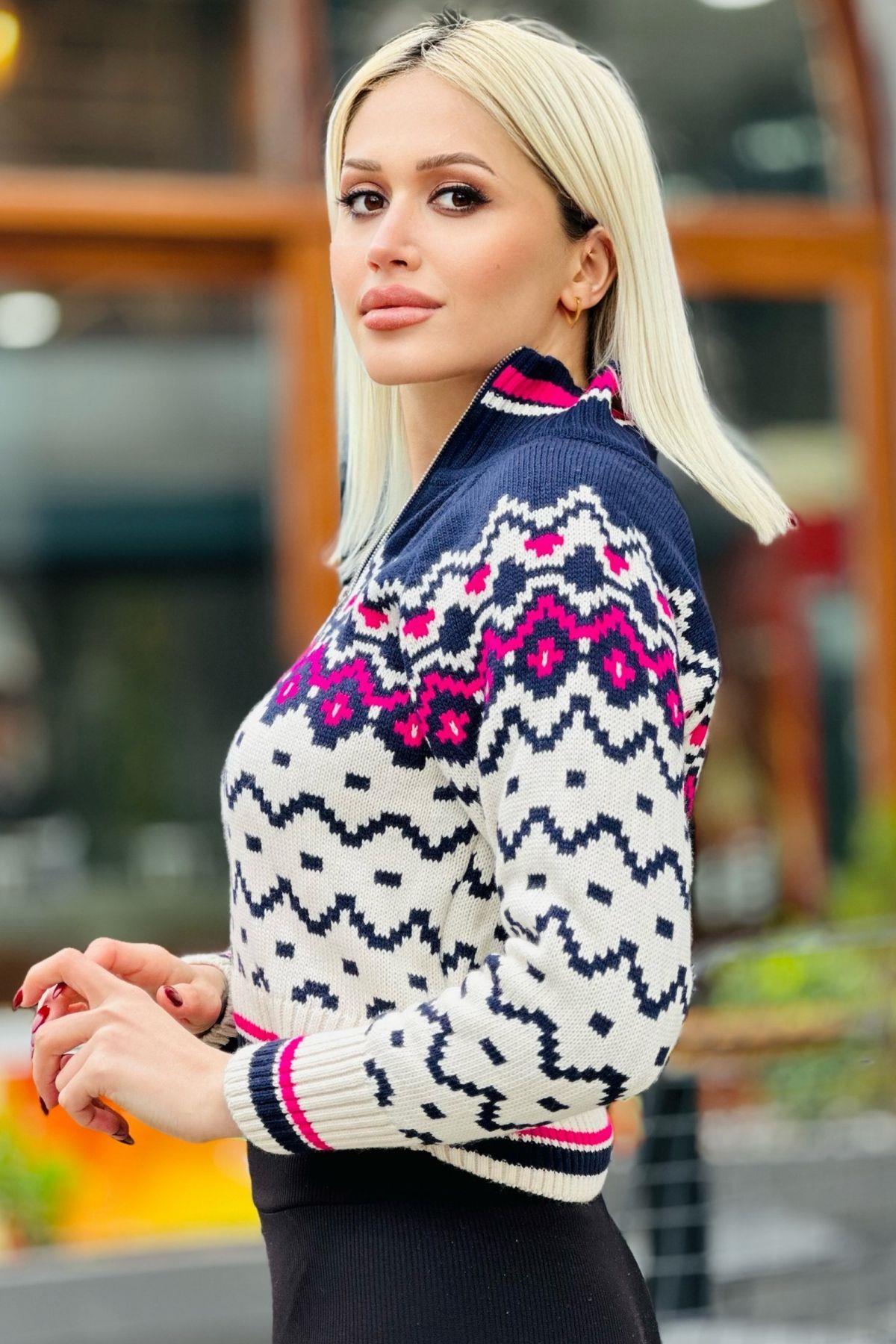 Krem Yaka Fermuar Desenli Kazak 20142